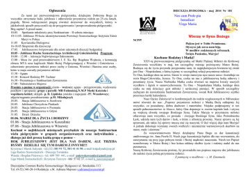 Ogłoszenia Za nami już pierwszomajowa pielgrzymka, dziękujmy Dobremu Bogu za wszystkie otrzymane łaski, jubileusz i odnowienie przymierza rodzin po 25-ciu latach, pogodę. Słowa wdzięczności pragnę również skierować do wszystkich, którzy w jakikolwiek sposób przyczynili się do przygotowania i przeprowadzenia pielgrzymki. Bóg zapłać! A przed nami: 10.05. Spotkanie młodzieży przy Sanktuarium – II sobota miesiąca 10-11.05. Jubileusz 50-lecia ukonstytuowania Prowincji Szensztackiego Instytutu Sióstr Maryi w Polsce 11.05 Kawiarenka Dialogowa 16-18.05 Skupienie dla dziewcząt 17.05. Jubileuszowe świętowanie dla sióstr zakonnych diecezji bydgoskiej 18.05 – Jubileusz Ruchu Szensztackiego Archidiecezji Gnieźnieńskiej Program: 10.00 – 12.00 – Adoracja Najświętszego Sakramentu 12.00 - Msza św. pod przewodnictwem J. E. Ks. Bp. Bogdana Wojtusia, z koronacją obrazu MTA oraz kapliczek Matki Bożej Pielgrzymującej z Wrześni i Gniewkowa – odnowienie przymierza miłości przez osoby z Gniezna, Wrześni i Barcina oraz osoby, które w maju zawarły przymierze miłości 13.30 - Agapa 15.30 - Koncert Rodziny PP. Techner 16.30 - Prezentacja o Sanktuarium Zawierzenia 17.00 - Nabożeństwo Majowe Prosimy o pomoc w organizacji: ciasto – wszyscy; agapa – przygotowanie, wydawanie posiłków i sprzątanie: grupy z parafii: MB Fatimskiej,N.M.P Matki Kościoła i wspólnota kobiet; sklepik- p. D. Lipińska ;stoisko z napojami -PP. Wesołowscy; zdjęcia/nagranie przedstawienia- p.M. Mikołajczyk 18.05. Stacja Jubileuszowa w Józefowie 24.05. Jubileusz Chorych na Piaskach 24.05. Stacja Jubileuszowa w Poznaniu 26.05. Stacja Jubileuszowa w Gdyni 31.05. Dzień Dziecka 01.06. MARSZ DLA ŻYCIA I RODZINY 01.06 - Stacja Jubileuszowa w Koszalinie 07.06 - Stacja Jubileuszowa w Winowie Kochani w najbliższych miesiącach przybędzie do naszego Sanktuarium wielu pielgrzymów w grupach zorganizowanych oraz indywidualnie , dlatego już dziś proszę każdą grupę o pomoc – ROK JUBILEUSZOWY JEST DLA NAS DAREM, ALE TRZEBA BYŚMY DZIELILI SIĘ TYM DAREM Z INNYMI!!! Krystyna i Marek Jedynak - tel.(52) 381 91 72, 501 41 41 90, e-mail [email protected] Liga Rodzin Szensztackich - Diecezja Toruńska: Wanda i Bogdan Pniewscy:- tel. 609 789 441, e-mail [email protected] Liga Matek Szensztackich:: Krystyna Turczyn - 661 57 02 37, e-mail [email protected] ___________________________________________________________________________________________________________________________________________________________ Diecezjalne Centrum Ruchu Szensztackiego: Bydgoszcz ul. Smukalska 113 Tel. (0-52) 340-20-14 Redakcja: s.M. Adriana Majnusz [email protected] DIECEZJA BYDGOSKA – maj 2014 Nr 181 Nos cum Prole pia benedicat Virgo Maria Wierzę w Syna Bożego NCPP! Piękno jest w Tobie Promienna. Słyszysz jak serca nam biją. W modlitw codziennych refrenach. Święta Panienko, Maryjo! Kochane Rodziny i Matki! XXV-tą pierwszomajową pielgrzymką od Matki Pięknej Miłości do Królowej Zawierzenia weszliśmy w maj, ten szczególny miesiąc poświęcony Matce Bożej. Budząca się do życia przyroda przypomina nam, że najpiękniejszym kwiatem tej ziemi jest Ona – Niepokalana, z którą żyjemy w szczególnej relacji przymierza miłości. To Ona, każdego dnia na nowo, bierze w swoje matczyne ręce nasze serca i kształtuje na wzór Boga-Człowieka, Jezusa. To Ona, czeka na nas z jubileuszową łaską odnowy i przemiany życia. Nasza Niebieska Matka czeka również na majowe kwiaty naszych wysiłków i dążeń w samowychowaniu. To Ona – Niepokalana Matka, każdego dnia czeka na mój dziecięcy gest miłości i serdecznej pamięci. W sposób szczególny zachęcam do nawiedzenia Sanktuarium Zawierzenia, wszak Rok Jubileuszowy szybko przerzuca kartki kalendarza. Nasz Ojciec Założyciel w konferencjach do rodzin wygłoszonych w Milwaukee mówi również do nas: „Poprzez przymierze miłości z Matką Bożą oddajemy Jej wszystko, co posiadamy, dobra duchowe i materialne. Niejako podpisujemy w ten sposób pełnomocnictwo in blanco, który Ona deponuje w swoim kapitale łask i używa na większą chwałę swojego Boskiego Syna. Także Maryja w przymierzu miłości ofiarowuje nam wszystko, co posiada - swojego Boskiego Syna. Jako Pośredniczka Łask, udziela nam tych darów i łask, o które z ufnością prosimy. Nasze sprawy są Jej sprawami, ale także Jej sprawy muszą stać się naszymi. O ileż więcej daje nam Maryja! A jednak dokonuje wymiany swoich wielkich i niezmiernie wartościowych skarbów na nasze, małe i skromne.” Za wstawiennictwem Maryi dziękujmy Panu Bogu za dar kanonizacji umiłowanego św. Jana Pawła II. Niech jego kanonizacja będzie dla nas wezwaniem, do zatrzymania się przy jego pełnym troski i Bożej mądrości nauczaniu. Niech ten Papież rozmiłowany w Matce Bożej i bez końca oddany służbie życiu i rodziny nadal do nas przemawia. Naszą Królową Zawierzenia prośmy, by prowadziła nas poprzez majowe dni jubileuszu do radości życia pełnią przymierza miłości. Z pamięcią w modlitwie – s. M. Emanuela Twoje przymierze - naszą misją „Maryjo, Szensztat dziękuje!”, bo jest za co dziękować… Tegoroczna 1-majowa pielgrzymka była wyjątkowa! Wyjątkowa, bo miała miejsce w Roku Jubileuszowym, w którym świętujemy 100-lecie Ruchu Szensztackiego. Wyjątkowa – bo była to już 25. piesza pielgrzymka z Sanktuarium Matki Bożej Pięknej Miłości na bydgoskie Piaski. Wyjątkowa – bo w 50. rocznicę ukonstytuowania polskiej Prowincji Szensztackiego Instytutu Sióstr Maryi i w 25. rocznicę zawarcia przymierza miłości przez pierwszą grupę rodzin. Wyjątkowa – bo przepełniona radością kanonizacji Papieża Jana XXIII i naszego Umiłowanego Ojca Świętego Jana Pawła II. Wyjątkowa, bo pełna dziękczynienia Bogu za „wielkie rzeczy, które Pan uczynił” przez Maryję w życiu osobistym, rodzinnym i wspólnotowym każdego z nas… Inicjatywa pielgrzymo
