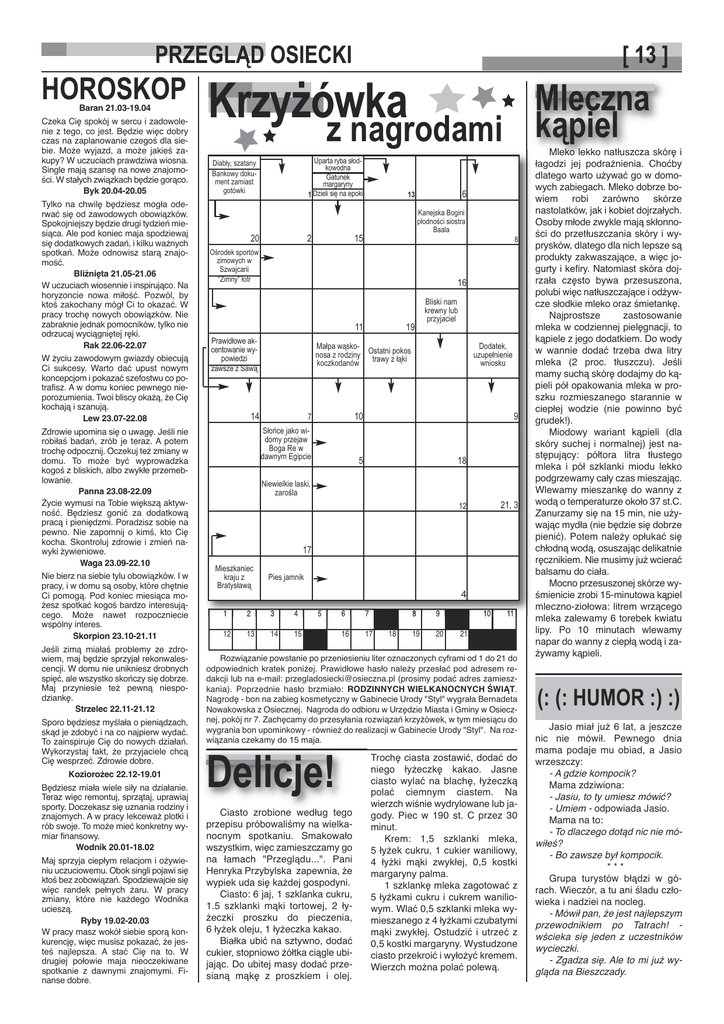 PRZEGLĄD OSIECKI HOROSKOP Baran 21.03-19.04 Czeka Cię spokój w sercu i zadowolenie z tego, co jest. Będzie więc dobry czas na zaplanowanie czegoś dla siebie. Może wyjazd, a może jakieś zakupy? W uczuciach prawdziwa wiosna. Single mają szansę na nowe znajomości. W stałych związkach będzie gorąco. Byk 20.04-20.05 Tylko na chwilę będziesz mogła oderwać się od zawodowych obowiązków. Spokojniejszy będzie drugi tydzień miesiąca. Ale pod koniec maja spodziewaj się dodatkowych zadań, i kilku ważnych spotkań. Może odnowisz starą znajomość. Bliźnięta 21.05-21.06 W uczuciach wiosennie i inspirująco. Na horyzoncie nowa miłość. Pozwól, by ktoś zakochany mógł Ci to okazać. W pracy trochę nowych obowiązków. Nie zabraknie jednak pomocników, tylko nie odrzucaj wyciągniętej ręki. Rak 22.06-22.07 W życiu zawodowym gwiazdy obiecują Ci sukcesy. Warto dać upust nowym koncepcjom i pokazać szefostwu co potrafisz. A w domu koniec pewnego nieporozumienia. Twoi bliscy okażą, że Cię kochają i szanują. Lew 23.07-22.08 Zdrowie upomina się o uwagę. Jeśli nie robiłaś badań, zrób je teraz. A potem trochę odpocznij. Oczekuj też zmiany w domu. To może być wyprowadzka kogoś z bliskich, albo zwykłe przemeblowanie. Panna 23.08-22.09 Życie wymusi na Tobie większą aktywność. Będziesz gonić za dodatkową pracą i pieniędzmi. Poradzisz sobie na pewno. Nie zapomnij o kimś, kto Cię kocha. Skontroluj zdrowie i zmień nawyki żywieniowe. Waga 23.09-22.10 Nie bierz na siebie tylu obowiązków. I w pracy, i w domu są osoby, które chętnie Ci pomogą. Pod koniec miesiąca możesz spotkać kogoś bardzo interesującego. Może nawet rozpoczniecie wspólny interes. Skorpion 23.10-21.11 Jeśli zimą miałaś problemy ze zdrowiem, maj będzie sprzyjał rekonwalescencji. W domu nie unikniesz drobnych spięć, ale wszystko skończy się dobrze. Maj przyniesie też pewną niespodziankę. Strzelec 22.11-21.12 Sporo będziesz myślała o pieniądzach, skąd je zdobyć i na co najpierw wydać. To zainspiruje Cię do nowych działań. Wykorzystaj fakt, że przyjaciele chcą Cię wesprzeć. Zdrowie dobre. Koziorożec 22.12-19.01 Będziesz miała wiele siły na działanie. Teraz więc remontuj, sprzątaj, uprawiaj sporty. Doczekasz się uznania rodziny i znajomych. A w pracy lekceważ plotki i rób swoje. To może mieć konkretny wymiar finansowy. Wodnik 20.01-18.02 Maj sprzyja ciepłym relacjom i ożywieniu uczuciowemu. Obok singli pojawi się ktoś bez zobowiązań. Spodziewajcie się więc randek pełnych żaru. W pracy zmiany, które nie każdego Wodnika ucieszą. Ryby 19.02-20.03 W pracy masz wokół siebie sporą konkurencję, więc musisz pokazać, że jesteś najlepsza. A stać Cię na to. W drugiej połowie maja nieoczekiwane spotkanie z dawnymi znajomymi. Finanse dobre. [ 13 ] KrzyŜówka z nagrodami Uparta ryba słodkowodna Gatunek margaryny 1 Dzieli się na epoki Diabły, szatany Bankowy dokument zamiast gotówki 20 2 Ośrodek sportów zimowych w Szwajcarii “Zimny” łotr 6 13 Kanejska Bogini płodności siostra Baala 15 8 16 11 Prawidłowe akcentowanie wypowiedzi zawsze z Sawą 14 Mleczna kąpiel 19 Bliski nam krewny lub przyjaciel Małpa wąsko- Ostatni pokos nosa z rodziny trawy z łąki koczkodanów Dodatek, uzupełnienie wniosku 10 7 Słońce jako widomy przejaw Boga Re w dawnym Egipcie 9 5 18 Niewielkie laski, zarośla 21, 3 12 17 Mieszkaniec kraju z Bratysławą Pies jamnik 1 2 3 4 12 13 14 15 5 6 7 16 17 18 8 9 19 20 4 10 11 21 Rozwiązanie powstanie po przeniesieniu liter oznaczonych cyframi od 1 do 21 do odpowiednich kratek poniżej. Prawidłowe hasło należy przesłać pod adresem redakcji lub na e-mail: [email protected] (prosimy podać adres zamieszkania). Poprzednie hasło brzmiało: RODZINNYCH WIELKANOCNYCH ŚWIĄT. Nagrodę - bon na zabieg kosmetyczny w Gabinecie Urody "Styl" wygrała Bernadeta Nowakowska z Osiecznej. Nagroda do odbioru w Urzędzie Miasta i Gminy w Osiecznej, pokój nr 7. Zachęcamy do przesyłania rozwiązań krzyżówek, w tym miesiącu do wygrania bon upominkowy - również do realizacji w Gabinecie Urody "Styl". Na rozwiązania czekamy do 15 maja. Delicje! Ciasto zrobione według tego przepisu próbowaliśmy na wielkanocnym spotkaniu. Smakowało wszystkim, więc zamieszczamy go na łamach "Przeglądu...". Pani Henryka Przybylska zapewnia, że wypiek uda się każdej gospodyni. Ciasto: 6 jaj, 1 szklanka cukru, 1.5 szklanki mąki tortowej, 2 łyżeczki proszku do pieczenia, 6 łyżek oleju, 1 łyżeczka kakao. Białka ubić na sztywno, dodać cukier, stopniowo żółtka ciągle ubijając. Do ubitej masy dodać przesianą mąkę z proszkiem i olej. Trochę ciasta zostawić, dodać do niego łyżeczkę kakao. Jasne ciasto wylać na blachę, łyżeczką polać ciemnym ciastem. Na wierzch wiśnie wydrylowane lub jagody. Piec w 190 st. C przez 30 minut. Krem: 1,5 szklanki mleka, 5 łyżek cukru, 1 cukier waniliowy, 4 łyżki mąki zwykłej, 0,5 kostki margaryny palma. 1 szklankę mleka zagotować z 5 łyżkami cukru i cukrem waniliowym. Wlać 0,5 szklanki mleka wymieszanego z 4 łyżkami czubatymi mąki zwykłej. Ostudzić i utrzeć z 0,5 kostki margaryny. Wystudzone ciasto przekroić i wyłożyć kremem. Wierzch można polać polewą. Mleko lekko natłuszcza skórę i łagodzi jej podrażnienia. Choćby dlatego warto używać go w domowych zabiegach. Mleko dobrze bowiem robi zarówno skórze nastolatków, jak i kobiet dojrzałych. Osoby młode zwykle mają skłonności do przetłuszczania skóry i wyprysków, dlatego dla nich lepsze są produkty zakwaszające, a więc jogurty i kefiry. Natomiast skóra dojrzała często bywa przesuszona, polubi więc natłuszczające i odżywcze słodkie mleko oraz śmietankę. Najprostsze zastosowanie mleka w codziennej pielęgnacji, to kąpiele z jego dodatkiem. Do wody w wannie dodać trzeba dwa litry mleka (2 proc. tłuszczu). Jeśli mamy suchą skórę dodajmy do kąpieli pół o