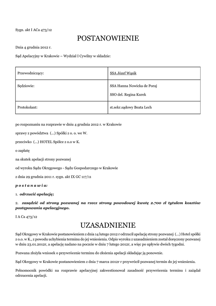 Sygn. akt I ACa 473/12 POSTANOWIENIE Dnia 4 grudnia 2012 r. Sąd Apelacyjny w Krakowie – Wydział I Cywilny w składzie: Przewodniczący: SSA Józef Wąsik Sędziowie: SSA Hanna Nowicka de Poraj SSO del. Regina Kurek Protokolant: st.sekr.sądowy Beata Lech po rozpoznaniu na rozprawie w dniu 4 grudnia 2012 r. w Krakowie sprawy z powództwa (...) Spółki z o. o. we W. przeciwko (...) HOTEL Spółce z o.o w K. o zapłatę na skutek apelacji strony pozwanej od wyroku Sądu Okręgowego - Sądu Gospodarczego w Krakowie z dnia 29 grudnia 2011 r. sygn. akt IX GC 117/11 p o s t a n a w i a: 1. odrzucić apelację; 2. zasądzić od strony pozwanej na rzecz strony powodowej kwotę 2.700 zł tytułem kosztów postępowania apelacyjnego. I A Ca 473/12 UZASADNIENIE Sąd Okręgowy w Krakowie postanowieniem z dnia 14 lutego 2012 r odrzucił apelację strony pozwanej (...) Hotel spółki z o.o. w K., z powodu uchybienia terminu do jej wniesienia. Odpis wyroku z uzasadnieniem został doręczony pozwanej w dniu 23.01.2012r, a apelację nadano na poczcie w dniu 7 lutego 2012r, a więc po upływie dwóch tygodni. Pozwana złożyła wniosek o przywrócenie terminu do złożenia apelacji składając ją ponownie. Sąd Okręgowy w Krakowie postanowieniem z dnia 7 marca 2012r r przywrócił pozwanej termin do jej wniesienia. Pełnomocnik powódki na rozprawie apelacyjnej zakwestionował zasadność przywrócenia terminu i zażądał odrzucenia apelacji. W odpowiedzi na apelacji strona powodowa w pierwszym rzędzie domagała się odrzucenia apelacji kwestionując zasadność przywrócenia terminu a także terminowość złożenia wniosku. Sąd Apelacyjny uznał, że brak było podstaw do przywrócenia stronie pozwanej terminu do wniesienia apelacji. Jako usprawiedliwienie niezachowania terminu do wniesienia apelacji strona pozwana podała konieczność wyjazdu zarządu - w ostatnim dniu do wniesienia apelacji - do K. w związku z ujawnieniem się w hotelu przy ul. (...) szeregu wad przy pracach instalacyjnych dotyczących klimatyzacji i wentylacji. Z tego powodu w dniu 6 lutego 2012r zarząd przebywał w K.. Na dowód istnienia awarii instalacji pozwany przedłożył odpis pisma jakie zostało wysłane do wykonawcy instalacji z 8.02.2012r, a także odpis protokołu z wypadku przy pracy. Przede wszystkim zaproponowane dowody nie uprawdopodobniają w sposób wystarczający, że faktycznie wizyta zarządu w dniu 6.02.2012r w K. była konieczna, a w każdym razie, iż wizyta ta była przeszkodą w wysłaniu apelacji. Wypadek przy pracy na który powołuje się pozwana miał miejsce w dniu 11 lutego 2012r. Również pismo do wykonawcy robót instalacyjnych pochodzi z daty po 6.02.2012r i nie wynika z niego konieczność – ani nawet pilna potrzeba – przebywania zarządu, akurat w dniu 6.02.2012r w K.. W szczególności, nie wynika z niego, aby w tym dniu odbyło się jakieś ważne spotkanie z wykonawcą. Wszak korespondencja w sprawie usterek w funkcjonowaniu klimatyzacji trwała co najmniej od 16.01.2012r. Pracownik serwisowy był w Hotelu w dniu 20.01.2012r, a pismem z dnia 8.02.2012r pozwana wyznaczyła wykonawcy kolejny termin do usunięcia usterek. Zgodnie z art. 168 § 1 k.p.c, przywrócenie terminu do dokonania spóźnionej czynności procesowej może nastąpić wówczas, jeżeli strona nie dokonała w terminie czynności procesowej bez swojej winy. Brak winy w dokonaniu czynności procesowej w terminie będzie zachodził wówczas, gdy jej dokonaniu w terminie przeszkodziła okoliczność, której, w danych okolicznościach, nie można było przezwyciężyć przy zachowaniu zwykłej staranności wymaganej od strony należycie dbającej o swoje sprawy bądź jej pełnomocnika przy dokonywaniu tego rodzaju czynności (por. postanowienia Sądu Najwyższego: z dnia 14 stycznia 1972 r., III CRN 448/71, OSP 1972, nr 7, poz. 14, z dnia 10 stycznia 2007 r., I CZ 108/06, Lex nr 258547). Obiektywna niezgodność zachowania z obowiązkiem starannego działania połączona z negatywną oceną takiego postępowania, oznacza zawinienie w uchybieniu terminu (por. postanowienie Sądu Najwyższego z dnia 5 października 2011 r., IV CZ 64/11, nie publ.). Wina może przybrać postać chociażby niedbalstwa (por. postanowienie Sądu Najwyższego z dnia 9 sierpnia 1974 r., II CZ 149/74, OSPiKA 1975, nr 12, poz. 30). Przedmiotowa kontrola była dopuszczalna, gdyż sąd drugiej instancji bada dopuszczalność apelacji pod względem przedmiotowym, podmiotowym oraz zachowania przepisanego terminu i wymagań formalnych apelacji, a ponadto jeszcze kontroluje orzeczenia wydane przez sąd I instancji już w toku postępowania międzyinstancyjnego. Chodzi tu zwłaszcza o orzeczenia dotyczące przywrócenia uchybionego terminu do wniesienia apelacji (por. uchw. składu 7 sędziów SN z 30 stycznia 1968 r., III CZP 77/67, OSNCP 1968, nr 12, poz. 202). W razie stwierdzenia braku podstaw do przywrócenia terminu do wniesienia apelacji, czy do złożenia wniosku o sporządzenie uzasadnienia wyroku, apelacja podlega odrzuceniu. Na tej podstawie odrzucono apelację powoda na podstawie art. 373 k.p.c. , a o kosztach orzeczono w oparciu o art. 98 k.p.c. w związku z art. 108 § 1 k.p.c.