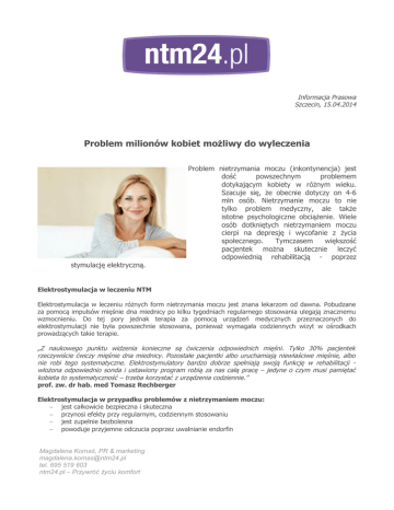 Informacja Prasowa Szczecin, 15.04.2014 Problem milionów kobiet możliwy do wyleczenia Problem nietrzymania moczu (inkontynencja) jest dość powszechnym problemem dotykającym kobiety w różnym wieku. Szacuje się, że obecnie dotyczy on 4-6 mln osób. Nietrzymanie moczu to nie tylko problem medyczny, ale także istotne psychologiczne obciążenie. Wiele osób dotkniętych nietrzymaniem moczu cierpi na depresję i wycofanie z życia społecznego. Tymczasem większość pacjentek można skutecznie leczyć odpowiednią rehabilitacją - poprzez stymulację elektryczną. Elektrostymulacja w leczeniu NTM Elektrostymulacja w leczeniu różnych form nietrzymania moczu jest znana lekarzom od dawna. Pobudzane za pomocą impulsów mięśnie dna miednicy po kilku tygodniach regularnego stosowania ulegają znacznemu wzmocnieniu. Do tej pory jednak terapia za pomocą urządzeń medycznych przeznaczonych do elektrostymulacji nie była powszechnie stosowana, ponieważ wymagała codziennych wizyt w ośrodkach prowadzących takie terapie. „Z naukowego punktu widzenia konieczne są ćwiczenia odpowiednich mięśni. Tylko 30% pacjentek rzeczywiście ćwiczy mięśnie dna miednicy. Pozostałe pacjentki albo uruchamiają niewłaściwe mięśnie, albo nie robi tego systematyczne. Elektrostymulatory bardzo dobrze spełniają swoją funkcję w rehabilitacji włożona odpowiednio sonda i ustawiony program robią za nas całą pracę – jedyne o czym musi pamiętać kobieta to systematyczność – trzeba korzystać z urządzenia codziennie.” prof. zw. dr hab. med Tomasz Rechberger Elektrostymulacja w przypadku problemów z nietrzymaniem moczu: − jest całkowicie bezpieczna i skuteczna − przynosi efekty przy regularnym, codziennym stosowaniu − jest zupełnie bezbolesna − powoduje przyjemne odczucia poprzez uwalnianie endorfin Magdalena Kornaś, PR & marketing [email protected] tel. 695 519 603 ntm24.pl – Przywróć życiu komfort − − − nadaje się doskonale do stosowania w domu, zapewnia dyskrecję nie wymaga codziennych wizyt u lekarza poprawia samopoczucie i komfort życia MyoBravo oraz BioBravo to nowoczesne elektrostymulatory skuteczne w terapii leczenia nietrzymania moczu. To certyfikowane urządzenia medyczne niemieckiego producenta MTR+ dostępne od tego roku na rynku. Firma B-C Spółka Jawna jest wyłącznym dystrybutorem urządzeń na Polskę. OPIS URZĄDZEŃ BioBravo BioBravo to urządzenie medyczne nazywane stymulatorem neuromięśniowym, które służy leczeniu problemów z nietrzymaniem moczu (inkontynencji). BioBravo umożliwia wysokowydajną stymulację mięśni miednicy, jak również nadaje się do uspokojenia pobudzonego pęcherza moczowego. Dlatego też BioBravo może być stosowane do wszystkich form nietrzymania moczu. Urządzenie posiada 9 programów oraz dodatkowe funkcje dotyczące statystyk terapii. Wymiary urządzenia: D 14,1 cm / S 7 cm / W 4cm Waga urządzenia: 180 gram (zawiera baterię) Cena: 1199zł Dostępność: www.ntm24.pl MyoBravo MyoBravo - urządzenie medyczne pozwalające na wysoko efektywną stymulację mięśni zarówno w celach sportowo – terapeutycznych, terapii bólu (TENS) oraz leczeniu inkontynencji. MyoBravo posiada ponad trzydzieści programów, których użycie umożliwia zwiększenie mocy mięśni i ich wytrzymałości oraz regenerację organizmu przez relaksację, oczyszczenie i aktywną rehabilitację. Dzięki specjalnym programom (28-31) MyoBravo może być stosowane w terapii leczenia wszystkich form nietrzymania moczu. Wymiary urządzenia: D 14,1 cm / S 7 cm / W 4cm Waga urządzenia: 180 gram (zawiera baterię) Cena: 1099zł Dostępność: www.ntm24.pl Magdalena Kornaś, PR & marketing [email protected] tel. 695 519 603 ntm24.pl – Przywróć życiu komfort