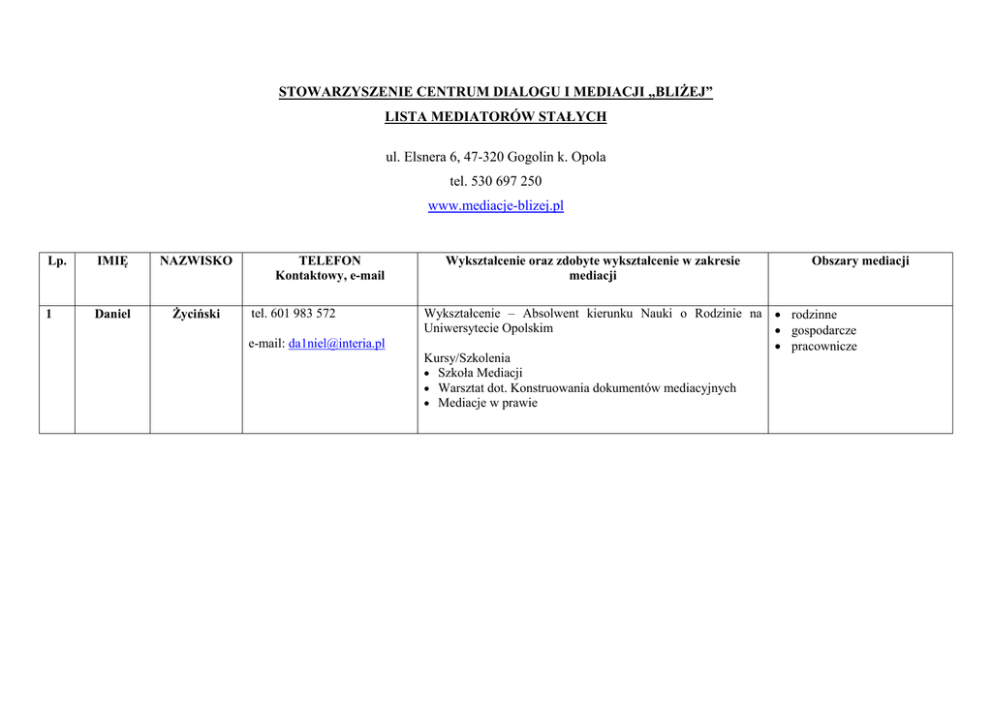 STOWARZYSZENIE CENTRUM DIALOGU I MEDIACJI „BLIŻEJ” LISTA MEDIATORÓW STAŁYCH ul. Elsnera 6, 47-320 Gogolin k. Opola tel. 530 697 250 www.mediacje-blizej.pl Lp. IMIĘ NAZWISKO 1 Daniel Życiński TELEFON Kontaktowy, e-mail tel. 601 983 572 e-mail: [email protected] Wykształcenie oraz zdobyte wykształcenie w zakresie mediacji Obszary mediacji Wykształcenie – Absolwent kierunku Nauki o Rodzinie na rodzinne Uniwersytecie Opolskim gospodarcze pracownicze Kursy/Szkolenia Szkoła Mediacji Warsztat dot. Konstruowania dokumentów mediacyjnych Mediacje w prawie