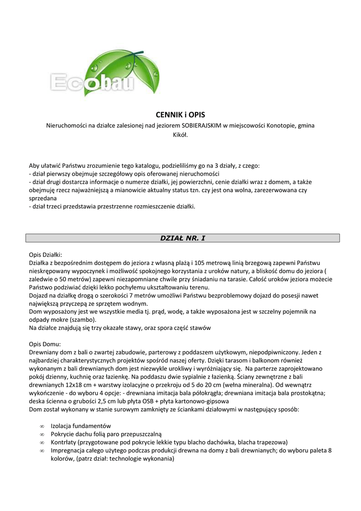 CENNIK i OPIS Nieruchomości na działce zalesionej nad jeziorem SOBIERAJSKIM w miejscowości Konotopie, gmina Kikół. Aby ułatwić Państwu zrozumienie tego katalogu, podzieliliśmy go na 3 działy, z czego: - dział pierwszy obejmuje szczegółowy opis oferowanej nieruchomości - dział drugi dostarcza informacje o numerze działki, jej powierzchni, cenie działki wraz z domem, a także obejmuję rzecz najważniejszą a mianowicie aktualny status tzn. czy jest ona wolna, zarezerwowana czy sprzedana - dział trzeci przedstawia przestrzenne rozmieszczenie działki. DZIAŁ NR. I Opis Działki: Działka z bezpośrednim dostępem do jeziora z własną plażą i 105 metrową linią brzegową zapewni Państwu nieskrępowany wypoczynek i możliwość spokojnego korzystania z uroków natury, a bliskość domu do jeziora ( zaledwie o 50 metrów) zapewni niezapomniane chwile przy śniadaniu na tarasie. Całość uroków jeziora możecie Państwo podziwiać dzięki lekko pochyłemu ukształtowaniu terenu. Dojazd na działkę drogą o szerokości 7 metrów umożliwi Państwu bezproblemowy dojazd do posesji nawet największą przyczepą ze sprzętem wodnym. Dom wyposażony jest we wszystkie media tj. prąd, wodę, a także wyposażona jest w szczelny pojemnik na odpady mokre (szambo). Na działce znajdują się trzy okazałe stawy, oraz spora część stawów Opis Domu: Drewniany dom z bali o zwartej zabudowie, parterowy z poddaszem użytkowym, niepodpiwniczony. Jeden z najbardziej charakterystycznych projektów spośród naszej oferty. Dzięki tarasom i balkonom również wykonanym z bali drewnianych dom jest niezwykle urokliwy i wyróżniający się. Na parterze zaprojektowano pokój dzienny, kuchnię oraz łazienkę. Na poddaszu dwie sypialnie z łazienką. Ściany zewnętrzne z bali drewnianych 12x18 cm + warstwy izolacyjne o przekroju od 5 do 20 cm (wełna mineralna). Od wewnątrz wykończenie - do wyboru 4 opcje: - drewniana imitacja bala półokrągła; drewniana imitacja bala prostokątna; deska ścienna o grubości 2,5 cm lub płyta OSB + płyta kartonowo-gipsowa Dom został wykonany w stanie surowym zamknięty ze ściankami działowymi w następujący sposób: • • • • Izolacja fundamentów Pokrycie dachu folią paro przepuszczalną Kontrłaty (przygotowane pod pokrycie lekkie typu blacho dachówka, blacha trapezowa) Impregnacja całego użytego podczas produkcji drewna na domy z bali drewnianych; do wyboru paleta 8 kolorów, (patrz dział: technologie wykonania) • • • • • • • • • • • • • • • • Suszenie drewna użytego do produkcji: wilgodtność od 6 do 16% Jednostronne obicie stropu montaż foli paro przepuszczalnej na wszystkich ścianach zewnętrznych Montaż na ścianach zewnętrznych słupków drewnianych 7 x 10 cm, stanowiących element konstrukcyjny domu drewnianego jak również stelaż pod późniejsze zamocowanie wewnętrznej ściany elewacyjnej 4-stronna obróbka całego użytego podczas produkcji domu drewna; zabezpieczenie przeciw pożarowe Szczyty domów drewnianych również wykonane z bala Po wykonaniu montażu domu DWUKROTNE malowanie metodą natryskową wszystkich elementów drewnianych widocznych z zewnątrz narażonych na działanie czynników atmosferycznych specjalnymi lakierami firmy Sigma; do wyboru paleta 8 kolorów (patrz dział: technologie wykonania) Kotwienie budynku do fundamentów Obróbka bala startowego blachą w kolorze dachu Montaż rynien PCV Pokrycie dachu blacho dachówką lub blachą trapezową; do wyboru paleta 12 kolorów Montaż okien i drzwi zewnętrznych; do wyboru paleta 12 kolorów Obróbka z zewnątrz okien i drzwi wraz z parapetami drewnianymi Montaż okien dachowych Tarasy zadaszone, pełne deskowanie krokwi nad tarasem Balustrady, poręcze tarasów i balkonów DZIAŁ NR. II Działka Nr: 144/4 Powierzchnia działki: Plaża: Nazwa domu: Powierzchnia domu: Powierzchnia tarasu: Powierzchnia stawów: Powierzchnia Lasu: Powierzchnia Jeziora: Odległość od drogi A10: 14.000 m2 własna, 105 m szerokości „Konwalia” 110m2 50m2 0,3 Ha 0,8 Ha Cena: 495.000zł + 8% VAT 10,4 Ha 2,4 Km WOLNE DZIAŁ NR. III Jezioro Sobieraj 144/4