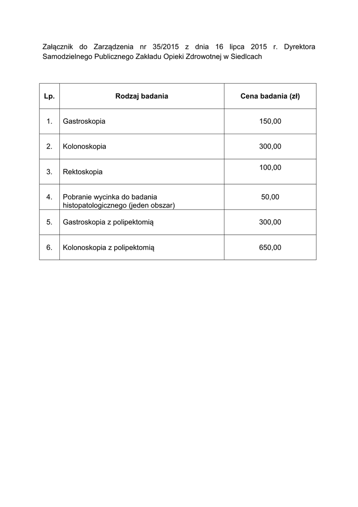 Załącznik do Zarządzenia nr 35/2015 z dnia 16 lipca 2015 r. Dyrektora Samodzielnego Publicznego Zakładu Opieki Zdrowotnej w Siedlcach Lp. Rodzaj badania Cena badania (zł) 1. Gastroskopia 150,00 2. Kolonoskopia 300,00 3. Rektoskopia 4. Pobranie wycinka do badania histopatologicznego (jeden obszar) 50,00 5. Gastroskopia z polipektomią 300,00 6. Kolonoskopia z polipektomią 650,00 100,00