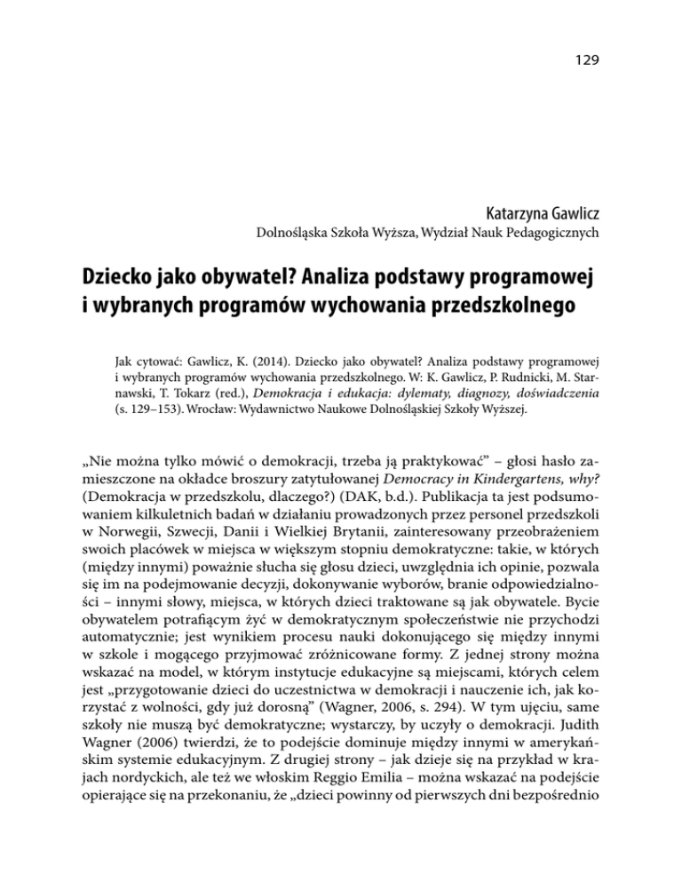 129 Katarzyna Gawlicz Dolnośląska Szkoła Wyższa, Wydział Nauk Pedagogicznych Dziecko jako obywatel? Analiza podstawy programowej i wybranych programów wychowania przedszkolnego Jak cytować: Gawlicz, K. (2014). Dziecko jako obywatel? Analiza podstawy programowej i wybranych programów wychowania przedszkolnego. W: K. Gawlicz, P. Rudnicki, M. Starnawski, T. Tokarz (red.), Demokracja i edukacja: dylematy, diagnozy, doświadczenia (s. 129–153). Wrocław: Wydawnictwo Naukowe Dolnośląskiej Szkoły Wyższej. „Nie można tylko mówić o demokracji, trzeba ją praktykować” – głosi hasło zamieszczone na okładce broszury zatytułowanej Democracy in Kindergartens, why? (Demokracja w przedszkolu, dlaczego?) (DAK, b.d.). Publikacja ta jest podsumowaniem kilkuletnich badań w działaniu prowadzonych przez personel przedszkoli w Norwegii, Szwecji, Danii i Wielkiej Brytanii, zainteresowany przeobrażeniem swoich placówek w miejsca w większym stopniu demokratyczne: takie, w których (między innymi) poważnie słucha się głosu dzieci, uwzględnia ich opinie, pozwala się im na podejmowanie decyzji, dokonywanie wyborów, branie odpowiedzialności – innymi słowy, miejsca, w których dzieci traktowane są jak obywatele. Bycie obywatelem potrafiącym żyć w demokratycznym społeczeństwie nie przychodzi automatycznie; jest wynikiem procesu nauki dokonującego się między innymi w szkole i mogącego przyjmować zróżnicowane formy. Z jednej strony można wskazać na model, w którym instytucje edukacyjne są miejscami, których celem jest „przygotowanie dzieci do uczestnictwa w demokracji i nauczenie ich, jak korzystać z wolności, gdy już dorosną” (Wagner, 2006, s. 294). W tym ujęciu, same szkoły nie muszą być demokratyczne; wystarczy, by uczyły o demokracji. Judith Wagner (2006) twierdzi, że to podejście dominuje między innymi w amerykańskim systemie edukacyjnym. Z drugiej strony – jak dzieje się na przykład w krajach nordyckich, ale też we włoskim Reggio Emilia – można wskazać na podejście opierające się na przekonaniu, że „dzieci powinny od pierwszych dni bezpośrednio 130 DEMOKRACJA I EDUKACJA: dylematy, diagnozy, doświadczenia doświadczać demokracji” (Wagner, 2006, s. 294), bo tylko dzięki temu będą mogły rozwijać kompetencje potrzebne do życia w demokratycznym społeczeństwie. To drugie podejście zakłada, że dzieci nie stają się obywatelami, ale już nimi są (Coady, 2010). Stig Broström wyraża to wprost: „Dzieci nie przygotowują się do tego, by stać się kompetentne, zdobyć prawa lub mieć wkład w społeczeństwo. One już są zdolne do aktywnej partycypacji i kompetentnego korzystania ze swoich praw i siły sprawczej” (Broström, 2006, s. 233). Niniejszy tekst stanowi próbę określenia, czy dokumenty programowe z obszaru edukacji przedszkolnej w Polsce (podstawa programowa oraz wybrane programy wychowania przedszkolnego) uwzględniają wyobrażenia dziecka jako obywatela, mającego możliwość rozwijania kompetencji ważnych dla życia w demokratycznym społeczeństwie oraz stwarzają warunki do funkcjonowania przedszkoli jako przestrzeni, w której dzieci mogą doświadczać demokracji lub choćby się o niej uczyć1. Ramy teoretyczne analizy wyznaczają koncepcje demokracji jako praktyki życia codziennego (Dewey, 1988; Moss, 2007, 2011) oraz konstruowane na podstawie Konwencji o Prawach Dziecka ONZ wyobrażenie dziecka jako obywatela, mającego prawo nie tylko do ochrony, ale i do aktywnego kształtowania społeczeństwa, w którym żyje. Dziecko jako obywatel demokratycznej społeczności – ramy pojęciowe Pojęcie obywatelskości kształtowało się stopniowo, odzwierciedlając poszerzanie dostępu do kolejnych rodzajów praw: począwszy od praw obywatelskich (wolność słowa, równość wobec prawa i prawo własności), przez prawa polityczne (powszechne prawo wyborcze), a skończywszy na prawach socjalnych (powszechne prawo do edukacji, zabezpieczeń socjalnych, dobrostanu) (Coady, 2008). Fundament koncepcji obywatelskości opierającej się na posiadaniu tego zestawu praw miała stanowić idea powszechnej równości, jednak równość ta przez długi czas nie obejmowała wszystkich, na przykład kobiet i dzieci (Coady, 2008, s. 4). Dzieciom zaczęto przyznawać prawa dopiero w XX wieku, co znajduje swoje odbicie w Deklaracji Praw Dziecka z 1924 roku. Prawne umocowanie wyobrażenia dziecka jako obywatela stanowi jednak przede wszystkim późniejszy akt – Konwencja o Prawach Dziecka ONZ (ratyfikowana przez Polskę w 1991 roku). W odróżnieniu od wcześniejszych instrumentów prawnych, Konwencja wychodzi poza troskę o dobrostan dzieci, tworząc ramy dla myślenia o ich partycypacji i samostanowieniu (Wyness, 1 Niniejszy artykuł opiera się na badaniach przeprowadzonych w ramach projektu pt. „Analiza podstawy programowej wychowania przedszkolnego w perspektywie Konwencji o Prawach Dziecka oraz koncepcji dziecko jako obywatel”, realizowanego przez Fundację Rozwoju Dzieci im. J.A Komeńskiego, a finansowanego przez Biuro Rzecznika Praw Dziecka. Zasygnalizowane w niniejszym artykule wątki zostały rozwinięte w: Gawlicz, Röhrborn (2014). Katarzyna Gawlicz 131 2006, s. 212). Z tego względu szczególnie istotne są artykuły od 12. do 16., dotyczące praw dzieci do wyrażania własnych poglądów, do swobody wypowiedzi, myśli, sumienia, wyznania, do swobodnego zrzeszania się oraz ochrony przed bezprawną ingerencją w jego życie prywatne, rodzinne i domowe. Z perspektywy problematyki podejmowanej w niniejszym tekście, należy zwrócić uwagę przede wszystkim na artykuł 12. Konwencji, nakładający na sygnatariuszy obowiązek zapewnienia „dziecku, które jest zdolne do kształtowania swych własnych poglądów, prawa do swobodnego wyrażania własnych poglądów we wszystkich sprawach dotyczących dziecka” i przyjmowania ich „z należytą wagą, stosownie do wieku oraz dojrzałości 