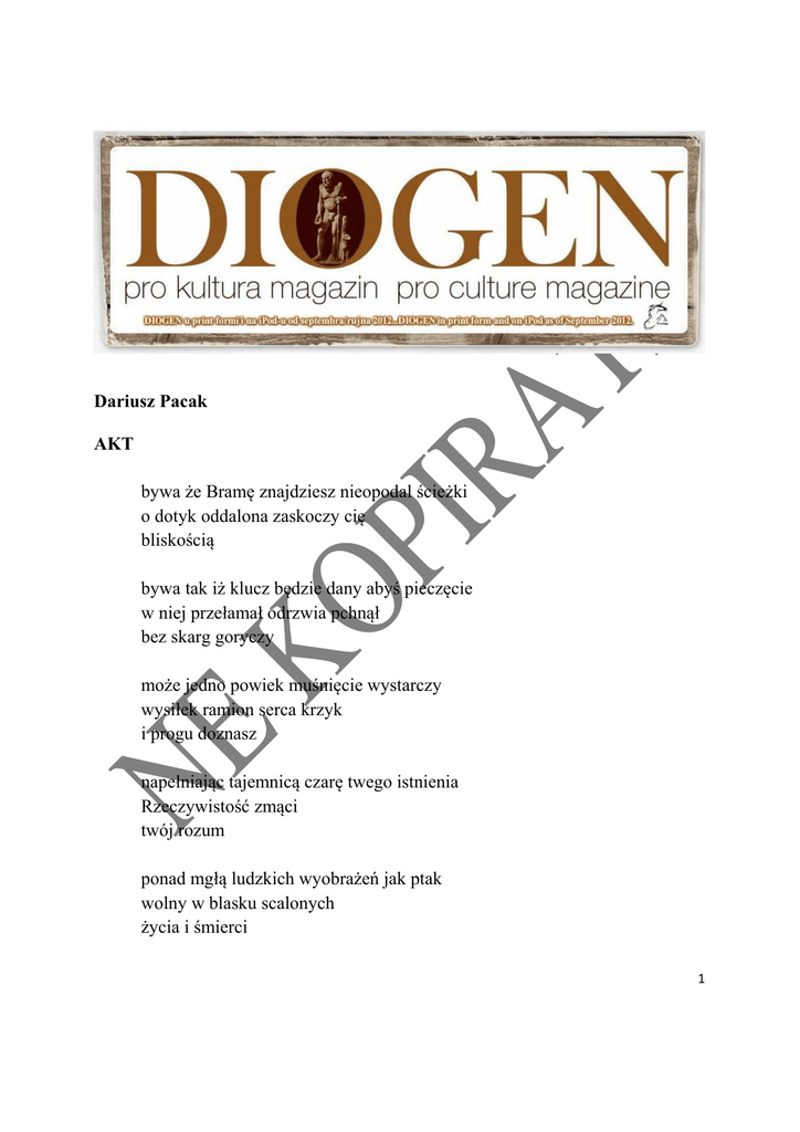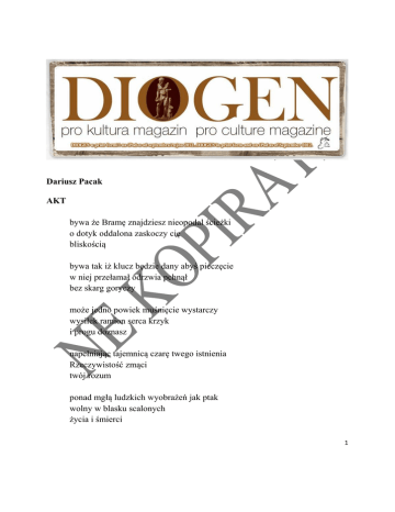 Dariusz Pacak AKT bywa że Bramę znajdziesz nieopodal ścieżki o dotyk oddalona zaskoczy cię bliskością bywa tak iż klucz będzie dany abyś pieczęcie w niej przełamał odrzwia pchnął bez skarg goryczy może jedno powiek muśnięcie wystarczy wysiłek ramion serca krzyk i progu doznasz napełniając tajemnicą czarę twego istnienia Rzeczywistość zmąci twój rozum ponad mgłą ludzkich wyobrażeń jak ptak wolny w blasku scalonych życia i śmierci 1 ślad odciśniesz w przestrzeni Równoległej w ogniu i lodzie dom prawdziwy znajdziesz lecz może stać się też tak że to bliskie odległą galaktyką będzie w swym lśnieniu niedosięgłą tak jak nie dotkniętym i niewidzialnym pozostaje czas 19 Stycznia 2013, Trattenbach – Schlaggraben, Austria 2 RÓŻA PUSTYNI ze źródła nieskończoności sycisz nas bez obracania przesypując uncja za uncją ochrę jak pył czy też prasłowo właśnie zatacza krąg piachem pokrywając na zawsze wieczną księgę zapisów człowieczych rąk 4 czerwca 2009, Matmata – Douz /Sahara/, Tunezja 3 Idź i słuchaj, idź i patrz. Tylko idź ale zrób to w pełni. Bądź jak ciche, rozpalone żelazo… i wejdź głęboko. Wiedeń, 19 Grudnia 2010 INTENSYWNOŚĆ PRZEŻYCIA od pokoleń szukają Edenu poza obszarem dostępności tam gdzie Światło tkwi a wypełnienie jest zupełne czy nie należy sądzić że Ziemia Obiecana istnieje w początku Słowa tam gdzie żyje nie poznane dotąd całkowite stworzenie człowieka – w nim 15 Listopada 2010, Wiedeń 4 MAŁE MIEJSCE czy każdy z nas i każda inna forma istnienia musimy mieć swoje miejsce jeden naród i ojczyznę jedno tak własną ścieżkę planetę kamienia wszechświat kałuży dla jednych domem staje się muszla zaklęta w rafie tak jak ziarnko piasku bywa za posłanie lub pustynię a jedna kropla zaspokaja pragnienie lecz jeśli jest tak że wody wszystkich oceanów nie zdołają go nasycić albo tajfun ogarniający kontynenty jawi się miejscem lub użycza go wiatr doglądający o zachodzie planetę może domem jest gest który powołał do życia światło rozbijając studnię ciemności i ciszy kiedy całość była niepodzielna całkowita nienazwana wielkości punktu 20 września 2012, Flamenco Beach /El Quseir/, Egipt 5 Pośrodku ziemi Staję, Przyjrzyjcie mi się! W sercu wiatru Staję, Przyjrzyjcie mi się! Źródło zaklęć, Oto staję, W sercu wiatru Staję. Śpiew Siuksów na malowanie ciała w kolory wojenne* PUSTYNNY RYTUAŁ TAŃCA W Afryce niesiesz pręgierz, za zbrodnie białych oprawców. Barwa twej skóry parzy! W Azji oszukuje się ciebie za winy kolonializmu. Wciąż to ty masz buty.Po niewłaściwych stronach kurtyn od dawna bywasz, w Europie. Niewygodny twój wzrok... W Ameryce zwracają się do ciebie, poznając po akcencie: – Are you from Germany, yes? W Niemczech pytają: – Sind Sie aus Amerika, ja? W Polsce słyszysz: – Czego chcesz? Nie rozumiesz, nie mieszkasz tu, jesteś obcy! – Sie schreiben aber – mówią w Austrii – in Polnisch. Sie gehört nicht zu uns! Ale jest jedna przestrzeń, dookoła planety, w której nie pytają o nic. Tam żadna rozmowa nie może być groźna. Nie istnieje obcy akcent w wypowiedzianym słowie. Nie ma dokumentów, granic, straży... I jeśli tam ktoś czeka, to tylko On – ten, który sprowadził cię nań, bez względu na niecne sprawy twych braci, tygiel poznanych światów, kolor paszportu. On, który wybrał cię, byś zatańczył jedyną pieśń życia. Jest żar, piach, ochra i krew.Rodzi się szansa spotkania z Matką Ziemią. Ruszaj! 6 *Zbigniew Stolarek [wybór i przekład]Czerwone oczy maski. Murzyńskie, eskimoskie, indiańskie, polinezyjskie teksty poetyckie. 26 Października 2011, New York, Bensonhurst PR DIOGEN pro kultura http://www.diogenpro.com 7