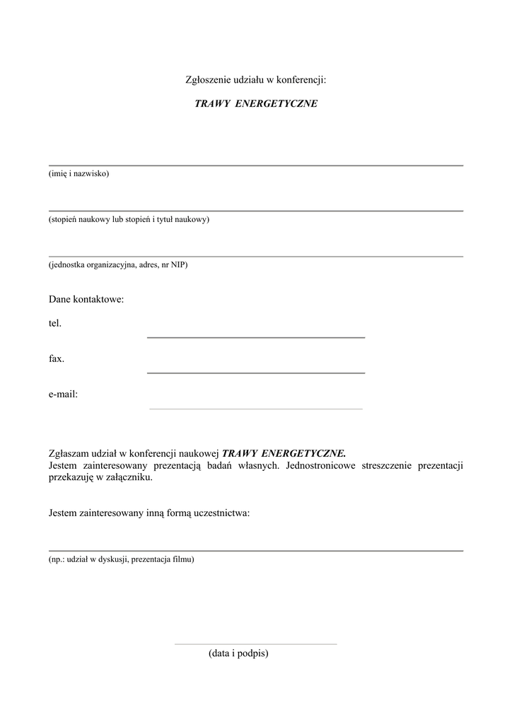 Zgłoszenie udziału w konferencji: TRAWY ENERGETYCZNE Dane