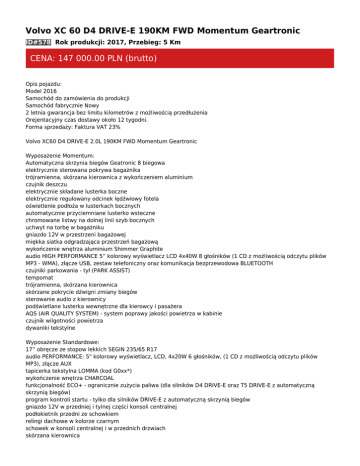 Volvo XC 60 D4 DRIVE-E 190KM FWD Momentum Geartronic ID#578 Rok produkcji: 2017, Przebieg: 5 Km CENA: 147 000.00 PLN (brutto) Opis pojazdu: Model 2016 Samochód do zamówienia do produkcji Samochód fabrycznie Nowy 2 letnia gwarancja bez limitu kilometrów z możliwością przedłużenia Orejentacyjny czas dostawy około 12 tygodni. Forma sprzedaży: Faktura VAT 23% Volvo XC60 D4 DRIVE-E 2.0L 190KM FWD Momentum Geartronic Wyposażenie Momentum: Automatyczna skrzynia biegów Geatronic 8 biegowa elektrycznie sterowana pokrywa bagażnika trójramienna, skórzana kierownica z wykończeniem aluminium czujnik deszczu elektrycznie składane lusterka boczne elektrycznie regulowany odcinek lędźwiowy fotela oświetlenie podłoża w lusterkach bocznych automatycznie przyciemniane lusterko wsteczne chromowane listwy na dolnej linii szyb bocznych uchwyt na torbę w bagażniku gniazdo 12V w przestrzeni bagażowej miękka siatka odgradzająca przestrzeń bagażową wykończenie wnętrza aluminium Shimmer Graphite audio HIGH PERFORMANCE 5” kolorowy wyświetlacz LCD 4x40W 8 głośników (1 CD z możliwością odczytu plików MP3 - WMA), złącze USB, zestaw telefoniczny oraz komunikacja bezprzewodowa BLUETOOTH czujniki parkowania - tył (PARK ASSIST) tempomat trójramienna, skórzana kierownica skórzane pokrycie dźwigni zmiany biegów sterowanie audio z kierownicy podświetlane lusterka wewnętrzne dla kierowcy i pasażera AQS (AIR QUALITY SYSTEM) - system poprawy jakości powietrza w kabinie czujnik wilgotności powietrza dywaniki tekstylne Wyposażenie Standardowe: 17” obręcze ze stopow lekkich SEGIN 235/65 R17 audio PERFORMANCE: 5" kolorowy wyświetlacz, LCD, 4x20W 6 głośników, (1 CD z możliwością odczytu plików MP3), złącze AUX tapicerka tekstylna LOMMA (kod G0xx*) wykończenie wnętrza CHARCOAL funkcjonalność ECO+ - ogranicznie zużycia paliwa (dla silników D4 DRIVE-E oraz T5 DRIVE-E z automatyczną skrzynią biegów) program kontroli startu - tylko dla silników DRIVE-E z automatyczną skrzynią biegów gniazdo 12V w przedniej i tylnej części konsoli centralnej podłokietnik przedni ze schowkiem relingi dachowe w kolorze czarnym schowek w konsoli centralnej i w przednich drzwiach skórzana kierownica roleta bagażnika światła do jazdy dziennej LED trójdzielna kanapa tylna (dzielona w proporcjach 40/20/40) komputer pokładowy z komunikatami w języku polskim wskaźnik temperatury zewnętrznej dwie końcówki rury wydechowej (dla silników D4,D4AWD,D5AWD, T5, T6 oraz T6 AWD) zestaw naprawczy ogumienia STOP/START dla silników DRIVE-E oraz D3, D4 AWD, D5 z manualną skrzynią biegów PTC (POSITIVE TEMPERATURE CONTROL) szybkie nagrzewanie wnętrza (tylko dla silników D3, D4 i D5) KIR (KEY INTEGRATED REMOTE) klucz zintegrowany z pilotem centralnego zamka elektrycznie regulowane i podgrzewane lusterka zewnętrzne ECC - ELECTRONIC CLIMATE CONTROL - klimatyzacja sterowana elektronicznie, dwustrefowa z filtrem kierownica regulowana w dwóch płaszczyznach barwione szyby elektrycznie sterowane szyby boczne z przodu i z tyłu z funkcją opuszczania i domykania CITY SAFETY - laserowy czujnik ograniczający ryzyko kolizji (działa do 50 km/h) 6 poduszek powietrznych: dla kierowcy i pasażera, dwie poduszki boczne (dwukomorowe), kurtyny powietrzne (IC) DSTC – DYNAMIC STABILITY AND TRACTION CONTROL układ dynamicznej kontroli stabilności i trakcji SIPS (Side Impact Protection System) system zabezpieczeń przed skutkami uderzeń bocznych WHIPS (Whiplash Protection Seating System) system zabezpieczeń przed urazami kręgosłupa szyjnego ABS (ANTI-LOCK BRAKE SYSTEM) z elektronicznym układem rozdziału sił hamowania (EBD – Electronic Brake Distribution) CTC (CORNER TRACKING CONTROL) - kontrola trakcji w zakręcie autoalarm Volvo Guard z czujnikiem przechyłu oraz masowym czujnikiem ruchu immobilizer ze zmiennym kodem oświetlenie asekuracyjne Home Safe sygnalizacja niezapiętych pasów bezpieczeństwa dla wszystkich miejsc EBA (EMERGENCY BRAKE ASSISTANCE) układ wspomagania nagłego hamowania system mocowania fotelika ISOFIX dla zewnętrznych miejsc tylnej kanapy EBL (Emergency Brake Lights) - ostrzeganie innych użytkowników drogi o gwałtownym hamowaniu IDIS (INTELLIGENT DRIVER INFORMATION SYSTEM) system inteligentnego informowania kierowcy elektronicznie sterowany napęd na obie osie AWD (ALL WHEEL DRIVE) z układem Instant Traction (dla D4 AWD, D5 AWD oraz T6 AWD) RSC (ROLL STABILITY CONTROL)- układ stabilizacji przechyłu elektrycznie sterowany hamulec postojowy boczne światła obrysowe schowek pod podłogą bagażnika układ kontroli zjazdu ze wzniesienia (HDC - Hill Descent Control) dla silników z napędem na cztery koła Niniejsze ogłoszenie jest wyłącznie informacją handlową i nie stanowi oferty w myśl art. 66, § 1. Kodeksu Cywilnego.Sprzedający nie odpowiada za ewentualne błędy lub nieaktualność ogłoszenia. Informacje umieszczone w ogłoszeniu, służą jedynie celom informacyjnym. GRUPA PRO-CAR Sp. z o.o. Niezależny Dealer Audi i Volvo 03-128 Warszawa, ul. Świderska 109F lok. 7 NIP: 524-26-19-332, REGON: 1410664403, KRS: 0000286534 Sąd Rejonowy dla M. St. Warszawy w Warszawie, XIII Wydział Gospodarczy KRS Salon: 05-090 Warszawa - Janki, ul. Sezamkowa 2, tel. (22) 711 64 64