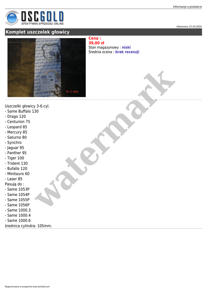 Informacje o produkcie Utworzono 12-10-2016 Komplet uszczelek głowicy Cena : 39,00 zł w at Uszczelki głowicy 3-6.cyl. - Same Buffalo 130 - Drago 120 - Centurion 75 - Leopard 85 - Mercury 85 - Saturno 80 - Synchro - Jaguar 95 - Panther 95 - Tiger 100 - Trident 130 - Bufallo 120 - Minitauro 60 - Laser 85 Pasują do : - Same 1053P - Same 1054P - Same 1055P - Same 1056P - Same 1000.3 - Same 1000.4 - Same 1000.6 średnica cylindra: 105mm. er m ar k Stan magazynowy : niski Średnia ocena : brak recenzji Wygenerowano w programie www.oscGold.com