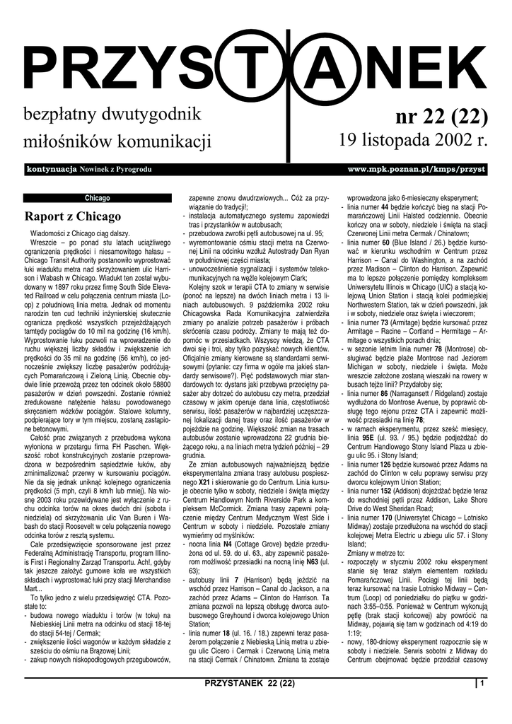 PRZYS T A NEK bezpłatny dwutygodnik miłośników komunikacji miejskiej kontynuacja Nowinek z Pyrogrodu Chicago Raport z Chicago Wiadomości z Chicago ciąg dalszy. Wreszcie – po ponad stu latach uciąŜliwego ograniczenia prędkości i niesamowitego hałasu – Chicago Transit Authority postanowiło wyprostować łuki wiaduktu metra nad skrzyŜowaniem ulic Harrison i Wabash w Chicago. Wiadukt ten został wybudowany w 1897 roku przez firmę South Side Elevated Railroad w celu połączenia centrum miasta (Loop) z południową linia metra. Jednak od momentu narodzin ten cud techniki inŜynierskiej skutecznie ogranicza prędkość wszystkich przejeŜdŜających tamtędy pociągów do 10 mil na godzinę (16 km/h). Wyprostowanie łuku pozwoli na wprowadzenie do ruchu większej liczby składów i zwiększenie ich prędkości do 35 mil na godzinę (56 km/h), co jednocześnie zwiększy liczbę pasaŜerów podróŜujących Pomarańczową i Zieloną Linią. Obecnie obydwie linie przewoŜą przez ten odcinek około 58800 pasaŜerów w dzień powszedni. Zostanie równieŜ zredukowane natęŜenie hałasu powodowanego skręcaniem wózków pociągów. Stalowe kolumny, podpierające tory w tym miejscu, zostaną zastąpione betonowymi. Całość prac związanych z przebudowa wykona wyłoniona w przetargu firma FH Paschen. Większość robot konstrukcyjnych zostanie przeprowadzona w bezpośrednim sąsiedztwie łuków, aby zminimalizować przerwy w kursowaniu pociągów. Nie da się jednak uniknąć kolejnego ograniczenia prędkości (5 mph, czyli 8 km/h lub mniej). Na wiosnę 2003 roku przewidywane jest wyłączenie z ruchu odcinka torów na okres dwóch dni (sobota i niedziela) od skrzyŜowania ulic Van Buren i Wabash do stacji Roosevelt w celu połączenia nowego odcinka torów z resztą systemu. Cale przedsięwzięcie sponsorowane jest przez Federalną Administrację Transportu, program Illinois First i Regionalny Zarząd Transportu. Ach!, gdyby tak jeszcze załoŜyć gumowe koła we wszystkich składach i wyprostować łuki przy stacji Merchandise Mart... To tylko jedno z wielu przedsięwzięć CTA. Pozostałe to: - budowa nowego wiaduktu i torów (w toku) na Niebieskiej Linii metra na odcinku od stacji 18-tej do stacji 54-tej / Cermak; - zwiększenie ilości wagonów w kaŜdym składzie z sześciu do ośmiu na Brązowej Linii; - zakup nowych niskopodłogowych przegubowców, zapewne znowu dwudrzwiowych... CóŜ za przywiązanie do tradycji!; - instalacja automatycznego systemu zapowiedzi tras i przystanków w autobusach; - przebudowa zwrotki pętli autobusowej na ul. 95; - wyremontowanie ośmiu stacji metra na Czerwonej Linii na odcinku wzdłuŜ Autostrady Dan Ryan w południowej części miasta; - unowocześnienie sygnalizacji i systemów telekomunikacyjnych na węźle kolejowym Clark; Kolejny szok w terapii CTA to zmiany w serwisie (ponoć na lepsze) na dwóch liniach metra i 13 liniach autobusowych. 9 października 2002 roku Chicagowska Rada Komunikacyjna zatwierdziła zmiany po analizie potrzeb pasaŜerów i próbach skrócenia czasu podroŜy. Zmiany te mają teŜ dopomóc w przesiadkach. Wszyscy wiedzą, Ŝe CTA dwoi się i troi, aby tylko pozyskać nowych klientów. Oficjalnie zmiany kierowane są standardami serwisowymi (pytanie: czy firma w ogóle ma jakieś standardy serwisowe?). Pięć podstawowych miar standardowych to: dystans jaki przebywa przeciętny pasaŜer aby dotrzeć do autobusu czy metra, przedział czasowy w jakim operuje dana linia, częstotliwość serwisu, ilość pasaŜerów w najbardziej uczęszczanej lokalizacji danej trasy oraz ilość pasaŜerów w pojeździe na godzinę. Większość zmian na trasach autobusów zostanie wprowadzona 22 grudnia bieŜącego roku, a na liniach metra tydzień później – 29 grudnia. Ze zmian autobusowych najwaŜniejszą będzie eksperymentalna zmiana trasy autobusu pospiesznego X21 i skierowanie go do Centrum. Linia kursuje obecnie tylko w soboty, niedziele i święta między Centrum Handlowym North Riverside Park a kompleksem McCormick. Zmiana trasy zapewni połączenie między Centrum Medycznym West Side i Centrum w soboty i niedziele. Pozostałe zmiany wymieńmy od myślników: - nocna linia N4 (Cottage Grove) będzie przedłuŜona od ul. 59. do ul. 63., aby zapewnić pasaŜerom moŜliwość przesiadki na nocną linię N63 (ul. 63); - autobusy linii 7 (Harrison) będą jeździć na wschód przez Harrison – Canal do Jackson, a na zachód przez Adams – Clinton do Harrison. Ta zmiana pozwoli na lepszą obsługę dworca autobusowego Greyhound i dworca kolejowego Union Station; - linia numer 18 (ul. 16. / 18.) zapewni teraz pasaŜerom połączenie z Niebieską Linią metra u zbiegu ulic Cicero i Cermak i Czerwoną Linią metra na stacji Cermak / Chinatown. Zmiana ta zostaje PRZYSTANEK 22 (22) nr 22 (22) 19 listopada 2002 r. www.mpk.poznan.pl/kmps/przyst wprowadzona jako 6-miesieczny eksperyment; - linia numer 44 będzie kończyć bieg na stacji Pomarańczowej Linii Halsted codziennie. Obecnie kończy ona w soboty, niedziele i święta na stacji Czerwonej Linii metra Cermak / Chinatown; - linia numer 60 (Blue Island / 26.) będzie kursować w kierunku wschodnim w Centrum przez Harrison – Canal do Washington, a na zachód przez Madison – Clinton do Harrison. Zapewnić ma to lepsze połączenie pomiędzy kompleksem Uniwersytetu Illinois w Chicago (UIC) a stacją kolejową Union Station i stacją kolei podmiejskiej Northwestern Station, tak w dzień powszedni, jak i w soboty, niedziele oraz święta i wieczorem; - linia numer 73 (Armitage) będzie kursować przez Armitage – Racine – Cortland – Hermitage – Armitage o wszystkich porach dnia; - w sezonie letnim linia numer 78 (Montrose) obsługiwać będzie plaŜe Montrose nad Jeziorem Michigan w soboty, niedziele i święta. MoŜe wreszcie załoŜone zostaną wieszaki na rowery w busach tejŜe linii? Przydałoby się; - linia numer 86 (Narragansett / Ridgeland) zostaje wydłuŜona