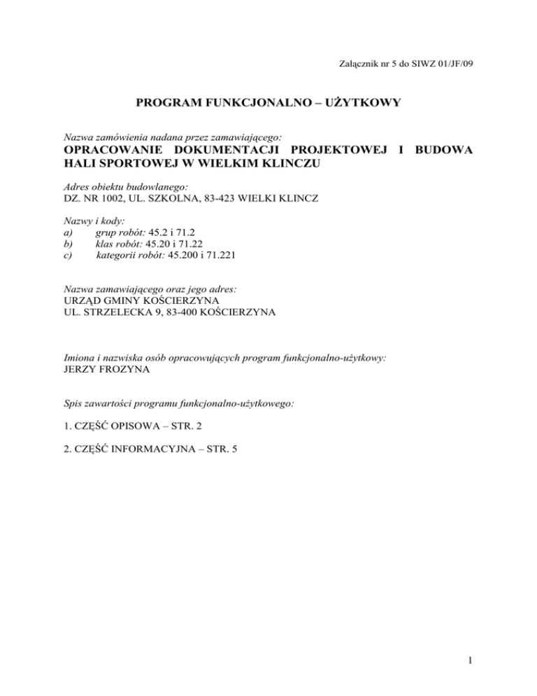 Załącznik nr 5 do SIWZ 01/JF/09 PROGRAM FUNKCJONALNO – UśYTKOWY Nazwa zamówienia nadana przez zamawiającego: OPRACOWANIE DOKUMENTACJI PROJEKTOWEJ I BUDOWA HALI SPORTOWEJ W WIELKIM KLINCZU Adres obiektu budowlanego: DZ. NR 1002, UL. SZKOLNA, 83-423 WIELKI KLINCZ Nazwy i kody: a) grup robót: 45.2 i 71.2 b) klas robót: 45.20 i 71.22 c) kategorii robót: 45.200 i 71.221 Nazwa zamawiającego oraz jego adres: URZĄD GMINY KOŚCIERZYNA UL. STRZELECKA 9, 83-400 KOŚCIERZYNA Imiona i nazwiska osób opracowujących program funkcjonalno-uŜytkowy: JERZY FROZYNA Spis zawartości programu funkcjonalno-uŜytkowego: 1. CZĘŚĆ OPISOWA – STR. 2 2. CZĘŚĆ INFORMACYJNA – STR. 5 1 1. CZĘŚĆ OPISOWA PROGRAMU FUNKCJONALNO – UśYTKOWEGO: 1.1. OPIS OGÓLNY PRZEDMIOTU ZAMÓWIENIA 1.1.1 charakterystyczne parametry określające wielkość obiektu /obiektów lub zakresu robót budowlanych wyraŜone w przyjętych jednostkach odniesienia takich jak m, m2,m3 Hala sportowa o wymiarach w osiach uwarunkowanych wymiarami boisk i pomieszczeń zaplecza, wysokość min 7,5m nad polem gry. 1.1.2. aktualne uwarunkowania wykonania przedmiotu zamówienia; NaleŜy zaprojektować i wykonać halę sportową na działce gminnej zgodnie z opisem przedmiotu zamówienia i niniejszego programu funkcjonalno-uŜytkowego. 1.1.3. ogólne właściwości funkcjonalno-uŜytkowe; W hali sportowej planuje się: rozgrywki sportowe, organizację akademii szkolnych i imprez okolicznościowych. W hali sportowej planuje się następujące boiska sportowe: Piłka ręczna 20m x 40m Siatkówka 9m x 18m Koszykówka 14m x 28m Linie boisk oznaczyć na podłodze hali. Powierzchnię hali podzielić na 3 strefy/boiska do zajęć wf za pomocą przegród uruchomianych mechanicznie w poprzek pola gry do piłki ręcznej tworząc trzy małe boiska wyposaŜone w kosze do koszykówki oddzielone kotarami do wysokości 3,2m pełnymi. Budynek hali powinien być wyposaŜony w zaplecze socjalne. Zaplecze powinno mieć min 4 szatnie po 25 osób i pomieszczenie sędziowskie z węzłami WC i natryskami, 2 pokoje trenerów, pomieszczenie klubowe min. 60m2, WC dla publiczności, magazynki na sprzęt sportowy i ew. pomieszczenia techniczne, sprzątaczek itd. Wejścia z szatni bezpośrednio na boisko. Przewidzieć moŜliwość oddzielenia /zamknięcia 2ch szatni/ Hala musi pomieścić trybuny dla publiczności min. 200 miejsc /ruchome lub stałe/. Obiekt przystosowany dla osób niepełnosprawnych, co najmniej 2 szatnie i WC przystosowane dla niepełnosprawnych. W zakresie zagospodarowania terenu wokół hali wykonać naleŜy dojścia na teren szkoły, zieleń, parking na 25 samochodów wraz z zatoką autobusową, oświetlenie zewnętrzne oraz niezbędne elementy małej architektury. WyposaŜenie - Stolik sędziowski i miejsca zawodników wzdłuŜ dłuŜszego boku boiska z zachowaniem strefy bezpieczeństwa, - Tablica wyników z przenośnym sterowaniem widoczna dla stolika sędziowskiego i publiczności, - Tablica z koszem podwieszane opuszczane elektrycznie - szt. 2, - Urządzenia do koszykówki /kosze + tablice/ boczne składane na ścianę, tablice ze szkła akrylowego 180x105 cm, obręcz uchylna, płynna regulacja wysokości 2,60 – 3,05 m - szt. 6 - Słupki /w tym jeden dla sędziego/ z siatką, gniazdami i antenkami do gry w siatkówkę wraz z zamocowaniem w podłodze, - Bramki z siatką do piłki ręcznej mocowane do podłoŜa - profesjonalne typ „Pesmenpol” - Za bramkami osłona z siatki na całej szerokości hali, - Drabinki gimnastyczne o wysokości 2,5 m. na jednej ze ścian, - Kotara min. 3,2 m wysokości pełna uruchomiana mechanicznie dzieląca halę na 3 boiska treningowe, - Wielofunkcyjny zegar elektroniczny, - Nagłośnienie stałe, akustyczne, 2 - śaluzje mechaniczne na oknach, - Szatnie wyposaŜone w ławki, wieszaki, natryski, umywalki, WC, - Rusztowanie rozkładane przejezdne słuŜące konserwacji. 1.1.4. szczegółowe właściwości funkcjonalno-uŜytkowe wyraŜone we wskaźnikach powierzchniowo-kubaturowych ustalone wg normy PN-ISO 9836:1997 „Właściwości uŜytkowe w budownictwie. Określenie wskaźników powierzchniowych i kubaturowych”, jeśli wymaga tego specyfika obiektu budowlanego, w szczególności: a) powierzchnie uŜytkowe poszczególnych pomieszczeń wraz z określeniem ich funkcji; powierzchnie i funkcja poszczególnych pomieszczeń zgodna z aktualnymi przepisami uzgodniona z zamawiającym. b) wskaźniki powierzchniowo-kubaturowe, w tym wskaźnik określający udział powierzchni ruchu w powierzchni netto; wg norm c) inne powierzchnie, jeśli nie są pochodną powierzchni uŜytkowej opisanych wcześniej wskaźników; d) określenie wielkości moŜliwych przekroczeń lub pomniejszenia przyjętych parametrów powierzchni i kubatur lub wskaźników. Podane wielkości są minimalne. 1.2. OPIS WYMAGAŃ ZAMAWIAJĄCEGO W STOSUNKU DO PRZEDMIOTU ZAMÓWIENIA Wymagania zamawiającego w stosunku do przedmiotu zamówienia określa się podając odpowiednio w zaleŜności od specyfiki obiektu budowlanego, wymagania dotyczące: a) przygotowania terenu budowy; Teren budowy ogrodzić i zabezpieczyć. Istniejący humus zgromadzić na hałdzie - do dyspozycji zamawiającego. Opracować projekt organizacji placu budowy. Na własny koszt wykonać przyłącza do celów budowy elektrycznego i wod-kan. b) architektury; Architektura budynku i zagospodarowanie terenu zgodne z załączonym wypisem i wyrysem z planu zagospodarowania przestrzennego. c) konstrukcji; 1) cechy obiektu dotyczące rozwiązań budowlano-konstrukcyjnych i wskaźników ekonomicznych; Konstrukcja budynku dowolna. NaleŜy wykonać ekonomicznie najkorzystniejszą konstrukcję, z uwzględnieniem obowiązujących w tym zakresie norm, gwarantującą bezpieczeństwo, trwałość, łatwą i tanią eksploatację oraz dobrą jakość. Konstrukcja dachu niewidoczna z sali i wyłoŜona materiałem dźwiękochłonnym 2) warunki wykonania i odbioru robót budowlanych odpowiadaj