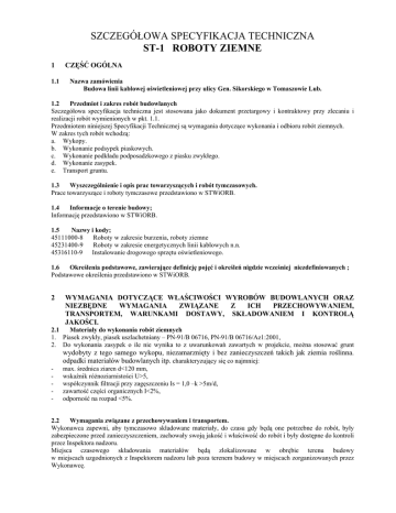 SZCZEGÓŁOWA SPECYFIKACJA TECHNICZNA ST-1 ROBOTY ZIEMNE 1 1.1 CZĘŚĆ OGÓLNA Nazwa zamówienia Budowa linii kablowej oświetleniowej przy ulicy Gen. Sikorskiego w Tomaszowie Lub. 1.2 Przedmiot i zakres robót budowlanych Szczegółowa specyfikacja techniczna jest stosowana jako dokument przetargowy i kontraktowy przy zlecaniu i realizacji robót wymienionych w pkt. 1.1. Przedmiotem niniejszej Specyfikacji Technicznej są wymagania dotyczące wykonania i odbioru robót ziemnych. W zakres tych robót wchodzą: a. Wykopy. b. Wykonanie podsypek piaskowych. c. Wykonanie podkładu podposadzkowego z piasku zwykłego. d. Wykonanie zasypek. e. Transport gruntu. 1.3 Wyszczególnienie i opis prac towarzyszących i robót tymczasowych. Prace towarzyszące i roboty tymczasowe przedstawiono w STWiORB. 1.4 Informacje o terenie budowy; Informację przedstawiono w STWiORB. 1.5 Nazwy i kody; 45111000-8 Roboty w zakresie burzenia, roboty ziemne 45231400-9 Roboty w zakresie energetycznych linii kablowych n.n. 45316110-9 Instalowanie drogowego sprzętu oświetleniowego. 1.6 Określenia podstawowe, zawierające definicję pojęć i określeń nigdzie wcześniej niezdefiniowanych ; Podstawowe określenia przedstawiono w STWiORB. 2 WYMAGANIA DOTYCZĄCE WŁAŚCIWOŚCI WYROBÓW BUDOWLANYCH ORAZ NIEZBĘDNE WYMAGANIA ZWIĄZANE Z ICH PRZECHOWYWANIEM, TRANSPORTEM, WARUNKAMI DOSTAWY, SKŁADOWANIEM I KONTROLĄ JAKOŚCI. 2.1 Materiały do wykonania robót ziemnych 1. Piasek zwykły, piasek uszlachetniany – PN-91/B 06716, PN-91/B 06716/Az1:2001, 2. Do wykonania zasypek o ile nie wynika to z uwarunkowań zawartych w projekcie, moŜna stosować grunt wydobyty z tego samego wykopu, niezamarznięty i bez zanieczyszczeń takich jak ziemia roślinna. odpadki materiałów budowlanych itp. charakteryzujący się co najmniej: - max. średnica ziaren d<120 mm, wskaźnik róŜnoziarnistości U>5, współczynnik filtracji przy zagęszczeniu Is = 1,0 –k >5m/d, zawartość części organicznych I<2%, odporność na rozpad <5%. 2.2 Wymagania związane z przechowywaniem i transportem. Wykonawca zapewni, aby tymczasowo składowane materiały, do czasu gdy będą one potrzebne do robót, były zabezpieczone przed zanieczyszczeniem, zachowały swoją jakość i właściwość do robót i były dostępne do kontroli przez Inspektora nadzoru. Miejsca czasowego składowania materiałów będą zlokalizowane w obrębie terenu budowy w miejscach uzgodnionych z Inspektorem nadzoru lub poza terenem budowy w miejscach zorganizowanych przez Wykonawcę. Grunty uzyskane przy wykonywaniu wykopów powinny być przez Wykonawcę wykorzystane w maksymalnym stopniu do zasypek. Grunty przydatne do budowy nasypów mogą być wywiezione poza teren budowy tylko wówczas, gdy stanowią nadmiar objętości robót ziemnych i za zezwoleniem Inspektora nadzoru. JeŜeli grunty przydatne, uzyskane przy wykonaniu wykopów, nie będące nadmiarem objętości robót ziemnych, zostały za zgodą Inspektora nadzoru wywiezione przez Wykonawcę poza teren budowy z przeznaczeniem innym niŜ budowa nasypów lub wykonanie prac objętych kontraktem, Wykonawca jest zobowiązany do dostarczenia równowaŜnej objętości gruntów przydatnych ze źródeł własnych, zaakceptowanych przez Inspektora nadzoru. Grunty i materiały nieprzydatne do budowy nasypów, powinny być wywiezione przez Wykonawcę na odkład. Zapewnienie terenów na odkład naleŜy do obowiązków Zamawiającego, o ile nie określono tego inaczej w kontrakcie. Inspektor nadzoru moŜe nakazać pozostawienie na terenie budowy gruntów, których czasowa nieprzydatność wynika jedynie z powodu zamarznięcia lub nadmiernej wilgotności. 3 WYMAGANIA DOTYCZĄCE SPRZĘTU I MASZYN NIEZBĘDNYCH DO WYKONANIA ROBÓT BUDOWLANYCH ZGODNIE Z ZAŁOśONĄ JAKOŚCIĄ Roboty moŜna wykonać ręcznie lub przy uŜyciu dowolnego typu sprzętu przy zachowaniu warunków ogólnych określonych w STWiORB. Wykonawca przystępujący do wykonani robót ziemnych powinien wykazać się moŜliwością korzystania z następującego sprzętu do: - odspajania i wydobywania gruntów (narzędzia mechaniczne, młoty pneumatyczne, koparki, ładowarki, wiertarki mechaniczne itp.), - jednoczesnego wydobywania i przemieszczania gruntów (spycharki, zgarniarki, równiarki, itp.), - sprzętu zagęszczającego (walce, ubijaki, płyty wibracyjne itp.). 4 WYMAGANIA DOTYCZĄCE ŚRODKÓW TRANSPORTU Do transportu moŜna stosować dowolny sprzęt transportowy przy zachowaniu warunków ogólnych określonych w STWiORB. Materiały naleŜy umieścić równomiernie na całej powierzchni ładunkowej i zabezpieczyć przed spadaniem lub przesuwaniem. 5 WYMAGANIA DOTYCZĄCE WYKONANIA ROBÓT BUDOWLANYCH 5.1 Wykonanie wykopów 1. Sprawdzenie zgodności warunków terenowych z projektowymi Przed przystąpieniem do wykonywania wykopów przed budową obiektu naleŜy sprawdzić zgodność rzędnych terenu z danymi podanymi w projekcie. W tym celu naleŜy wykonać kontrolny pomiar sytuacyjno-ysokościowy. W trakcie realizacji wykopów konieczne jest kontrolowanie warunków gruntowych w nawiązaniu do badań geologicznych. 2. Zabezpieczenie skarp wykopów JeŜeli w dokumentacji technicznej nie określono inaczej dopuszcza się stosowanie następujących bezpiecznych nachyleń skarp: - w gruntach spoistych (gliny, iły) o nachyleniu 2:1 - w gruntach małospoistych i słabych gruntach spoistych o nachyleniu 1:1,25 - w gruntach sypkich (piaski) o nachyleniu 1:1,5. W wykopach ze skarpami o bezpiecznym nachyleniu powinny być stosowane następujące zabezpieczenia: - w pasie terenu przylegającym do górnej krawędzi wykopu na szerokości równej 3-krotnej głębokości wykopu powierzchnia powinna być wolna od nasypów i materiałów, oraz mieć spadki umoŜliwiające odpływ wód opadowych, - naruszenie stanu naturalnego skarpy jak np. rozmycie przez wody opadowe powinno być usuwane z zachowaniem bezpiecznych nachyleń, - stan skarp naleŜy okresowo sprawdzać w zaleŜności