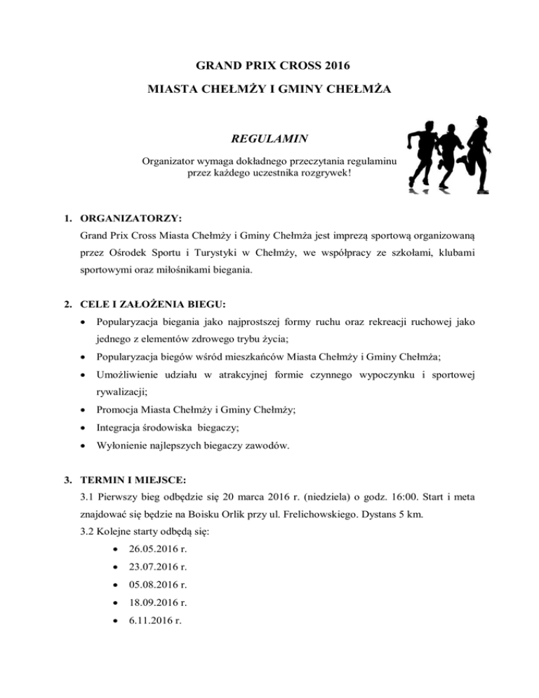 GRAND PRIX CROSS 2016 MIASTA CHEŁMŻY I GMINY CHEŁMŻA REGULAMIN Organizator wymaga dokładnego przeczytania regulaminu przez każdego uczestnika rozgrywek! 1. ORGANIZATORZY: Grand Prix Cross Miasta Chełmży i Gminy Chełmża jest imprezą sportową organizowaną przez Ośrodek Sportu i Turystyki w Chełmży, we współpracy ze szkołami, klubami sportowymi oraz miłośnikami biegania. 2. CELE I ZAŁOŻENIA BIEGU: Popularyzacja biegania jako najprostszej formy ruchu oraz rekreacji ruchowej jako jednego z elementów zdrowego trybu życia; Popularyzacja biegów wśród mieszkańców Miasta Chełmży i Gminy Chełmża; Umożliwienie udziału w atrakcyjnej formie czynnego wypoczynku i sportowej rywalizacji; Promocja Miasta Chełmży i Gminy Chełmży; Integracja środowiska biegaczy; Wyłonienie najlepszych biegaczy zawodów. 3. TERMIN I MIEJSCE: 3.1 Pierwszy bieg odbędzie się 20 marca 2016 r. (niedziela) o godz. 16:00. Start i meta znajdować się będzie na Boisku Orlik przy ul. Frelichowskiego. Dystans 5 km. 3.2 Kolejne starty odbędą się: 26.05.2016 r. 23.07.2016 r. 05.08.2016 r. 18.09.2016 r. 6.11.2016 r. 3.3 Szczegóły będą podane z wyprzedzeniem na stronach internetowych: www.osit.chelmza.pl ; www.facebook.com/Sportowa Chełmża oraz www.chelmza.pl. 4. WARUNKI UDZIAŁU: 4.1 Udział w zawodach może wziąć każdy pełnoletni zawodnik, który zgłosi się do biegu poprzez formularz zgłoszeniowy oraz podpisze własnoręcznie oświadczenie o starcie w biegu na własną odpowiedzialność. 4.2 Osoby niepełnoletnie zobowiązane są do posiadania pozwolenia na udział w zawodach od rodziców lub prawnych opiekunów z ich podpisem. 4.3 Każdy pełnoletni uczestnik w dniu zawodów dokonuje opłaty startowej- 5 zł. 4.4 Uczestnicy ponadto wyrażają zgodę na przetwarzanie danych osobowych dla potrzeb wewnętrznych organizatora oraz na wykorzystanie ich wizerunku w celu promocji cyklu Grand Prix Cross Miasta Chełmży i Gminy Chełmża oraz dokumentowania zawodów. 5. ZGŁOSZENIA: 5.1 Zgłoszenia można dokonywać telefonicznie pod nr 600330896 (sms z: imieniem i nazwiskiem, adresem zamieszkania, datą urodzenia, przynależnością klubową, rozmiarem koszulki), na 3 dni przed startem zawodów (np.: jeśli zawody są w niedzielę, to zapisy trwają do czwartku 23:59). 5.2 Formularz zgłoszeniowy należy pobrać ze strony www.osit.chelmza.pl lub www.chelmza.pl i czytelnie wypisać. 5.3 Wypełniony formularz, zawodnik dostarcza najpóźniej na 30 min przed zawodami (np.: jeśli start jest w niedzielę o 15:00, to o 14:30). 6. KLASYFIKACJA PUNKTOWA: 6.1 Warunkiem sklasyfikowania w klasyfikacji końcowej Grand Prix Cross Miasta Chełmży i Gminy Chełmża jest udział w co najmniej 3 z 6 biegów. Do klasyfikacji końcowej będzie się liczyć 3 najlepszych. 6.2 W Grand Prix Cross Miasta Chełmży i Gminy Chełmża będą prowadzone następujące klasyfikacje: a) Kobiety: - do lat 18 - do lat 40 - powyżej 40 lat b) Mężczyźni: - do lat 18 - do lat 40 - powyżej 40 lat 6.3 Punktacja: Pierwszy zawodnik danej edycji Grand Prix otrzymuje 1 punkt, drugi 2 punkty, trzeci 3 punkty i tak dalej, aż do ostatniego zawodnika, który ukończył bieg w danej edycji biegu, Suma zdobytych punktów w poszczególnych edycjach biegów zadecyduje o zajętym miejscu w końcowej klasyfikacji, Do klasyfikacji końcowej zaliczone będą punkty z trzech edycji, w których zawodnik uzyskał najniższą liczbę punktów, Zwycięzcą zostaje osoba, która uzbiera najmniejszą liczbę punktów uwzględniając wyniki z 3 biegów. 7. NAGRODY: 7.1 Na zakończenie Grand Prix Cross Miasta Chełmży i Gminy Chełmża zawodnicy otrzymają: Pamiątkowe medale i koszulki dla sklasyfikowanych zawodników (ukończone 3 edycje biegu); Puchary za I – III miejsce w poszczególnych kategoriach. 8. POSTANOWIENIA KOŃCOWE: Zawody odbywać się będą bez względu na warunki atmosferyczne; Zawody odbywać się będą przy ruchu otwartym i należy dostosować się do kodeksu drogowego; Organizator nie ubezpiecza zawodników na czas biegów; Obowiązek ubezpieczenia od następstw nieszczęśliwych wypadków leży w gestii zawodników; Uczestnik startuje wyłącznie na własną odpowiedzialność; Uczestnicy mają obowiązek podczas trwania biegu zachowania zasad fair play; Organizator nie odpowiada za rzeczy pozostawione bez opieki; Młodzież poniżej 18 roku życia startuje za pisemną zgodą rodzica/opiekuna; W sprawach interpretacji niniejszego regulaminu i nieobjętych regulaminem ostatecznie rozstrzyga organizator; Organizator zastrzega sobie prawo do zmiany regulaminu.