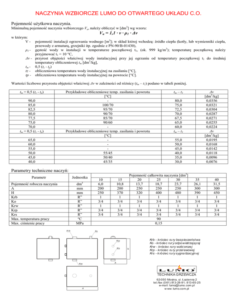 NACZYNIA WZBIORCZE LUMO DO OTWARTEGO UKŁADU C.O. Pojemność uŜytkowa naczynia. Minimalną pojemność naczynia wzbiorczego Vu, naleŜy obliczyć w [dm3] wg wzoru: Vu = 1,1 · v · ρ1 · ∆v w którym: V- pojemność instalacji ogrzewania wodnego [m3]; w skład której wchodzą: źródło ciepła (kotły, lub wymienniki ciepła, przewody z armaturą, grzejniki itp. zgodnie z PN-90/B-01430), ρ1 - gęstość wody w instalacji w temperaturze początkowej t1, (ok. 999 kg/m3); temperaturę początkową naleŜy przyjmować t1 = 10 °C, ∆v - przyrost objętości właściwej wody instalacyjnej przy jej ogrzaniu od temperatury początkowej t1 do średniej temperatury obliczeniowej tm [dm3/kg], tm - 0,5 (tz - tp) tz - obliczeniowa temperatura wody instalacyjnej na zasilaniu [°C], tp - obliczeniowa temperatura wody instalacyjnej na powrocie [°C]. Wartości liczbowe przyrostu objętości właściwej ∆v w zaleŜności od róŜnicy (tm – t1) podano w tabeli poniŜej. tm = 0,5 (tz - tp) 90,0 85,0 82,5 80,0 77,5 75,0 70,0 tm = 0,5 (tz - tp) 65,0 60,0 55,0 50,0 45,0 40,0 Przykładowe obliczeniowe temp. zasilania i powrotu [°C] 100/70 95/70 90/70 85/70 90/60 Przykładowe obliczeniowe temp. zasilania i powrotu [°C] 55/45 50/40 45/35 tm – t1 ∆v [dm3/kg] 0,0356 0,0321 0,0304 0,0287 0,0271 0,0255 0,0224 ∆v [dm3/kg] 0,0195 0,0168 0,0142 0,0118 0,0096 0,0076 80,0 75,0 72,5 70,0 67,5 65,0 60,0 tm – t1 55,0 50,0 45,0 40,0 35,0 30,0 Parametry techniczne naczyń: Jednostka 10 6,0 200 250 1 3/4 1 3/4 3/4 dm3 mm mm R” R” R” R” R” ºC MPa Pojemność robocza naczynia A H Krb Ko Krw Krp Krs Max. temperatura pracy Max. ciśnienie pracy Krb 15 10,8 200 370 1 3/4 1 3/4 3/4 Pojemność całkowita naczynia [dm3] 20 25 30 13,7 18,7 23,7 250 250 250 320 400 480 1 1 1 3/4 3/4 3/4 1 1 1 3/4 3/4 3/4 3/4 3/4 3/4 90 0,15 35 26,1 300 390 1 3/4 1 3/4 3/4 Ko Krp Krs Krw H Parametr Krb - króciec ru ry bezpieczeństwa Ko - króciec rur y odpow ietrzającej Krw - króciec rury wzbi orczej Krp - króciec ru ry przel ewowej Krs - k róciec rury sygna lizacyjn ej A TECHNIKA GRZEWCZA A 62-050 Mosina, ul. Łazienna 2 tel./fax (0 61) 813-28-91; 813-65-25 e-ma il: [email protected] w ww: lumo.com.pl 40 31,5 300 450 1 3/4 1 3/4 3/4 Przykłady instalacji zgodnie z PN-91/B-02413: Odpowietrzenie instalacji wg PN-91/B-02420 R O - rura odpowietrzająca R B - rura bezpiec zeństwa R W - rura wzbiorc za R P - rura przelewowa R S - rura sygnalizacyjna 1 - termometr 2 - manom etr 3 - kocioł c.o. 4 - odpływ kanalizacyjny 5 - pompa mecha niczna 6 - grzejnik 7 - gło wica termostatyczna 8 - hydrom etr RB RO RW RP RS 7 RB 6 RW 8 4 1 2 2 3 5 RO Odp owietrz enie in stalacji wg PN-91/B -02420 RB RS RW RP 7 6 8 1 2 2 4 1 1 3 1 3 5 RO - rura odpow ietrzająca RB - rura bezpieczeństwa RW - rura wzbiorcza RP - rur a przelewowa RS - rura sygnalizacyjna 1 - termometr 2 - manometr 3 - kocioł c.o. 4 - odpł yw kanalizacyjny 5 - pompa mechaniczna 6 - grzejnik 7 - głowica term ostatycz na 8 - hydrometr Umieszczenie naczynia wzbiorczego. Naczynie wzbiorcze powinno być umieszczone na takiej wysokości, aby podczas pracy instalacji w Ŝadnym punkcie jej obiegów wodnych nie nastąpiła przerwa w przepływie wody oraz tak, aby istniała moŜliwość odpowietrzenia instalacji zgodnie z normą PN91/B-02420. Wysokość połoŜenia naczynia wzbiorczego H, w m, określana jest przy rozdziale górnym – od najwyŜszego punktu obiegu wody do dna naczynia wzbiorczego, a przy rozdziale dolnym – od wierzchu najwyŜej połoŜonego grzejnika do dna naczynia. Wysokość H, w m, powinna wynosić: a). W instalacjach ogrzewań wodnych grawitacyjnych oraz pompowych z pompami obiegowymi zamontowanymi na zasilaniu: H ≥ 0,3 m b). W instalacjach ogrzewań wodnych pompowych z pompami obiegowymi o wysokości podnoszenia Hp, w m, zamontowanymi na powrocie: H ≥ 0,7 Hp Przy wymiennikach ciepła, wysokość H moŜna zmniejszyć o wielkość równowaŜną spadkowi ciśnienia wody instalacyjnej w wymienniku. Naczynie wzbiorcze powinno być umieszczone nad źródłem ciepła przy pionowym prowadzeniu rur bezpieczeństwa.