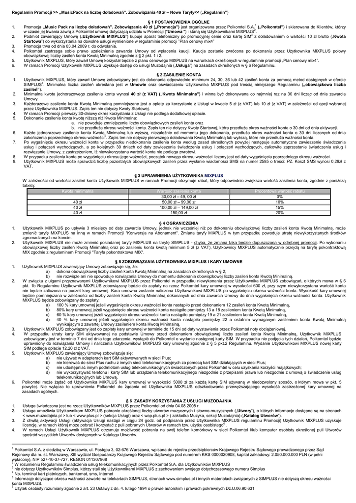 SIMPLUS . Minimalna liczba zasileń określana jest w Umowie oraz oświadczeniu Użytkownika MIXPLUS pod treścią niniejszego Regulaminu („obowiązkowa liczba