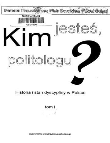 Historia i stan dyscypliny w Polsce tom I Wydawnictwo Uniwersytetu Jagiellońskiego Spis treści Wstęp 7 Rozdział I - Politologia? Czyli wiedza o czym? 1 jaka? 13 1. Filozofia 2. Historia 3. Nauka o polityce (science) 4. Praktyka polityczna 14 16 18 31 Rozdział 11 - Powstanie i przekształcanie się nauk politycznych w Polsce 33 1. Początki refleksji nad polityką w Polsce 2. Historia nauczania „umiejętności politycznych" na ziemiach polskich 3. Nauka o polityce jako dyscyplina akademicka w okresie 11 Rzeczypospolitej 3.1. Ośrodek lwowski - Szkoła Nauk Politycznych (1902-1905), Studium Dyplomatyczne (1930-1939) 3.2. Ośrodek krakowski - Polska Szkoła Nauk Politycznych (1911-1914), Szkoła Nauk Politycznych (1921-1939), Szkoła Nauk Społeczno-Politycznych (1911-1914) 3.3. Ośrodek warszawski - Szkoła Nauk Społecznych i Handlowych (1915-1916), Szkoła Nauk Politycznych (1917-1939) 33 35 40 40 43 48 3.4. Inne ośrodki o profilu politologicznym 3.5. Warunki rozwoju nauki o polityce do 1939 roku 4. Stan refleksji nad polityką w czasie drugiej wojny światowej i po jej zakończeniu... 5. Wprowadzenie polityczno-ideologicznych przedmiotów nauczania 6. Rozwój instytucjonalny - nauki polityczne jako samodzielna dyscyplina uniwersytecka 6.1. Specyfika politologii w Uniwersytecie Warszawskim 6.2. Kontynuacja politologii w Uniwersytecie Jagiellońskim 6.3. Początki i rozwój politologii w Uniwersytecie Wrocławskim 52 56 58 63 6.4. Charakter politologii w Uniwersytecie im. Adama Mickiewicza w Poznaniu 6.5. Politologia w Lublinie - Uniwersytet im. Marii Curie-Skłodowskiej 6.6. Rozwój politologii w Uniwersytecie Śląskim w Katowicach 6.7. Powstanie i funkcjonowanie politologii w innych ośrodkach 7. Powstanie korporacji naukowej - Polskie Towarzystwo Nauk Politycznych (PTNP)... 8. Kondycja polskiej politologii marksistowskiej w latach osiemdziesiątych 9. Przemiany społeczno-polityczne, odrodzenie się nauk politycznych 95 98 101 103 107 115 133 Rozdział III - Studia politologiczne w Polsce po 1989 roku 145 1. Wstęp 2. Nauka i szkolnictwo wyższe w Polsce po 1989 roku 145 149 75 84 87 91 6 Kim jesteś, politologu? Historia i stan dyscypliny w Polsce 2.1. Wprowadzenie 2.2. Prawne aspekty zmian systemu szkolnictwa wyższego po 1989 roku 2.3. Uczelnie, kierunki studiów, studenci i absolwenci szkół wyższych po 1989 roku 2.4. Kadra dydaktyczno-naukowa po 1989 roku 2.5. Finansowanie nauki i szkolnictwa wyższego po 1989 roku 3. Studia politologiczne w uczelniach publicznych i niepublicznych 4. Studenci, absolwenci i kandydaci studiów politologicznych w latach 1989-2008 .... 4.1. Studenci i absolwenci politologii w Polsce w latach 1989-2008 4.1.1. Studenci i absolwenci politologii - dane podstawowe 4.1.2. Studenci i absolwenci politologii w Polsce według rodzaju uczelni i trybu studiów 4.1.3. Studenci politologii według województw w latach 2001-2008 4.1.4. Studenci pierwszego roku politologii oraz studenci studiów uzupełniających magisterskich 4.2. Studenci politologii na tle kierunków pokrewnych w latach 1989-2008 4.2.1. Studenci politologii, administracji i ekonomii 4.2.2. Studenci politologii, psychologii i socjologii 4.2.3. Studenci politologii, dziennikarstwa i komunikacji społecznej, europeistyki, kulturoznawstwa oraz stosunków międzynarodowych 4.3. Kandydaci na studia politologiczne i inne wybrane kierunki w latach 2001-2009 4.4. Sytuacja absolwentów politologii na rynku pracy w świetle danych 149 151 156 163 168 171 174 174 174 178 187 189 194 195 197 199 202 urzędów pracy 5. Kadra politologiczna po 1989 roku 5.1. Politolodzy w świetle danych Ośrodka Przetwarzania Informacji 5.2. Doktoraty i habilitacje z zakresu nauk o polityce 5.3. Mapa zainteresowań badawczych politologów 206 210 210 214 219 6. Treści kształcenia na kierunku politologia 6.1. Treści kształcenia na kierunku politologia po 1989 roku w świetle minimów programowych 6.2. Treści programowe realizowane obecnie na kierunku politologia 6.3. Politologiczne specjalności kierunkowe 7. Jakość kształcenia na studiach politologicznych - próba oszacowania 7.1. Narzędzia i mechanizmy oceny jakości kształcenia 7.2. Ocena jakości studiów politologicznych w świetle danych Państwowej Komisji Akredytacyjnej 228 228 235 243 249 249 8. Wnioski 260 Aneks I - Podstawowe statystyki 267 Aneks II - Studenci politologii według województw w latach 1989-2008 287 Spisy tabel, wykresów i rysunków 307 Bibliografia 311 Biogramy autorów 333 254