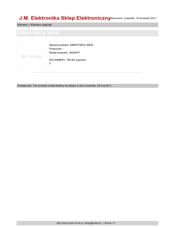 J.M. Elektronika Sklep ElektronicznyUtworzono: czwartek, 15 wrzesień 2011 Kamery > Kamery osprzęt OBROTNICA WEW. Nazwa produktu: OBROTNICA WEW. Producent: Model produktu: JK208YT No image DO KAMERY TELSA wyprzed. 2 Dostępność: Ten produkt został dodany do sklepu w dniu czwartek, 26 maj 2011 http://www.jmele.home.pl | [email protected] | | Strona 1/1