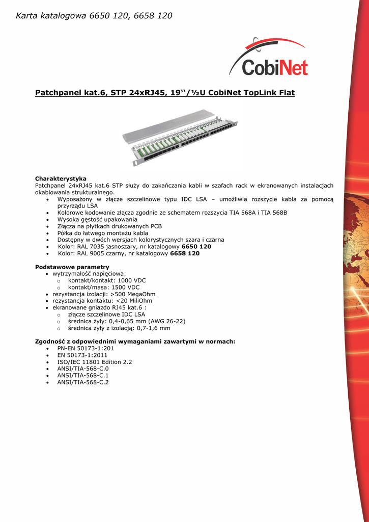 Karta katalogowa 6650 120, 6658 120 Patchpanel kat.6, STP 24xRJ45, 19‘‘/½U CobiNet TopLink Flat Charakterystyka Patchpanel 24xRJ45 kat.6 STP służy do zakańczania kabli w szafach rack w ekranowanych instalacjach okablowania strukturalnego. Wyposażony w złącze szczelinowe typu IDC LSA – umożliwia rozszycie kabla za pomocą przyrządu LSA Kolorowe kodowanie złącza zgodnie ze schematem rozszycia TIA 568A i TIA 568B Wysoka gęstość upakowania Złącza na płytkach drukowanych PCB Półka do łatwego montażu kabla Dostępny w dwóch wersjach kolorystycznych szara i czarna Kolor: RAL 7035 jasnoszary, nr katalogowy 6650 120 Kolor: RAL 9005 czarny, nr katalogowy 6658 120 Podstawowe parametry wytrzymałość napięciowa: o kontakt/kontakt: 1000 VDC o kontakt/masa: 1500 VDC rezystancja izolacji: >500 MegaOhm rezystancja kontaktu: <20 MiliOhm ekranowane gniazdo RJ45 kat.6 : o złącze szczelinowe IDC LSA o średnica żyły: 0,4-0,65 mm (AWG 26-22) o średnica żyły z izolacją: 0,7-1,6 mm Zgodność z odpowiednimi wymaganiami zawartymi w normach: PN-EN 50173-1:201 EN 50173-1:2011 ISO/IEC 11801 Edition 2.2 ANSI/TIA-568-C.0 ANSI/TIA-568-C.1 ANSI/TIA-568-C.2