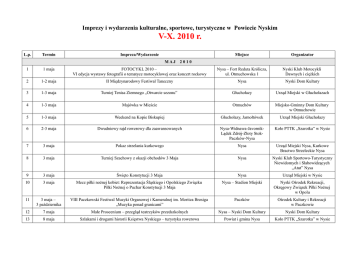 Imprezy i wydarzenia kulturalne, sportowe, turystyczne w Powiecie Nyskim V-X. 2010 r. L.p. Termin Impreza/Wydarzenie MAJ Miejsce Organizator 2010 1 1 maja FOTOCYKL 2010 – VI edycja wystawy fotografii o tematyce motocyklowej oraz koncert rockowy Nysa – Fort Reduta Królicza, ul. Otmuchowska 1 Nyski Klub Motocykli Dawnych i ciężkich 2 1-2 maja II Międzynarodowy Festiwal Taneczny Nysa Nyski Dom Kultury 3 1-3 maja Turniej Tenisa Ziemnego „Otwarcie sezonu” Głuchołazy Urząd Miejski w Głuchołazach 4 1-3 maja Majówka w Mieście Otmuchów Miejsko-Gminny Dom Kultury w Otmuchowie 5 1-3 maja Weekend na Kopie Biskupiej Głuchołazy, Jarnołtówek Urząd Miejski Głuchołazy 6 2-3 maja Dwudniowy rajd rowerowy dla zaawansowanych Nysa-Widnawa-JavornikLądek Zdrój-Złoty StokPaczków-Nysa Koło PTTK „Szarotka” w Nysie 7 3 maja Pokaz strzelania kurkowego Nysa Urząd Miejski Nysa, Kurkowe Bractwo Strzeleckie Nysa 8 3 maja Turniej Szachowy z okazji obchodów 3 Maja Nysa Nyski Klub Sportowo-Turystyczny Niewidomych i Słabowidzących „Atut” Nysa 9 3 maja Święto Konstytucji 3 Maja Nysa Urząd Miejski w Nysie 10 3 maja Mecz piłki nożnej kobiet: Reprezentacja Śląskiego i Opolskiego Związku Piłki Nożnej o Puchar Konstytucji 3 Maja Nysa – Stadion Miejski Nyski Ośrodek Rekreacji, Okręgowy Związek Piłki Nożnej w Opolu 11 3 maja – 3 października VIII Paczkowski Festiwal Muzyki Organowej i Kameralnej im. Moritza Brosiga „Muzyka ponad granicami” Paczków Ośrodek Kultury i Rekreacji w Paczkowie 12 7 maja Małe Proscenium – przegląd teatrzyków przedszkolnych Nysa – Nyski Dom Kultury Nyski Dom Kultury 13 8 maja Szlakami i drogami historii Księstwa Nyskiego – turystyka rowerowa Powiat i gmina Nysa Koło PTTK „Szarotka” w Nysie 14 8-31 maja „Nysa na dawnej pocztówce”- wystawa Czytelnia czasopism MiGBP w Nysie Miejska i Gminna Biblioteka Publiczna w Nysie 15 9 maja XI Ogólnopolski Turniej Tańca Towarzyskiego „Senior Hobby 2010” Ośrodek Caritas „Skowronek” Głuchołazy Spółdzielnia Mieszkaniowa Lokatorsko-Własnościowa w Nysie 16 9 maja Dzień Europejski Korfantów Miejsko-Gminny Ośrodek Kultury, Sportu i Rekreacji w Korfantowie 17 9 maja Otwarcie Szlaku Marii Luizy Merkert Miasto i gmina Nysa Urząd Miejski w Nysie 18 12 maja „Mój teatrzyk” - VI konkurs Teatrzyków Dziecięcych Paczków Ośrodek Kultury i Rekreacji w Paczkowie 19 13-14 maja Juwenalia Nysa PWSZ w Nysie 20 15 maja III Nyska Noc Skarbów Muzeum w Nysie Muzeum w Nysie 21 15 maja XIV Mistrzostwa Polski w Szachach Aktywnych Nysa – Młodzieżowy Ośrodek Wychowawczy Młodzieżowy Ośrodek Wychowawczy 22 15 maja Spektakl „Łysa śpiewaczka” w wykonaniu teatru „Ostatni Rząd” Nyski Dom Kultury Nyski Dom Kultury 23 19-20 maja Powiatowy Festiwal Amatorskiej Twórczości Dziecięcej Otmuchów Miejsko-Gminny Dom Kultury w Otmuchowie 24 21 maja XI Powiatowe Spotkania Dziecięcych Zespołów Teatralnych Paczków Ośrodek Kultury i Rekreacji w Paczkowie 25 22 maja Dzień Matki – Koncert w wykonaniu uczniów Państwowej Szkoły Muzycznej w Nysie Nyski Dom Kultury Nyski Dom Kultury 26 23 maja Wypad rowerowy na łowienie pstrąga Nysa-Grądy-Nysa Koło PTTK „Szarotka” w Nysie 27 23 maja XXI Ogólnopolski Wyścig Kolarski po Ziemi Korfantowskiej „Memoriał Erwina Chmiela” - Puchar Polski dla kat. Orlika Gmina Korfantów Miejsko-Gminny Ośrodek Kultury, Sportu i Rekreacji w Korfantowie 28 28 maja X Powiatowe Prezentacje Solistów i Zespołów Wokalnych Paczków Ośrodek Kultury i Rekreacji w Paczkowie 29 28 maja Turniej Tenisa Ziemnego dla dzieci i młodzieży z okazji „Dni Nysy” Nysa – Stadion Miejski Nyski Ośrodek Rekreacji, Urząd Miejski w Nysie 30 28-29 maja „Kolorowe Jarmarki” - prezentacja rękodzieła artystycznego i sztuki nieprofesjonalnej powiatu nyskiego Muzeum w Nysie Muzeum w Nysie 31 28-30 maja Dni Nysy Nysa – Stadion Miejski Urząd Miejski w Nysie, Nyski Dom Kultury 32 28-30 maja XIII Rajd Kolarski „Zdobywamy Pradziada” Karlova Studanka Klub Turystyki Kolarskiej „KTUKOL” w Głuchołazach, Urząd Miejski w Głuchołazach współorganizator 33 29 maja Turniej Międzynarodowy z okazji Dni Nysy w gimnastyce sportowej kobiet Zespół Szkół Sportowych w Nysie Nyskie Towarzystwo Gimnastyczne, Urząd Miejski w Nysie, Zespół Szkół Sportowych w Nysie 34 29 maja „Salon 2010 – 20 lat później” wernisaż wystawy Nyskiej Grupy Artystycznej i zaproszonych gości Muzeum w Nysie Nyska Grupa Artystyczna, Muzeum w Nysie 35 29 maja Dni Nysy – Regaty Kajakowe o Puchar Burmistrza Nysy Rzeka Nysa Kłodzka (Nysa) Koło PTTK „Szarotka” w Nysie 36 29 maja Otwarte Międzynarodowe Mistrzostwa Nysy w Tenisie Stołowym z okazji „Dni Nysy” Zespół Szkół Rolniczych Centrum Kształcenia Ustawicznego w Nysie SKS LUKS Nysa 37 29-30 maja Ogólnopolski Turniej Organizacji Pozarządowych Nysa – Stadion Miejski KS Polonia Nysa, Urząd Miejski w Nysie 38 30 maja Dzień Dziecka – Spacer kajakowy po stawie Nysa - Staw Łabędzi w parku miejskim Koło PTTK „Szarotka” w Nysie 39 30 maja Turniej Piłkarski Oldbojów z okazji „Dni Nysy” o Puchar Burmistrza Nysy Nysa – Stadion Miejski Gminny Związek LKS Nysa, Urząd Miejski w Nysie 40 30 maja – 1 czerwca „Zaczarowany Ekran” - I Paczkowski Festiwal Filmowy dla Dzieci Paczków Ośrodek Kultury i Rekreacji w Paczkowie 41 maj Spływ Kajakowy: Nysa – Lewin Brzeski Rzeka Nysa Kłodzka I Szczep Harcerski „ŚWiT” Nysa CZREWIEC 2010 42 1 czerwca Rozstrzygnięcie konkursu fotograficznego dla młodzieży „Muzeum w obiektywie” otwarcie wystawy pokonkursowej Muzeum w Nysie Muzeum w Nysie 43 1 czerwca „Minilista Przebojów” dla dzieci Nyski Dom Kultury Nyski Dom Kultury 44 1 czerwca „Uśmiech dziecka” - impreza dla dzieci Otmuchów Miejsko-Gminny Dom Kultury w Otmuchowie 45 3-5 czerwca XIV Ogólnopolski Spływ Kajakowy rzeką Nysą Kłodzką Rzeka Nysa Kłodzka (Kłodzko-Nysa) Koło