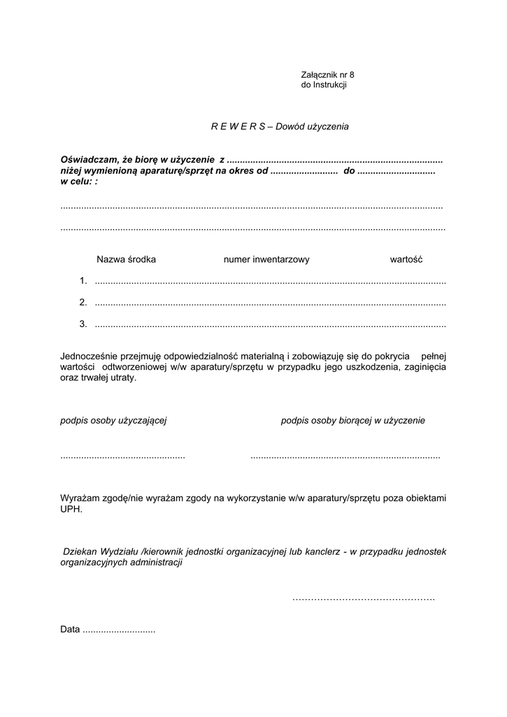 Załącznik nr 8 do Instrukcji R E W E R S – Dowód użyczenia Oświadczam, że biorę w użyczenie z ................................................................................... niżej wymienioną aparaturę/sprzęt na okres od .......................... do .............................. w celu: : ................................................................................................................................................... .................................................................................................................................................... Nazwa środka numer inwentarzowy wartość 1. ....................................................................................................................................... 2. ....................................................................................................................................... 3. ....................................................................................................................................... Jednocześnie przejmuję odpowiedzialność materialną i zobowiązuję się do pokrycia pełnej wartości odtworzeniowej w/w aparatury/sprzętu w przypadku jego uszkodzenia, zaginięcia oraz trwałej utraty. podpis osoby użyczającej ................................................ podpis osoby biorącej w użyczenie ......................................................................... Wyrażam zgodę/nie wyrażam zgody na wykorzystanie w/w aparatury/sprzętu poza obiektami UPH. Dziekan Wydziału /kierownik jednostki organizacyjnej lub kanclerz - w przypadku jednostek organizacyjnych administracji ………………………………………. Data ............................