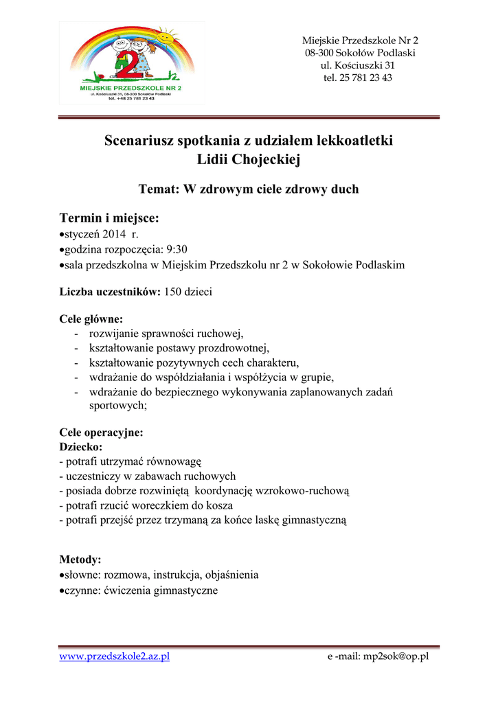 Miejskie Przedszkole Nr 2 08-300 Sokołów Podlaski ul. Kościuszki 31 tel. 25 781 23 43 Scenariusz spotkania z udziałem lekkoatletki Lidii Chojeckiej Temat: W zdrowym ciele zdrowy duch Termin i miejsce: styczeń 2014 r. godzina rozpoczęcia: 9:30 sala przedszkolna w Miejskim Przedszkolu nr 2 w Sokołowie Podlaskim Liczba uczestników: 150 dzieci Cele główne: - rozwijanie sprawności ruchowej, - kształtowanie postawy prozdrowotnej, - kształtowanie pozytywnych cech charakteru, - wdrażanie do współdziałania i współżycia w grupie, - wdrażanie do bezpiecznego wykonywania zaplanowanych zadań sportowych; Cele operacyjne: Dziecko: - potrafi utrzymać równowagę - uczestniczy w zabawach ruchowych - posiada dobrze rozwiniętą koordynację wzrokowo-ruchową - potrafi rzucić woreczkiem do kosza - potrafi przejść przez trzymaną za końce laskę gimnastyczną Metody: słowne: rozmowa, instrukcja, objaśnienia czynne: ćwiczenia gimnastyczne www.przedszkole2.az.pl e -mail: [email protected] Miejskie Przedszkole Nr 2 08-300 Sokołów Podlaski ul. Kościuszki 31 tel. 25 781 23 43 Formy: stałe zespoły- grupa, indywidualne Przybory sportowe: woreczki, laski gimnastyczne, rzeka z wyspami, kamienie fakturowane, ławeczka, kosz, tunel, skakanka, lina PRZEBIEG SPOTKANIA Część wstępna: 1). Otwarcie uroczystości i przywitanie zaproszonych gości przez Panią Dyrektor 2) Uroczyste otwarcie projektu edukacyjnego „W zdrowym ciele zdrowy duch” przez honorowego gością- lekkoatletkę Lidię Chojecką 3) Rozmowa dzieci z Panią Lidią Chojecką o jej osiągnięciach w dziedzinie sportu. a) dzieci zadają pytania, oglądają medale Część główna: 1) Powitanie grup (Nauczyciel prosi dzieci o powstanie i na hasło „Baczność”, „Kolejno odlicz” - dzieci wymieniają nazwę swojej grupy. 2) Rozgrzewka przy piosence „Wesoła gimnastyka” (Nauczycielka zaprasza dzieci do wspólnej rozgrzewki przy piosence: I. „Każdy mądry przedszkolaczek co dzień ćwiczy, biega, skacze. Ty też biegaj, skacz i ćwicz, gdy chcesz zdrowym, silnym być. Ref). Zrób przysiad raz i dwa i podskocz hop- sa - sa Dwa skłony do podłogi, w kolanach zginaj nogi Wyciągnij się do góry, tak jakbyś łapał chmury Zrób kółko bioderkami, poruszaj paluszkami 3) Nauka okrzyku (Przed rozpoczęciem konkurencji sportowych nauczyciel zapoznaje dzieci z hasłem spotkania: „W zdrowym ciele zdrowy duch!” www.przedszkole2.az.pl e -mail: [email protected] Miejskie Przedszkole Nr 2 08-300 Sokołów Podlaski ul. Kościuszki 31 tel. 25 781 23 43 Część główna: 1) Losowanie przez gości zadań do wykonania dla poszczególnych grup przedszkolnych. (Ekspert czyta wylosowane zadanie dla danego zespołu. Pierwszą wylosowana grupa przygotowuje się do wykonania ćwiczeń. Nauczycielki przygotowują niezbędne do wykonania ćwiczeń przybory gimnastyczne. a) Zaplanowane zadania dla grup: - przejście po kamieniach rzecznych (każde dziecko ma za zadanie przejść po kamieniach tak, żeby z nich nie spaść i nie dotknąć nogą podłogi. - przejście po ławeczce z woreczkiem na głowie, - przejście po wijącej się rzece starając się, by nie dotknąć podłogi, - przeskok przez linę ściegiem krzyżykowym, - przejście przez laskę gimnastyczną trzymaną w rękach - rzut woreczkiem do kosza 2) Po zakończeniu każdego ćwiczenia przez wylosowana grupę dzieci jury dokonuje oceny punktowej. (W skład jury wchodzą: Lidia Chojecka – honorowy gość, Olga Rusinek- rodzic, nauczyciel wychowania fizycznego w gimnazjum, Urszula Marcinkowska- dyrektor przedszkola 3) Po każdym wykonanym przez grupę ćwiczeniu- okrzyk dnia. 4) Wręczenie paszportów „Paszport do Zdrowia Mądrego Przedszkolaka” 5) Ślubowanie. - Dzieci i nauczyciele stojąc składają ślubowanie, w którym deklarują chęć podjęcia nowych wyzwań związanych z ruchem, a także dbanie o odpowiedni dobór posiłków. Część końcowa: 1) Zabawy sportowe dla dzieci. tj: - tor przeszkód (Nauczycielka prosi do siebie wszystkie chętne dzieci. Zabawa zaczyna się przejściem przez tunel, następnie www.przedszkole2.az.pl e -mail: [email protected] Miejskie Przedszkole Nr 2 08-300 Sokołów Podlaski ul. Kościuszki 31 tel. 25 781 23 43 przejście po skakance, bieg do pachołka i powrót na linię mety). - przeciąganie liny - zabawy z chustą animacyjną 2) Zabawa z chustą animacyjną - „bilard”. Dzieci trzymają chustę rozłożoną na poziomie pasa. Gdy nauczyciel wrzuca na chustę małą piłeczkę gumową, dzieci zaczynają falować chustą tak, aby piłeczka wpadła do otworu znajdującego się na środku chusty. 3) Poczęstunek w postaci owoców. 4) Podziękowanie za wspólna zabawę. Opracowała: Iwona Flisiuk nauczycielka Miejskiego Przedszkola Nr 2 w Sokołowie Podlaskim www.przedszkole2.az.pl e -mail: [email protected]
