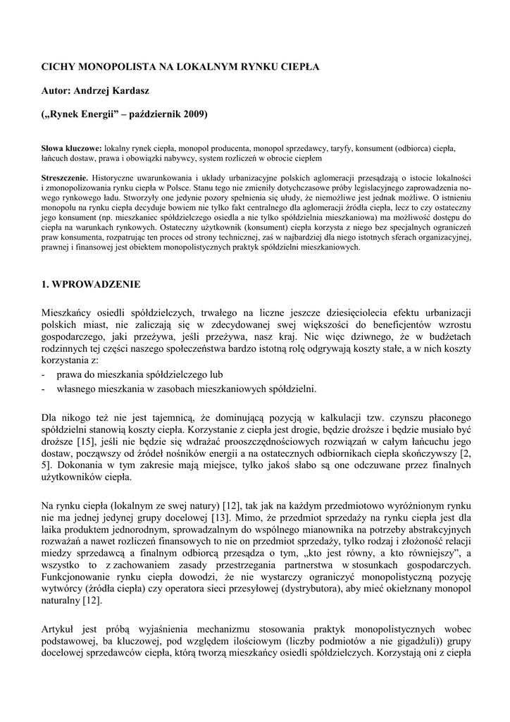 CICHY MONOPOLISTA NA LOKALNYM RYNKU CIEPŁA Autor: Andrzej Kardasz („Rynek Energii” – październik 2009) Słowa kluczowe: lokalny rynek ciepła, monopol producenta, monopol sprzedawcy, taryfy, konsument (odbiorca) ciepła, łańcuch dostaw, prawa i obowiązki nabywcy, system rozliczeń w obrocie ciepłem Streszczenie. Historyczne uwarunkowania i układy urbanizacyjne polskich aglomeracji przesądzają o istocie lokalności i zmonopolizowania rynku ciepła w Polsce. Stanu tego nie zmieniły dotychczasowe próby legislacyjnego zaprowadzenia nowego rynkowego ładu. Stworzyły one jedynie pozory spełnienia się ułudy, Ŝe niemoŜliwe jest jednak moŜliwe. O istnieniu monopolu na rynku ciepła decyduje bowiem nie tylko fakt centralnego dla aglomeracji źródła ciepła, lecz to czy ostateczny jego konsument (np. mieszkaniec spółdzielczego osiedla a nie tylko spółdzielnia mieszkaniowa) ma moŜliwość dostępu do ciepła na warunkach rynkowych. Ostateczny uŜytkownik (konsument) ciepła korzysta z niego bez specjalnych ograniczeń praw konsumenta, rozpatrując ten proces od strony technicznej, zaś w najbardziej dla niego istotnych sferach organizacyjnej, prawnej i finansowej jest obiektem monopolistycznych praktyk spółdzielni mieszkaniowych. 1. WPROWADZENIE Mieszkańcy osiedli spółdzielczych, trwałego na liczne jeszcze dziesięciolecia efektu urbanizacji polskich miast, nie zaliczają się w zdecydowanej swej większości do beneficjentów wzrostu gospodarczego, jaki przeŜywa, jeśli przeŜywa, nasz kraj. Nic więc dziwnego, Ŝe w budŜetach rodzinnych tej części naszego społeczeństwa bardzo istotną rolę odgrywają koszty stałe, a w nich koszty korzystania z: - prawa do mieszkania spółdzielczego lub - własnego mieszkania w zasobach mieszkaniowych spółdzielni. Dla nikogo teŜ nie jest tajemnicą, Ŝe dominującą pozycją w kalkulacji tzw. czynszu płaconego spółdzielni stanowią koszty ciepła. Korzystanie z ciepła jest drogie, będzie droŜsze i będzie musiało być droŜsze [15], jeśli nie będzie się wdraŜać prooszczędnościowych rozwiązań w całym łańcuchu jego dostaw, począwszy od źródeł nośników energii a na ostatecznych odbiornikach ciepła skończywszy [2, 5]. Dokonania w tym zakresie mają miejsce, tylko jakoś słabo są one odczuwane przez finalnych uŜytkowników ciepła. Na rynku ciepła (lokalnym ze swej natury) [12], tak jak na kaŜdym przedmiotowo wyróŜnionym rynku nie ma jednej jedynej grupy docelowej [13]. Mimo, Ŝe przedmiot sprzedaŜy na rynku ciepła jest dla laika produktem jednorodnym, sprowadzalnym do wspólnego mianownika na potrzeby abstrakcyjnych rozwaŜań a nawet rozliczeń finansowych to nie on przedmiot sprzedaŜy, tylko rodzaj i złoŜoność relacji miedzy sprzedawcą a finalnym odbiorcą przesądza o tym, „kto jest równy, a kto równiejszy”, a wszystko to z zachowaniem zasady przestrzegania partnerstwa w stosunkach gospodarczych. Funkcjonowanie rynku ciepła dowodzi, Ŝe nie wystarczy ograniczyć monopolistyczną pozycję wytwórcy (źródła ciepła) czy operatora sieci przesyłowej (dystrybutora), aby mieć okiełznany monopol naturalny [12]. Artykuł jest próbą wyjaśnienia mechanizmu stosowania praktyk monopolistycznych wobec podstawowej, ba kluczowej, pod względem ilościowym (liczby podmiotów a nie gigadŜuli)) grupy docelowej sprzedawców ciepła, którą tworzą mieszkańcy osiedli spółdzielczych. Korzystają oni z ciepła bez zawierania ze sprzedawcą umowy o dostawę tego niezbędnego w naszym klimacie medium. A jest to medium do którego dostęp jest pod szczególną ochroną. Zapisy ustawowe są w tej sprawie jednoznaczne i wyraźne [7]. Coś jest chyba nie tak z tą ochroną i wypełnianiem ustawowych obowiązków przez rządowe i samorządowe ogniwa władzy wykonawczej [8, 9], skoro przykładowy Kowalski z „blokowiska”, nie wie od kogo kupuje ciepło, nie wie ile ma zapłacić za jednostkę zuŜytego ciepła, nie zawsze teŜ płaci za to, co faktycznie pobrał (zuŜył). Sformułowanie tych stwierdzeń tworzy niechciany obraz „gospodarczego bezprawia”, taka jest jednak prawda, skrywana za parawanem wewnętrznych regulaminów spółdzielni mieszkaniowych. To właśnie zapisy tych regulaminów legitymizują stosowanie praktyk monopolistycznych i skutecznie konserwują uznaniowość rozdzielnictwa według urzędniczej wygody, a nie w zgodzie z faktami. 2. OSTATECZNY SPRZEDAWCA CIEPŁA W AGLOMERACJI MIEJSKIEJ Dla przeciętnego „zjadacza sera, czyli ciepła” jest waŜne, aby ciepło było mu dostarczane, czyli dostępne i Ŝeby wiedział, u kogo ma robić larum, gdy pojawiają się jakieś zakłócenia w jego dostawie. Cały kompetencyjno – organizacyjny i jeszcze inny wytwór transformacji dokonywanej dla dobra konsumenta jest konsumentowi raczej obcy i mało potrzebny. Świadczy to o swoistym stanie apatii i zobojętnienia, jest to zjawisko niezwykle ciekawe nie tylko dla socjologów, ma ono swoje dalekosięŜne konsekwencje w sferze stosunków gospodarczych. Z istnieniem tego stanu wiąŜę rozpowszechnione społeczne przyzwolenie na stosowanie praktyk, w innych okolicznościach wywołujących rozległe protesty społeczne. Nie zawsze realizacja dobrych i słusznych intencji, doprowadzając do rozwiązań innych niŜ dotychczasowe, tworzy stany mniej od poprzednich dokuczliwe. Nowe, inne, nie musi oznaczać lepsze. Zdecydowana walka wydana monopolowi naturalnemu w energetyce (w tym takŜe i ciepłownictwie) odniosła sukces, spełniła oczekiwania inicjatorów tej kampanii. Pod nadzorem Regulatora znalazły się przedsiębiorstwa energetyczne czyli wytwórcy i dystrybutorzy ciepła [1]. Jest więc chyba dobrze, o to przecieŜ chodziło w procesie systemowych zmian w polskim kompleksie paliwowo- energetycznym. Jak zwykle, na obrzeŜu dziejowych wydarzeń „zostało wylane dziecko z kąpielą”, zgubiony został prawdziwy a nie wyimaginowany interes finalnego odbiorcy. Obr