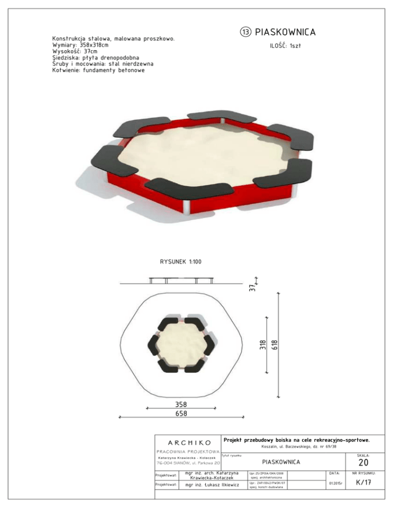 13 Konstrukcja stalowa, malowana proszkowo. Wymiary: 358x318cm Wysokość: 37cm Siedziska: płyta drenopodobna Śruby i mocowania: stal nierdzewna Kotwienie: fundamenty betonowe PIASKOWNICA ILOŚĆ: 1szt 318 618 37 RYSUNEK 1:100 358 658 Projekt przebudowy boiska na cele rekreacyjno-sportowe. Koszalin, ul. Baczewskiego, dz. nr 69/38 SKALA: Tytuł rysunku: 20 PIASKOWNICA Projektował: Projektował: mgr inż. arch. Katarzyna Krawiecka-Kołaczek mgr inż. Łukasz Ilkiewicz Upr.:25/ZPOIA/OKK/2008 specj. architektoniczna DATA: Upr.: ZAP/0042/PWOK/07 specj. konstr-budowlana 01.2015r NR RYSUNKU: K/17