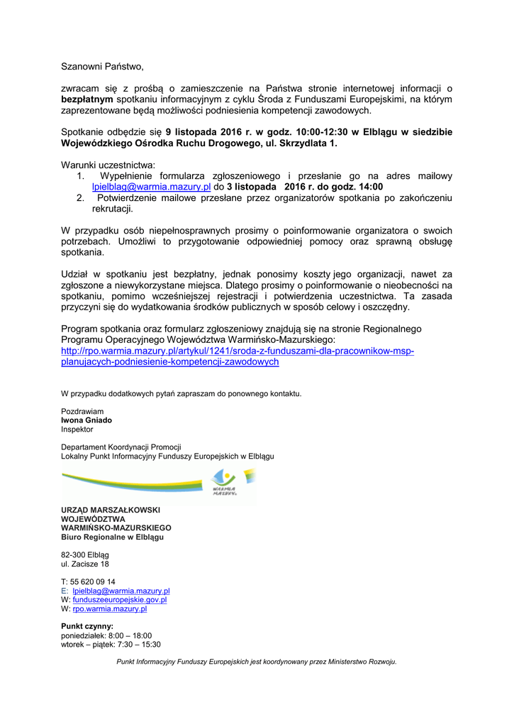 Szanowni Państwo, zwracam się z prośbą o zamieszczenie na Państwa stronie internetowej informacji o bezpłatnym spotkaniu informacyjnym z cyklu Środa z Funduszami Europejskimi, na którym zaprezentowane będą możliwości podniesienia kompetencji zawodowych. Spotkanie odbędzie się 9 listopada 2016 r. w godz. 10:00-12:30 w Elblągu w siedzibie Wojewódzkiego Ośrodka Ruchu Drogowego, ul. Skrzydlata 1. Warunki uczestnictwa: 1. Wypełnienie formularza zgłoszeniowego i przesłanie go na adres mailowy [email protected] do 3 listopada 2016 r. do godz. 14:00 2. Potwierdzenie mailowe przesłane przez organizatorów spotkania po zakończeniu rekrutacji. W przypadku osób niepełnosprawnych prosimy o poinformowanie organizatora o swoich potrzebach. Umożliwi to przygotowanie odpowiedniej pomocy oraz sprawną obsługę spotkania. Udział w spotkaniu jest bezpłatny, jednak ponosimy koszty jego organizacji, nawet za zgłoszone a niewykorzystane miejsca. Dlatego prosimy o poinformowanie o nieobecności na spotkaniu, pomimo wcześniejszej rejestracji i potwierdzenia uczestnictwa. Ta zasada przyczyni się do wydatkowania środków publicznych w sposób celowy i oszczędny. Program spotkania oraz formularz zgłoszeniowy znajdują się na stronie Regionalnego Programu Operacyjnego Województwa Warmińsko-Mazurskiego: http://rpo.warmia.mazury.pl/artykul/1241/sroda-z-funduszami-dla-pracownikow-mspplanujacych-podniesienie-kompetencji-zawodowych W przypadku dodatkowych pytań zapraszam do ponownego kontaktu. Pozdrawiam Iwona Gniado Inspektor Departament Koordynacji Promocji Lokalny Punkt Informacyjny Funduszy Europejskich w Elblągu URZĄD MARSZAŁKOWSKI WOJEWÓDZTWA WARMIŃSKO-MAZURSKIEGO Biuro Regionalne w Elblągu 82-300 Elbląg ul. Zacisze 18 T: 55 620 09 14 E: [email protected] W: funduszeeuropejskie.gov.pl W: rpo.warmia.mazury.pl Punkt czynny: poniedziałek: 8:00 – 18:00 wtorek – piątek: 7:30 – 15:30 Punkt Informacyjny Funduszy Europejskich jest koordynowany przez Ministerstwo Rozwoju. Informacje udzielane przez pracowników Punktu Informacyjnego nie stanowią oficjalnego stanowiska Instytucji Zarządzających, Pośredniczących i Wdrażających poszczególne Programy Operacyjne i nie mogą stanowić podstawy do formułowania jakichkolwiek roszczeń, a także nie stanowią oferty w rozumieniu prawa polskiego. Punkt Informacyjny Funduszy Europejskich ani jego pracownicy nie odpowiadają za błędną interpretację udzielonych informacji, ani za następstwa czynnosci podjętych na ich podstawie. Zachęcamy również do podzielenia się Państwa opiniami dotyczącymi funkcjonowania Sieci - poprzez wysłanie maila na adres [email protected]