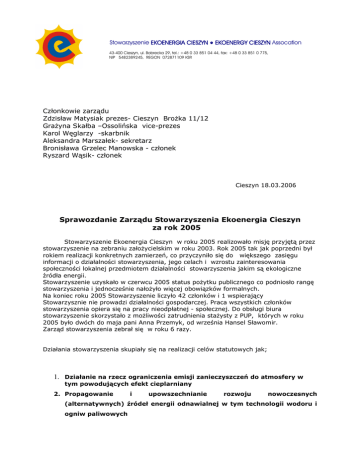 Stowarzyszenie EKOENERGIA CIESZYN ● EKOENERGY CIESZYN Assocation 43-400 Cieszyn, ul. Bobrecka 29, tel.: +48 0 33 851 04 44, fax: +48 0 33 851 0 775, NIP 5482389245, REGON 072871109 KSR Członkowie zarządu Zdzisław Matysiak prezes- Cieszyn Brożka 11/12 Grażyna Skałba –Ossolińska vice-prezes Karol Węglarzy -skarbnik Aleksandra Marszałek- sekretarz Bronisława Grzelec Manowska - członek Ryszard Wąsik- członek Cieszyn 18.03.2006 Sprawozdanie Zarządu Stowarzyszenia Ekoenergia Cieszyn za rok 2005 Stowarzyszenie Ekoenergia Cieszyn w roku 2005 realizowało misję przyjętą przez stowarzyszenie na zebraniu założycielskim w roku 2003. Rok 2005 tak jak poprzedni był rokiem realizacji konkretnych zamierzeń, co przyczyniło się do większego zasięgu informacji o działalności stowarzyszenia, jego celach i wzrostu zainteresowania społeczności lokalnej przedmiotem działalności stowarzyszenia jakim są ekologiczne źródła energii. Stowarzyszenie uzyskało w czerwcu 2005 status pożytku publicznego co podniosło rangę stowarzyszenia i jednocześnie nałożyło więcej obowiązków formalnych. Na koniec roku 2005 Stowarzyszenie liczyło 42 członków i 1 wspierający Stowarzysznie nie prowadzi działalności gospodarczej. Praca wszystkich członków stowarzyszenia opiera się na pracy nieodpłatnej - społecznej. Do obsługi biura stowarzyszenie skorzystało z możliwości zatrudnienia stażysty z PUP, których w roku 2005 było dwóch do maja pani Anna Przemyk, od września Hansel Sławomir. Zarząd stowarzyszenia zebrał się w roku 6 razy. Działania stowarzyszenia skupiały się na realizacji celów statutowych jak; 1. Działanie na rzecz ograniczenia emisji zanieczyszczeń do atmosfery w tym powodujących efekt cieplarniany 2. Propagowanie i upowszechnianie rozwoju nowoczesnych (alternatywnych) źródeł energii odnawialnej w tym technologii wodoru i ogniw paliwowych 3. Prowadzenie działalności zmierzającej do wszechstronnego rozwoju świadomości ekoenergetycznej regionu 4. Wspieranie rozwoju przedsiębiorczości regionu w zakresie wykorzystania alternatywnych źródeł energii odnawialnej Jak realizowaliśmy te cele w 2005roku We współpracy z Agencją Restrukturyzacji i Modernizacji Rolnictwa podjęliśmy współpracę w zakresie rozpowszechnienia wśród rolników stosowania ekologicznych źródeł energii w tym OZE. Projekt był realizowany pod nazwą „100 dachów z kolektorami słonecznymi” Takie spotkania odbyły się w lutym i marcu 2005roku w 10 gminach. Spotkania cieszyły się dużą frekwencją .Spotkania obsługiwane były przez prezesa stowarzyszenia Ekoenergia Cieszyn oraz osoby z Agencji. W trakcie takiego spotkania rolnicy otrzymali pełną informację o zaletach stosowania ekologicznych źródeł energii w tym OZE ze szczególnym uwzględnieniem wpływu używania energii na zanieczyszczenia atmosfery. W drugiej części spotkania otrzymali informację o możliwościach dofinansowania inwestycji ekoenergetycznych z funduszy europejskich. Ze względu na duże zainteresowanie realizacją tego projektu, chcielibyśmy realizować go także w tym roku. Wstępne rozmowy odbyły się z naszym partnerem. Realizacja tego projektu nie była wsparta finansowo. Stowarzyszenie w roku 2005 kontynuowało współpracę z samorządami poprzez realizację grantów. 21.04.2005 II Międzynarodowa Konferencja Młodzieży Szkolnej – Udział w niej wzięli uczniowie szkół z Polski Czech i Słowacji. Konferencja odbyła się w Czeskim Cieszynie w Szkole Rolniczej. Z naszej strony brali w niej udział uczniowie Zespołu Szkól Budowlanych , Zespołu szkół Mechaniczno Elektrycznych. 6-10 .06.2005 Zbuduj Własny Kolektor Słoneczny- edukacja w zakresie stosowania źródeł energii odnawialnej, warsztaty w zakresie budowania własnego kolektora słonecznego. Bardzo piękny projekt. związany ze współpracą międzynarodową Polsko Szwajcarsko, Czesko ,Słowacką. Wydana została broszura opisująca to przedsięwzięcie. Mamy nadzieję ,że będzie kontynuacja tego projektu w roku 2006. Rok 2005 był rokiem dalszego zacieśnienia współpracy transgranicznej pomiędzy naszym stowarzyszeniem a Czeskim stowarzyszeniem TRIANON . Przejawiało się to poprzez wspólną realizację konferencji oraz przystąpienie do wspólnego projektu INTERREG IIIa Czechy Polska. Ta współpraca z akcyjnej formy ma szansę przerodzić się w trwałą zinstytucjonalizowaną współpracę w ramach Regionalnego Centrum Edukacji dla Zrównoważonego Rozwoju. Pierwszym efektem jest zorganizowana w roku 2006 III Międzynarodowa Konferencja w obszarze zrównoważonej energii. Konferencja ta została odnotowana jako wydarzenie w ramach Komisji Europejskiej. Ta współpraca będzie kontynuowana w sposób systematyczny. Stowarzyszenie było zapraszane na spotkania a także było gospodarzem spotkania dotyczącego opracowania ; OPRACOWANIE METODY PROGRAMOWANIA I MODELOWANIA SYSTEMÓW WYKORZYSTANIA ODNAWIALNYCH ŹRÓDEŁ ENERGII NA TERENACH NIEPRZEMYSŁOWYCH WOJEWÓDZTWA ŚLĄSKIEGO, WRAZ Z PROGRAMEM WYKONAWCZYM DLA WYBRANYCH OBSZARÓW WOJEWÓDZTWA W październiku 2005 wspólnie z Krajową Agencją Poszanowania Energii realizowaliśmy program edukacyjny dla nauczycieli w zakresie oszczędzania energii, stosowania OZE energii, dla wszystkich typów szkól z Powiatu Cieszyńskiego. W szkoleniu wzięło udział ok. 80 nauczycieli. Wsparcie organizacyjne uzyskaliśmy od Starosty Powiatu Cieszyńskiego. Szkolenie ukończone zostało uzyskaniem przez nauczycieli certyfikatów . Jesienią roku 2005 miałem przyjemność prezentować dorobek edukacyjny naszego stowarzyszenia na targach Poleko w Poznaniu Eko- Media Forum. Zaproszone zostało nasze stowarzyszenie i mogliśmy za darmo prezentować się na targach. Miałem tam przyjemność wygłoś odczyt o naszych doświadczeniach edukacyjnych przy obecności Starosty Powiatu Cieszyńskiego . Wnioski jakie nasuwają się z pobytu znalazły zrozumienie u władz