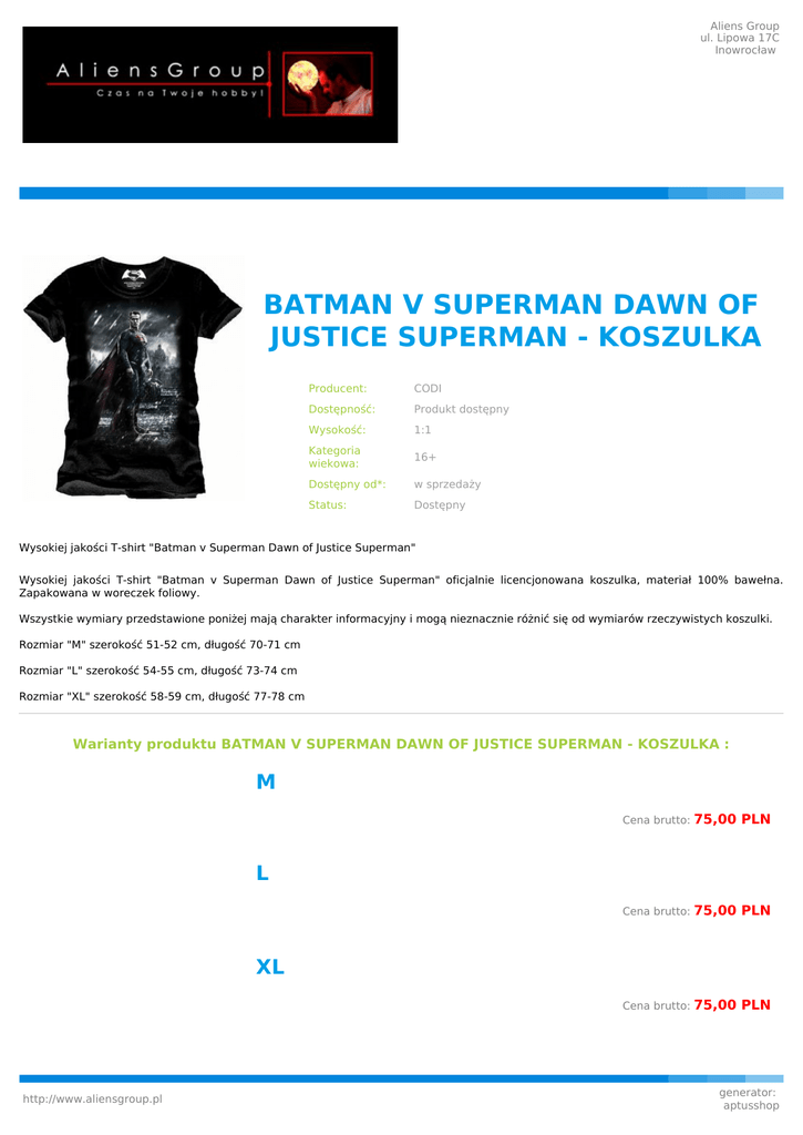 Aliens Group ul. Lipowa 17C Inowrocław BATMAN V SUPERMAN DAWN OF JUSTICE SUPERMAN - KOSZULKA Producent: CODI Dostępność: Produkt dostępny Wysokość: 1:1 Kategoria wiekowa: 16+ Dostępny od*: w sprzedaży Status: Dostępny Wysokiej jakości T-shirt "Batman v Superman Dawn of Justice Superman" Wysokiej jakości T-shirt "Batman v Superman Dawn of Justice Superman" oficjalnie licencjonowana koszulka, materiał 100% bawełna. Zapakowana w woreczek foliowy. Wszystkie wymiary przedstawione poniżej mają charakter informacyjny i mogą nieznacznie różnić się od wymiarów rzeczywistych koszulki. Rozmiar "M" szerokość 51-52 cm, długość 70-71 cm Rozmiar "L" szerokość 54-55 cm, długość 73-74 cm Rozmiar "XL" szerokość 58-59 cm, długość 77-78 cm Warianty produktu BATMAN V SUPERMAN DAWN OF JUSTICE SUPERMAN - KOSZULKA : M Cena brutto: 75,00 PLN Cena brutto: 75,00 PLN Cena brutto: 75,00 PLN L XL http://www.aliensgroup.pl generator: aptusshop