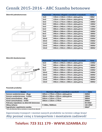 Cennik 2015-2016 - ABC Szamba betonowe Zbiorniki jednokomorowe Pojemność 1m3 2m3 3m3 4m3 5m3 6m3 7m3 8m3 9m3 10m3 10m3 11m3 12m3 13m3 Wymiary: długość x szerokość x wysokość 110cm x 110cm x 110cm z płytą górną 110cm x 110cm x 210cm z płytą górną 172cm x 172cm x 160cm z płytą górną 200cm x 240cm x 110cm z płytą górna 200cm x 240cm x 145cm z płytą górna 200cm x 240cm x 160cm z płytą górna 200cm x 240cm x 195cm z płytą górna 240cm x 300cm x 150cm z płytą górną 240cm x 300cm x 160cm z płytą górną 240cm x 300cm x 185cm z płytą górną 240cm x 350cm x 155cm z płytą górną 240cm x 300cm x 195cm z płytą górną 240cm x 350cm x 185cm z płytą górną 240cm x 350cm x 200cm z płytą górną Cena 500zł 800zł 1000zł 1000zł 1100zł 1300zł 1600zł 1800zł 2000zł 2200zł 2400zł 2400zł 2600zł 2800zł Pojemność 6m3 7m3 8m3 9m3 10m3 10m3 11m3 12m3 13m3 Wymiary: długość x szerokość x wysokość 200cm x 240cm x 160cm z płytą górna 200cm x 240cm x 195cm z płytą górna 240cm x 300cm x 150cm z płytą górną 240cm x 300cm x 160cm z płytą górną 240cm x 300cm x 185cm z płytą górną 240cm x 350cm x 155cm z płytą górną 240cm x 300cm x 195cm z płytą górną 240cm x 350cm x 185cm z płytą górną 240cm x 350cm x 200cm z płytą górną Cena 1500zł 1800zł 2000zł 2200zł 2400zł 2600zł 2600zł 2800zł 3000zł Zbiorniki dwukomorowe Pozostałe produkty: Nazwa Komora wodomierzowa - długa Komora wodomierzowa - krótka Kanał samochodowy - długi Kanał samochodowy - krótki Pokrywy najazdowe na zbiorniki betonowe Włazy żeliwne Sygnalizator zapełnienia szamba Wymiary: długość x szerokość x wysokość 320cm x 170cm x 210cm z płytą górna 200cm x 240cm x 205cm z płytą górna 544cm x 110cm x 172cm 350cm x 110cm x 170cm Fi 500m, fi600mm Cena 2600zł 1800zł 2800zł 2000zł 50-350zł 150-200zł 200zł* *Cena dla Klientów którzy zamówią w naszej firmie zbiornik Zapewniamy transport i montaż naszych produktów na terenie całego kraju! Aby poznać cenę z transportem i montażem zadzwoń! Telefon: 723 311 179 - WWW.SZAMBA.EU