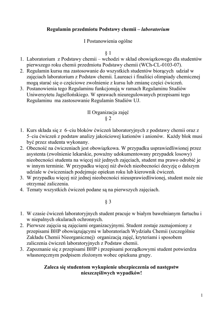 Regulamin przedmiotu Podstawy chemii – laboratorium I Postanowienia ogólne §1 1. Laboratorium z Podstawy chemii – wchodzi w skład obowiązkowego dla studentów pierwszego roku chemii przedmiotu Podstawy chemii (WCh-CL-0103-07). 2. Regulamin kursu ma zastosowanie do wszystkich studentów biorących udział w zajęciach laboratorium z Podstaw chemii. Laureaci i finaliści olimpiady chemicznej mogą starać się o częściowe zwolnienie z kursu lub zmianę części ćwiczeń. 3. Postanowienia tego Regulaminu funkcjonują w ramach Regulaminu Studiów Uniwersytetu Jagiellońskiego. W sprawach nieuregulowanych przepisami tego Regulaminu ma zastosowanie Regulamin Studiów UJ. II Organizacja zajęć §2 1. Kurs składa się z 6–ciu bloków ćwiczeń laboratoryjnych z podstawy chemii oraz z 5–ciu ćwiczeń z podstaw analizy jakościowej kationów i anionów. Każdy blok musi być przez studenta wykonany. 2. Obecność na ćwiczeniach jest obowiązkowa. W przypadku usprawiedliwionej przez asystenta (zwolnienie lekarskie, poważny udokumentowany przypadek losowy) nieobecności studenta na więcej niż jednych zajęciach, student ma prawo odrobić je w innym terminie. W przypadku więcej niż dwóch nieobecności decyzję o dalszym udziale w ćwiczeniach podejmuje opiekun roku lub kierownik ćwiczeń. 3. W przypadku więcej niż jednej nieobecności nieusprawiedliwionej, student może nie otrzymać zaliczenia. 4. Tematy wszystkich ćwiczeń podane są na pierwszych zajęciach. §3 1. W czasie ćwiczeń laboratoryjnych student pracuje w białym bawełnianym fartuchu i w niepalnych okularach ochronnych. 2. Pierwsze zajęcia są zajęciami organizacyjnymi. Student zostaje zaznajomiony z przepisami BHP obowiązującymi w laboratoriach Wydziału Chemii (szczególnie Zakładu Chemii Nieorganicznej) organizacją zajęć, kryteriami i sposobem zaliczenia ćwiczeń laboratoryjnych z Podstaw chemii. 3. Zapoznanie się z przepisami BHP i przepisami porządkowymi student potwierdza własnoręcznym podpisem złożonym wobec opiekuna grupy. Zaleca się studentom wykupienie ubezpieczenia od następstw nieszczęśliwych wypadków! 1 4. Na pierwszych zajęciach studenci zapoznają się z podstawowym szkłem laboratoryjnym i przyrządami, następnie przejmują w użytkowanie na cały semestr szafki zawierające wyposażenie konieczne do wykonywania ćwiczeń laboratoryjnych. Fakt ten potwierdzają podpisanym własnoręcznie rewersem, który pozostaje u laborantki opiekującej się salami ćwiczeń. Zawartość szafki studenci oddają (zgodną z treścią rewersu) po zakończeniu wykonywania ćwiczeń pod koniec trwania zajęć pierwszego semestru (lub z chwilą podjęcia decyzji o rezygnacji ze studiów, jeżeli nastąpi ona w czasie trwania zajęć dydaktycznych pierwszego semestru). Po oddaniu szafki z odpowiednią zawartością otrzymują od laborantek rewers z potwierdzeniem zwrotu, w tej postaci jest on podstawą wpisu zaliczenia w indeksie i karcie egzaminacyjnej. §4 1. Przepisy wykonania ćwiczeń zebrane są w skrypcie „Ćwiczenia laboratoryjne z podstaw chemii” pod redakcją Anny Reizer, wydanym przez Wydawnictwo UJ w 2000 roku lub w źródle podanym z wyprzedzeniem przez asystenta. Skrypt składa się z dwóch części: Podstawy chemii i Chemia analityczna. Pierwsza część zawiera przepisy ćwiczeń laboratoryjnych pogrupowane w bloki tematyczne. Część druga jest zwięzłym kursem nieorganicznej analizy jakościowej kationów i anionów. W skrypcie zamieszczona jest literatura zalecana do przestudiowania przed ćwiczeniami. 2. Każdy blok ćwiczeń związanych tematycznie rozpoczyna zwięzłe wprowadzenie teoretyczne, zakres materiału naukowego, cel ćwiczenia. Następnie zamieszczone są szczegółowe przepisy wykonania kilku ćwiczeń. Każde z nich kończy się opracowaniem wyników. 3. Na pierwsze ćwiczenia student przychodzi przygotowany do wykonania ćwiczenia pt. Preparatyka chemiczna (skrypt – rozdział 2). §5 1. Student ma obowiązek przygotować się przed rozpoczęciem zajęć (nauczyć się teorii, przemyśleć plan pracy, przygotować stosowne obliczenia). 2. Każdy student pracuje indywidualnie z wyjątkiem kilku ćwiczeń wykonywanych parami lub prezentowanych całej grupie. Te ćwiczenia zapowiadane są przez opiekuna grupy z tygodniowym wyprzedzeniem. 3. Student prowadzi notatki z pracy laboratoryjnej w podpisanym zaszycie lub na odpowiednim formularzu. Wszystkie wykonane doświadczenia należy pokazać asystentowi, który podpisuje notatkę studenta. Tylko tak udokumentowane wykonanie jest podstawą zaliczenia ćwiczenia (patrz § 7.2). Po zakończeniu bloku ćwiczeń student opracowuje otrzymane wyniki w postaci sprawozdania i składa opiekunowi na następnych zajęciach. 2 4. Na zakończenie bloku ćwiczeń cała grupa studencka pisze (lub zdaje ustnie) krótkie ~20–to minutowe kolokwium z materiału teoretycznego oraz nabytych wiadomości praktycznych. §6 1. Sprawozdanie musi zawierać imię i nazwisko studenta, numer grupy, tytuł ćwiczenia oraz nazwisko asystenta – opiekuna grupy. 2. Sprawozdanie rozpoczyna cel ćwiczenia i zwięzła informacja o sposobie wykonania ćwiczenia, pomiaru, analizy. Należy również zamieścić otrzymane wyniki. 3. Wyniki należy opracować zgodnie z zamieszczonymi w skrypcie punktami zawartymi w punkcie „Opracowanie wyników” lub wg wskazań asystenta. 4. W każdym przypadku otrzymania rozbieżności pomiędzy otrzymanymi wartościami a wartością teoretyczną należy przeprowadzić dyskusję błędów i podać przyczyny tej różnicy. Każde sprawozdanie musi być wykonane samodzielnie. III Warunki otrzymania zaliczenia §7 1. Podstawowym (koniecznym) warunkiem otrzymania zaliczenia jest wykonanie przed końcem zajęć pierwszego semestru wszystkich ćwiczeń przewidzianych programem kursu podstawy chemii. 2. Na zaliczenie składają się: a. wykonanie wszystkich ćwiczeń przewidzianych programem kursu podstawy chem