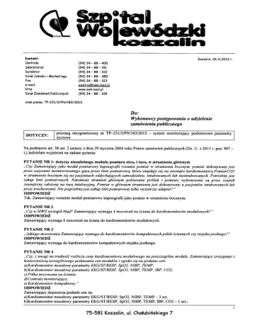 ffiffiEffi$w-r lil*r Kontokt: Koszclin, 26.11.2013 r. (94) (94) (94) (94) (94) Centrolo Sekretoriot Dyrektor Dziol JokoSci i Fox e-moil: llorketingu zial Zam6w znok pismo: iei TP Pu b I i cz rrych -?31 / 3 / PN/ 183 / - 88 - 400 - 88 - 151 - 88 - 102 - 88 - 380 - 88 - 103 [email protected] www.swk.med.pl (94) 34 - 88 - 109 http D 34 34 34 34 34 ?Ol3 Do: Wykonawcy postgpowania o udzielenie zamdwienia p ubliczn e go przetarg nieograniczony nr TP-231.131PN11831201.3 DOTYCZY: lowe - system monitoruj4cy podstawowe parametry Na podstawie art. 38 ust. 2 ustawy z dnia29 stycznia 2004 roku Prawo zam6wieri publicznych (Dz. IJ. 22013 r. poz.907 tj.)udzielam wyjaSnieri na zadane pytania: - l: dotycry niezaleinego modulu pomiaru etco2 i inco2 w strumieniu gl6wnym ,,Czy Zamowiajqcy jako modul pomiarowy kapnografii rozumie pomiar w strumieniu bocznym, pomiar dokonywany jest przez zasysanie monitorowanego g6tzu przez linie pomiarowq kt6ra znajduje siq na zewnqtrz kardiomonitora.PomiarCO2 w strumieniu bocznym siq na pacjentach oddychajqcych samodzielnie, intubowanych lub nieintubowanych. Potrzebny jest zakup linii pomiaro'wych. Natomiast strumieri gl1wnym pobieranie prhbek i pomiary wykory+tane sq przez czujnik zewnetrzny zalo1ony na rurQ intubacyjnq. Pomiar w gl6wnym strumieniu jest dokonywany u pacjent|w intubowanych lub przez tracheotomii. Nie pogrzebna jest zakup linii pomiarowej tylko Wstqrczy adapter? " PYTANIE NR ODPOWIEDZ Tak. Zamawiaj4cy rozumie modul pomiarowy kapnografii jako pomiar w strumieniu bocznym. PYTANIE NR2 ,,Cty. SII(Z wystqpil blqd? Zamawiajqcy wymaga 4 mocowsy't na Scianq do kardiomonitor6w modulowych? " ODPOWIEDZ Zamawiajqcy wymaga 4 mocowari na Sciang do kardiomonitor6w modulowych. PYTANIE NR 3 ,,Jakiego mocowania Zamawiajqqt Wmaga do kqrdiomonitor6w kompakto'tvych p6lek iciennych czy stojaka jezdnego? " ODPOWIEDZ Zamawiajqcy wymaga do kardiomonitor6w kompaktowych stojaka jezdnego. PYTANIE NR 4 , uwagi na trudnoit rozbicia ceny kardiomonitora modulowego na poszczeg1lne moduly, Zamawiajqcy zrezygnuje z podawania cen modulfw i zgodzi siq na podanie cen: a)Kardiomonitor mosulovlt pqrametry EKG/ST/RESP, SpO2, NIBP, TEMP; b)Kardiomonitor mosulory parametry EKG/ST/RESP, SpO2, NIBP, TEMP, IBP, CO2; c) P6lka mocowana na icianie; ,,Cry, koniecznoiciqszczeg6lowego d) C e ntr al a m e) onit oruj qc a ; Kar diomonit or komp akt owy. " ODPOWIEDZ Zamaw iajqcy dopuszcza podanie cen za: a)Kardiomonitor mosulowy parametry EKG/ST/RESP, SpO2, NIBP, TEMP -3 szt. b)Kardiomonitor mosulowy parametry EKG/ST/RESP, SpO2, NIBP, TEMP, IBP, COz 75-58t Koszolin, ul. Cho,lubifiskiego 7 -l szt.; c)P6tka mocowana na Scianie - 4 szt.: d)Centala monitoruj4ca - 1 szt.; e) Kardiomonitor kompaktowy ze stojakiem jezdnym _ 2 szt. PYTANIE NR 5: dotyczy I- kardiomonitor modulowy _ pkt. 2 ,,Czy Zamowiaiqcy dopuici wysokiei klasy kardiomonitor-modulowy posiadajqcy elvan o przekqtnej 17,, z dodatkowym modulem transportovvym umo2liwiaiqcym bezpieczny transport' pacjenta? oferowarry iarhiomonitor posiada wielofunkqjny.modul transportowy, h6ry z pa,vnoiciqziekompeisuje r,znice w wielkoici elvanu.,, ODPOWIEDZ Tak. PYTANIE NR 6: dotyczy I- kardiomonitor modulowy - pkt. s ,,Czy zamawiajqcy dopuici do przetargu wysokiej ilasy kardiomonitor modulowy, kt6ry posiada zaprogramowane fabrycznie 6 konfiguracji monitora oraz mo2liwoi6 dowolnego zaprogramowania biezqcego ekranu z funkcjq zapamiqtywania ustawiefi kardiomonitorq? Zastosowanie pamigci zaprogramowania l0 konJiguracji ekranu nie ma w tym przypadku zastosowania, gdy2 uirytkownik juz ma w pamigci na stale zaprogramowane najczgiciej stosowane konJiguracje, przez co nie musi traci| czasu na ich ponowne ustqwianie.,, ODPOWIEDZ Tak. PYTANIE NR 7: dotyczy I- kardiomonitor modulowy pkt. l0 ,,Czy Zamowioiqcy dopuici do przetargu wysokini t toty kardiomonitor modulo.uvy posiadajqcy pamiq7 trend6w tabelarycznych oraz graficznych z t20 godzinw rozdzielczoici Imin, Smin, l0 min,30 min,'60 min oraz pamiqt z ostatniej CodzW w rozdzielczoici I lub 5 sekund z mo2liwoiciqprzeniesienia danych przy pomoq) karty SD? Jeit to.vvystarczajqcy czas do retrosp-ektywnej analizy stanu zdrowia pacjenta.,, ODPOWIEDZ Tak. PYTANIE NR 8: dotyczy II- niezateZny modul EKG/ST/RES- pkt. I ,,,Czy Zamawiaiqcy dopuici do przetargu wysokiej klasy kardiomonitor modulowy posiadajqcy EKG z -7 odprowadzeti, z trzyiylowegostandardowe rozwiqzanie stosowin" kabla piqcio2ylowego moiliwoi7 monitorowania I odprowadzenie'orit , dziesiqcioiylowego-12 prr"i wiqlazoit producent6w kardiomonitor6w. t2 odprowidzeri, rro"rqy spos6bwplynie na "ir odprowafuefi EKG. Jest to oferowany kardiomonitor posiada ju|w standardzie monitorowanie p osz erz enie moZ I iw oi c i di agnosty czny ch m onitor a.,' ODPOWIEDZ Tak. PYTANIE NR 9: dotycry II- niezale2ny modut EKG/ST/RES- pkt.3 ,,Czy Zamawiaiqcy dopuici do przetargu wysokiej klasy kardiomonitor modulowy posiadajqcy nadz6r i alarmowanie bezdechu w zalcresie 10-40 sekund? Jest to wystarczaiqcy zakres do monitoioiania wszystkich grup wiekowych pacjent6w." ODPOWIEDZ Tak. PYTANIE NR 10: dotycry rv- niezaleiny modul cisnienia nieinwazyjnego- pkt. 1 ,,Czy Zamawiaiqcy dopusci do przetargu wysokiej klasy kardiomonitii modutov,ty posiadajqcy zalves pomiarowy rytmu serca z pomiaru ciinieniq nieinwa4tjnego w zakresie 40-240 ud./min. ? Jest to wystarczajqcy zalcres io monitorowania wszystkich grup w i ekowych p acj ent 6w. " ODPOWIEDZ Tak. PYTA|IIE NR 11: dotyczy VI- niezaleZny modul do pomiaru ciSnienia metodq inwaryjn4 w jednym kanale- pkt. I ,,Czy Zamawiajqqt dopuici do przetarguwysokiej klasy kardiomonitor modulowy-postadajq"y tito"ipo-iarowy ciinienia -wiekowych im'vazyjnego od - 50 do + jgg mmHgT Jest to wystarczajqcy zakres do monitorowanio wszystiich grup pacjent6w. Oferowany kardiomonitor posiada pomiar iwvazyjnego ciSnienia krwi sposdb wplynie nq poszerzenie mo2liwo:ici diagnostycznych monitorq. " w dw6ch kanalach,- "i * ,rorrq"y ODPOWIEDZ Tak. PYTANIE NR 12: dotyczy - IX- centrala monitorujqca ,,