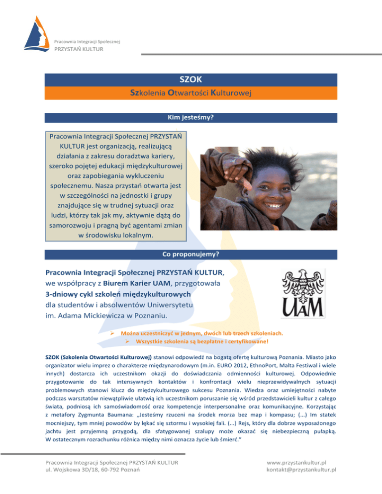 Pracownia Integracji Społecznej PRZYSTAŃ KULTUR SZOK PRZ Szkolenia Otwartości Kulturowej Kim jesteśmy? Pracownia Integracji Społecznej PRZYSTAŃ KULTUR jest organizacją, realizującą działania z zakresu doradztwa kariery, szeroko pojętej edukacji międzykulturowej oraz zapobiegania wykluczeniu społecznemu. Nasza przystań otwarta jest w szczególności na jednostki i grupy znajdujące się w trudnej sytuacji oraz ludzi, którzy tak jak my, aktywnie dążą do samorozwoju i pragną być agentami zmian w środowisku lokalnym. Co proponujemy? Pracownia Integracji Społecznej PRZYSTAŃ KULTUR, we współpracy z Biurem Karier UAM, przygotowała 3-dniowy cykl szkoleń międzykulturowych dla studentów i absolwentów Uniwersytetu im. Adama Mickiewicza w Poznaniu. Można uczestniczyć w jednym, dwóch lub trzech szkoleniach. Wszystkie szkolenia są bezpłatne i certyfikowane! SZOK (Szkolenia Otwartości Kulturowej) stanowi odpowiedź na bogatą ofertę kulturową Poznania. Miasto jako organizator wielu imprez o charakterze międzynarodowym (m.in. EURO 2012, EthnoPort, Malta Festiwal i wiele innych) dostarcza ich uczestnikom okazji do doświadczania odmienności kulturowej. Odpowiednie przygotowanie do tak intensywnych kontaktów i konfrontacji wielu nieprzewidywalnych sytuacji problemowych stanowi klucz do międzykulturowego sukcesu Poznania. Wiedza oraz umiejętności nabyte podczas warsztatów niewątpliwie ułatwią ich uczestnikom poruszanie się wśród przedstawicieli kultur z całego świata, podniosą ich samoświadomość oraz kompetencje interpersonalne oraz komunikacyjne. Korzystając z metafory Zygmunta Baumana: „Jesteśmy rzuceni na środek morza bez map i kompasu; (...) Im statek mocniejszy, tym mniej powodów by lękać się sztormu i wysokiej fali. (...) Rejs, który dla dobrze wyposażonego jachtu jest przyjemną przygodą, dla sfatygowanej szalupy może okazać się niebezpieczną pułapką. W ostatecznym rozrachunku różnica między nimi oznacza życie lub śmierć.” Pracownia Integracji Społecznej PRZYSTAŃ KULTUR ul. Wojskowa 3D/18, 60-792 Poznań www.przystankultur.pl [email protected] Pracownia Integracji Społecznej PRZYSTAŃ KULTUR NASZA OFERTA PRZ .....Szkolenie nr 1..... Temat: Poznanie – pierwszym krokiem do zrozumienia, czyli niestereotypowo o stereotypach… Termin: 23 maja 2012 r., godz. 17:00 – 20:00 Język szkolenia: j. polski Uczestnicy: polscy studenci i absolwenci Uniwersytetu im. Adama Mickiewicza w Poznaniu Czas trwania: 3 h Opis warsztatu: Warsztat będzie dotyczyć stereotypów, uprzedzeń oraz dyskryminacji i tego w jaki sposób wpływają na nasze codzienne funkcjonowanie. Przyjrzymy się ludzkiej różnorodności, porozmawiamy o mechanizmach powstawania stereotypów i konsekwencjach jakie niosą dla nas samych, a wszystko to będzie tylko tłem dla ćwiczeń, gier i zabaw, które pomogą nam zagłębić się w interesujący nas temat. Cele szkoleniowe: - przyjrzenie się kwestii ludzkiej różnorodności; - uświadomienie powszechności stereotypów, - przybliżenie pojęć: uprzedzenie oraz dyskryminacja; - uwrażliwienie na sam fakt tworzenia stereotypów, dostrzegania źródeł ich pochodzenia i sposobów reagowania na nie; - przyjrzenie się mechanizmom powstawania i funkcjonowania stereotypów oraz konsekwencjom jakie niosą; - rozwijanie umiejętności radzenia sobie ze stereotypami w kontakcie międzykulturowym. .....Szkolenie nr 2..... Temat: Jesteś tym, co jesz, czyli jak dieta wpływa na kulturę... Termin: 24 maja 2012 r., godz. 17:00 – 20:00 Język szkolenia: j. angielski Uczestnicy: polscy oraz zagraniczni studenci i absolwenci Uniwersytetu im. Adama Mickiewicza w Poznaniu Czas trwania: 3 h Pracownia Integracji Społecznej PRZYSTAŃ KULTUR ul. Wojskowa 3D/18, 60-792 Poznań www.przystankultur.pl [email protected] Pracownia Integracji Społecznej PRZYSTAŃ KULTUR Opis warsztatu: Warsztat obejmować będzie zagadnienia związane z kulturą dnia codziennego oraz spożywania pokarmów. Na podstawie materiałów źródłowych oraz sumy indywidualnych doświadczeń przedyskutujemy jaką rolę odgrywa w ludzkim życiu jedzenie i w jaki sposób nas definiuje. Stanie się ono pretekstem do rozmów PRZ o stylu życia i kulturze. Zastanowimy się również nad dualistyczną naturą hasła „Jesteś tym, co jesz!”, dyskutując nad fizycznym oraz kulturowo-językowym wymiarem tego powiedzenia. Jednym z istotnych celów warsztatu będzie integracja treści międzykulturowych z językiem obcym. Warunkiem niezbędnym do uczestnictwa w zajęciach jest komunikatywna znajomość języka angielskiego w zakresie sprawności mówienia oraz czytania ze zrozumieniem (poziom B1). Cele szkoleniowe: - rozwijanie sprawności mówienia w języku obcym; - rozwijanie sprawności czytania ze zrozumieniem w języku obcym; - rozwijanie umiejętności analitycznego myślenia; - wzbudzanie pozytywnego nastawienia wobec języków obcych oraz ich użytkowników; - rozwijanie empatii; - podnoszenie samoświadomości oraz poziomu zrozumienia kultury własnej. …..Szkolenie nr 3….. Temat: Zanurzenie międzykulturowe, czyli w poszukiwaniu wzbogacającej różnorodności... Termin: 25 maja 2012 r., godz. 17:00 – 20:00 Język szkolenia: j. polski Uczestnicy: polscy studenci i absolwenci Uniwersytetu im. Adama Mickiewicza w Poznaniu Czas trwania: 3 h Opis warsztatu: Podczas szkolenia poszukamy odpowiedzi na wiele pytań związanych z różnorodnością kulturową. Jak rozpoznać podstawowe wymiary kultury? Jak unikać pochopnych ocen i interpretacji? Znajomość odpowiedzi na te pytania a także na wiele innych oraz umiejętość ich integracji w naszym życiu pomaga wykorzystywać różnice między kulturami i uczynić z nich prawdziwą wartość. Rozwój kompetencji międzykulturowej pozwala także na wzbogacenie osobowości każdego młodego człowieka i pomaga przeciwdziałać nieporozumieniom na tle międzykulturowym oraz zapobieganiu powszechnie fu