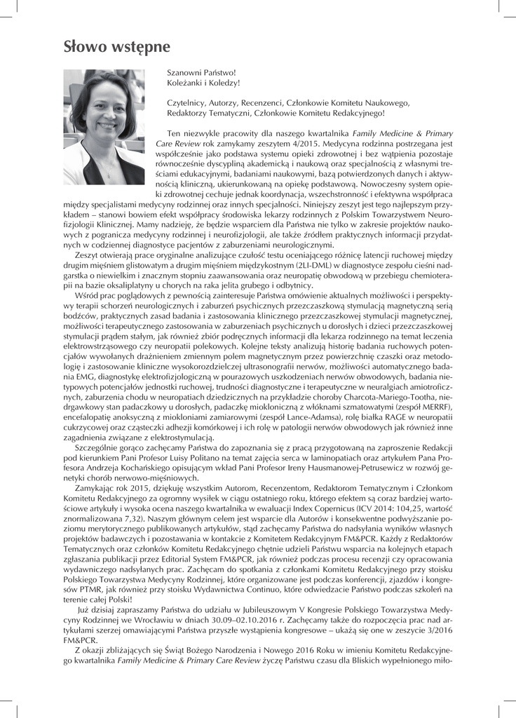 Słowo wstępne Szanowni Państwo! Koleżanki i Koledzy! Czytelnicy, Autorzy, Recenzenci, Członkowie Komitetu Naukowego, Redaktorzy Tematyczni, Członkowie Komitetu Redakcyjnego! Ten niezwykle pracowity dla naszego kwartalnika Family Medicine & Primary Care Review rok zamykamy zeszytem 4/2015. Medycyna rodzinna postrzegana jest współcześnie jako podstawa systemu opieki zdrowotnej i bez wątpienia pozostaje równocześnie dyscypliną akademicką i naukową oraz specjalnością z własnymi treściami edukacyjnymi, badaniami naukowymi, bazą potwierdzonych danych i aktywnością kliniczną, ukierunkowaną na opiekę podstawową. Nowoczesny system opieki zdrowotnej cechuje jednak koordynacja, wszechstronność i efektywna współpraca między specjalistami medycyny rodzinnej oraz innych specjalności. Niniejszy zeszyt jest tego najlepszym przykładem – stanowi bowiem efekt współpracy środowiska lekarzy rodzinnych z Polskim Towarzystwem Neurofizjologii Klinicznej. Mamy nadzieję, że będzie wsparciem dla Państwa nie tylko w zakresie projektów naukowych z pogranicza medycyny rodzinnej i neurofizjologii, ale także źródłem praktycznych informacji przydatnych w codziennej diagnostyce pacjentów z zaburzeniami neurologicznymi. Zeszyt otwierają prace oryginalne analizujące czułość testu oceniającego różnicę latencji ruchowej między drugim mięśniem glistowatym a drugim mięśniem międzykostnym (2LI-DML) w diagnostyce zespołu cieśni nadgarstka o niewielkim i znacznym stopniu zaawansowania oraz neuropatię obwodową w przebiegu chemioterapii na bazie oksaliplatyny u chorych na raka jelita grubego i odbytnicy. Wśród prac poglądowych z pewnością zainteresuje Państwa omówienie aktualnych możliwości i perspektywy terapii schorzeń neurologicznych i zaburzeń psychicznych przezczaszkową stymulacją magnetyczną serią bodźców, praktycznych zasad badania i zastosowania klinicznego przezczaszkowej stymulacji magnetycznej, możliwości terapeutycznego zastosowania w zaburzeniach psychicznych u dorosłych i dzieci przezczaszkowej stymulacji prądem stałym, jak również zbiór podręcznych informacji dla lekarza rodzinnego na temat leczenia elektrowstrząsowego czy neuropatii polekowych. Kolejne teksty analizują historię badania ruchowych potencjałów wywołanych drażnieniem zmiennym polem magnetycznym przez powierzchnię czaszki oraz metodologię i zastosowanie kliniczne wysokorozdzielczej ultrasonografii nerwów, możliwości automatycznego badania EMG, diagnostykę elektrofizjologiczną w pourazowych uszkodzeniach nerwów obwodowych, badania nietypowych potencjałów jednostki ruchowej, trudności diagnostyczne i terapeutyczne w neuralgiach amiotroficznych, zaburzenia chodu w neuropatiach dziedzicznych na przykładzie choroby Charcota-Mariego-Tootha, niedrgawkowy stan padaczkowy u dorosłych, padaczkę miokloniczną z włóknami szmatowatymi (zespół MERRF), encefalopatię anoksyczną z miokloniami zamiarowymi (zespół Lance-Adamsa), rolę białka RAGE w neuropatii cukrzycowej oraz cząsteczki adhezji komórkowej i ich rolę w patologii nerwów obwodowych jak również inne zagadnienia związane z elektrostymulacją. Szczególnie gorąco zachęcamy Państwa do zapoznania się z pracą przygotowaną na zaproszenie Redakcji pod kierunkiem Pani Profesor Luisy Politano na temat zajęcia serca w laminopatiach oraz artykułem Pana Profesora Andrzeja Kochańskiego opisującym wkład Pani Profesor Ireny Hausmanowej-Petrusewicz w rozwój genetyki chorób nerwowo-mięśniowych. Zamykając rok 2015, dziękuję wszystkim Autorom, Recenzentom, Redaktorom Tematycznym i Członkom Komitetu Redakcyjnego za ogromny wysiłek w ciągu ostatniego roku, którego efektem są coraz bardziej wartościowe artykuły i wysoka ocena naszego kwartalnika w ewaluacji Index Copernicus (ICV 2014: 104,25, wartość znormalizowana 7,32). Naszym głównym celem jest wsparcie dla Autorów i konsekwentne podwyższanie poziomu merytorycznego publikowanych artykułów, stąd zachęcamy Państwa do nadsyłania wyników własnych projektów badawczych i pozostawania w kontakcie z Komitetem Redakcyjnym FM&PCR. Każdy z Redaktorów Tematycznych oraz członków Komitetu Redakcyjnego chętnie udzieli Państwu wsparcia na kolejnych etapach zgłaszania publikacji przez Editorial System FM&PCR, jak również podczas procesu recenzji czy opracowania wydawniczego nadsyłanych prac. Zachęcam do spotkania z członkami Komitetu Redakcyjnego przy stoisku Polskiego Towarzystwa Medycyny Rodzinnej, które organizowane jest podczas konferencji, zjazdów i kongresów PTMR, jak również przy stoisku Wydawnictwa Continuo, które odwiedzacie Państwo podczas szkoleń na terenie całej Polski! Już dzisiaj zapraszamy Państwa do udziału w Jubileuszowym V Kongresie Polskiego Towarzystwa Medycyny Rodzinnej we Wrocławiu w dniach 30.09–02.10.2016 r. Zachęcamy także do rozpoczęcia prac nad artykułami szerzej omawiającymi Państwa przyszłe wystąpienia kongresowe – ukażą się one w zeszycie 3/2016 FM&PCR. Z okazji zbliżających się Świąt Bożego Narodzenia i Nowego 2016 Roku w imieniu Komitetu Redakcyjnego kwartalnika Family Medicine & Primary Care Review życzę Państwu czasu dla Bliskich wypełnionego miło- 254 Słowo wstępne ścią, spokoju w zamykaniu spraw na przełomie roku 2015 i 2016, wytrwałości w realizowaniu własnych pasji w Nowym Roku oraz projektów badawczych związanych z realiami medycyny rodzinnej, które zaowocują publikacjami na łamach FM&PCR w kolejnych latach. Dr hab. Donata Kurpas, prof. UMW Redaktor Naczelna Family Medicine & Primary Care Review