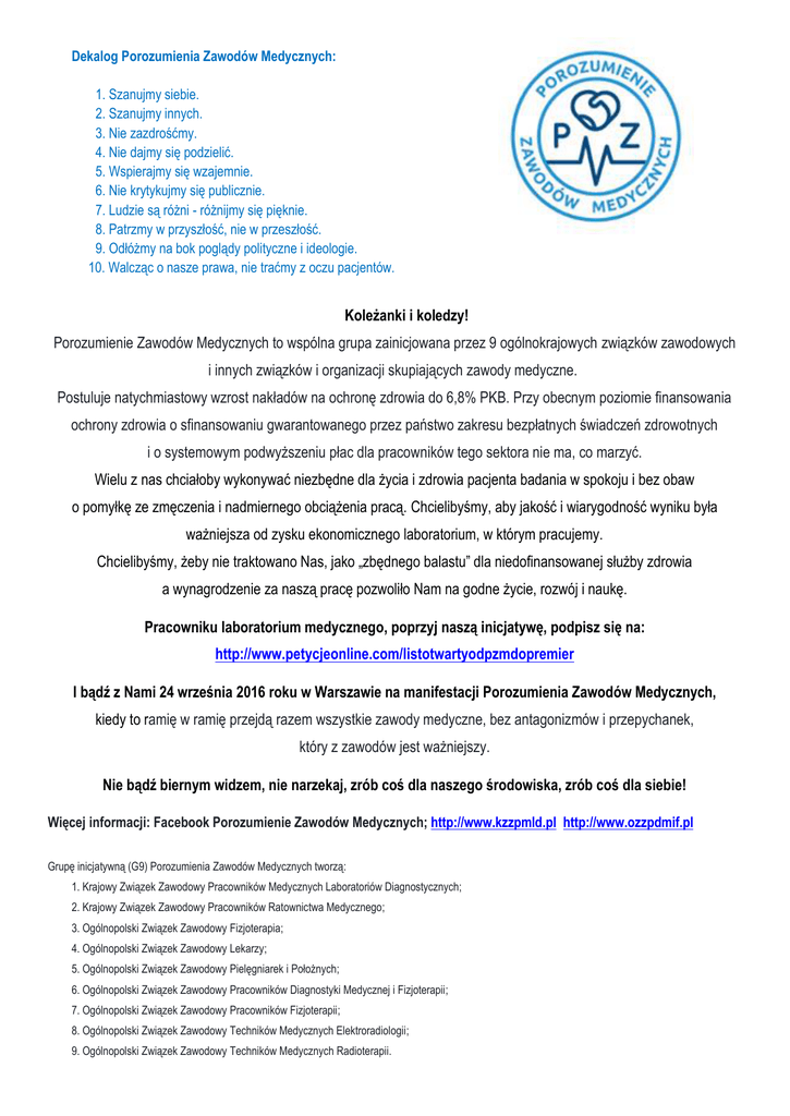 Dekalog Porozumienia Zawodów Medycznych: 1. Szanujmy siebie. 2. Szanujmy innych. 3. Nie zazdrośćmy. 4. Nie dajmy się podzielić. 5. Wspierajmy się wzajemnie. 6. Nie krytykujmy się publicznie. 7. Ludzie są różni - różnijmy się pięknie. 8. Patrzmy w przyszłość, nie w przeszłość. 9. Odłóżmy na bok poglądy polityczne i ideologie. 10. Walcząc o nasze prawa, nie traćmy z oczu pacjentów. Koleżanki i koledzy! Porozumienie Zawodów Medycznych to wspólna grupa zainicjowana przez 9 ogólnokrajowych związków zawodowych i innych związków i organizacji skupiających zawody medyczne. Postuluje natychmiastowy wzrost nakładów na ochronę zdrowia do 6,8% PKB. Przy obecnym poziomie finansowania ochrony zdrowia o sfinansowaniu gwarantowanego przez państwo zakresu bezpłatnych świadczeń zdrowotnych i o systemowym podwyższeniu płac dla pracowników tego sektora nie ma, co marzyć. Wielu z nas chciałoby wykonywać niezbędne dla życia i zdrowia pacjenta badania w spokoju i bez obaw o pomyłkę ze zmęczenia i nadmiernego obciążenia pracą. Chcielibyśmy, aby jakość i wiarygodność wyniku była ważniejsza od zysku ekonomicznego laboratorium, w którym pracujemy. Chcielibyśmy, żeby nie traktowano Nas, jako „zbędnego balastu” dla niedofinansowanej służby zdrowia a wynagrodzenie za naszą pracę pozwoliło Nam na godne życie, rozwój i naukę. Pracowniku laboratorium medycznego, poprzyj naszą inicjatywę, podpisz się na: http://www.petycjeonline.com/listotwartyodpzmdopremier I bądź z Nami 24 września 2016 roku w Warszawie na manifestacji Porozumienia Zawodów Medycznych, kiedy to ramię w ramię przejdą razem wszystkie zawody medyczne, bez antagonizmów i przepychanek, który z zawodów jest ważniejszy. Nie bądź biernym widzem, nie narzekaj, zrób coś dla naszego środowiska, zrób coś dla siebie! Więcej informacji: Facebook Porozumienie Zawodów Medycznych; http://www.kzzpmld.pl http://www.ozzpdmif.pl Grupę inicjatywną (G9) Porozumienia Zawodów Medycznych tworzą: 1. Krajowy Związek Zawodowy Pracowników Medycznych Laboratoriów Diagnostycznych; 2. Krajowy Związek Zawodowy Pracowników Ratownictwa Medycznego; 3. Ogólnopolski Związek Zawodowy Fizjoterapia; 4. Ogólnopolski Związek Zawodowy Lekarzy; 5. Ogólnopolski Związek Zawodowy Pielęgniarek i Położnych; 6. Ogólnopolski Związek Zawodowy Pracowników Diagnostyki Medycznej i Fizjoterapii; 7. Ogólnopolski Związek Zawodowy Pracowników Fizjoterapii; 8. Ogólnopolski Związek Zawodowy Techników Medycznych Elektroradiologii; 9. Ogólnopolski Związek Zawodowy Techników Medycznych Radioterapii.