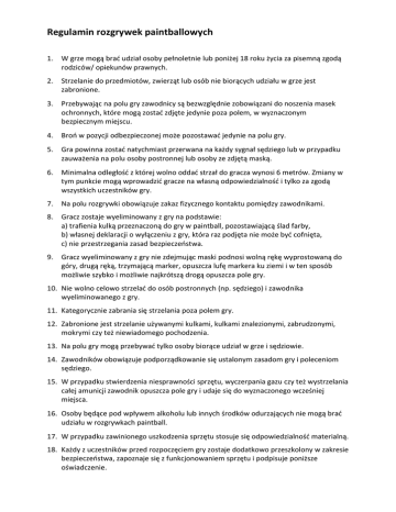 Regulamin rozgrywek paintballowych 1. W grze mogą brać udział osoby pełnoletnie lub poniżej 18 roku życia za pisemną zgodą rodziców/ opiekunów prawnych. 2. Strzelanie do przedmiotów, zwierząt lub osób nie biorących udziału w grze jest zabronione. 3. Przebywając na polu gry zawodnicy są bezwzględnie zobowiązani do noszenia masek ochronnych, które mogą zostać zdjęte jedynie poza polem, w wyznaczonym bezpiecznym miejscu. 4. Broń w pozycji odbezpieczonej może pozostawać jedynie na polu gry. 5. Gra powinna zostać natychmiast przerwana na każdy sygnał sędziego lub w przypadku zauważenia na polu osoby postronnej lub osoby ze zdjętą maską. 6. Minimalna odległość z której wolno oddać strzał do gracza wynosi 6 metrów. Zmiany w tym punkcie mogą wprowadzić gracze na własną odpowiedzialność i tylko za zgodą wszystkich uczestników gry. 7. Na polu rozgrywki obowiązuje zakaz fizycznego kontaktu pomiędzy zawodnikami. 8. Gracz zostaje wyeliminowany z gry na podstawie: a) trafienia kulką przeznaczoną do gry w paintball, pozostawiającą ślad farby, b) własnej deklaracji o wyłączeniu z gry, która raz podjęta nie może być cofnięta, c) nie przestrzegania zasad bezpieczeństwa. 9. Gracz wyeliminowany z gry nie zdejmując maski podnosi wolną rękę wyprostowaną do góry, drugą ręką, trzymającą marker, opuszcza lufę markera ku ziemi i w ten sposób możliwie szybko i możliwie najkrótszą drogą opuszcza pole gry. 10. Nie wolno celowo strzelać do osób postronnych (np. sędziego) i zawodnika wyeliminowanego z gry. 11. Kategorycznie zabrania się strzelania poza polem gry. 12. Zabronione jest strzelanie używanymi kulkami, kulkami znalezionymi, zabrudzonymi, mokrymi czy też niewiadomego pochodzenia. 13. Na polu gry mogą przebywać tylko osoby biorące udział w grze i sędziowie. 14. Zawodników obowiązuje podporządkowanie się ustalonym zasadom gry i poleceniom sędziego. 15. W przypadku stwierdzenia niesprawności sprzętu, wyczerpania gazu czy też wystrzelania całej amunicji zawodnik opuszcza pole gry i udaje się do wyznaczonego wcześniej miejsca. 16. Osoby będące pod wpływem alkoholu lub innych środków odurzających nie mogą brać udziału w rozgrywkach paintball. 17. W przypadku zawinionego uszkodzenia sprzętu stosuje się odpowiedzialność materialną. 18. Każdy z uczestników przed rozpoczęciem gry zostaje dodatkowo przeszkolony w zakresie bezpieczeństwa, zapoznaje się z funkcjonowaniem sprzętu i podpisuje poniższe oświadczenie. Oświadczenie uczestnika rozgrywek paintballowych 1. Zapoznałem się z zasadami bezpiecznego użytkowania sprzętu paintballowego i zobowiązuję się do ich przestrzegania. 2. Biorę na siebie pełną odpowiedzialność wszelkie szkody wyrządzone sobie lub innym w wyniku użytkowania markera paintballowego. 3. Jestem świadomy zagrożeń wynikających z użytkowania markera paintballowego. 4. Będę natychmiast informował organizatora o jakimkolwiek niepożądanym działaniu sprzętu. 5. Zobowiązuję się do zwrócenia sprzętu w stanie nienaruszonym. 6. Jestem świadomy, iż składając podpis, akceptuję wszystkie wyżej wymienione punkty. 7. Oświadczam, iż znany mi jest i zrozumiały regulamin rozgrywek paintballowych oraz treść oświadczenia uczestnika rozgrywek, nie zgłaszam w tej materii żadnych zastrzeżeń w pełni je akceptując. Oświadczam dodatkowo, że mam świadomość, iż uczestnictwo w grach paintballowych jest obarczone ryzykiem zaistnienia nieszczęśliwych wypadków, takich jak potłuczenia, otarcia, zwichnięcia, złamania, a w skrajnych przypadkach kontuzji w wyniku których dojść może do poważnego uszkodzenia ciała. Imię i nazwisko nr dowodu osobistego data czytelny podpis ....................................... ……………………………….. ……………….. …………………………… Oświadczenie rodzica/opiekuna niepełnoletniego uczestnika rozgrywek paintballowych 1. Oświadczam, iż jest mi znany i zrozumiały regulamin rozgrywek paintballowych oraz treść oświadczenia uczestnika rozgrywek, nie zgłaszam w tej materii żadnych zastrzeżeń w pełni je akceptując. Oświadczam dodatkowo, że mam świadomość, iż uczestnictwo w grach paintballowych jest obarczone ryzykiem zaistnienia nieszczęśliwych wypadków, takich jak potłuczenia, otarcia, zwichnięcia, złamania, a w skrajnych przypadkach kontuzji w wyniku których dojść może do poważnego uszkodzenia ciała. 2. Oświadczam, że wyrażam zgodę na ponoszenie takiego ryzyka przez mojego syna/córkę i oświadczam, że w razie zaistnienia wypadku, gdzie ofiarą będzie nasz syn/córka, nie będę wnosić roszczeń odszkodowawczych, ani wnosić o zastosowanie jakichkolwiek konsekwencji prawnych lub finansowych wobec organizatora gry, sprawcy wypadku bądź jakiegokolwiek innego uczestnika gry paintballowej. 3. Wobec powyższego zezwalam naszemu dziecku ......................................................... na udział w rozgrywkach paintballowych. Imię i nazwisko rodzica nr dowodu osobistego data czytelny podpis ....................................... ……………………………… …………. ……………………………..