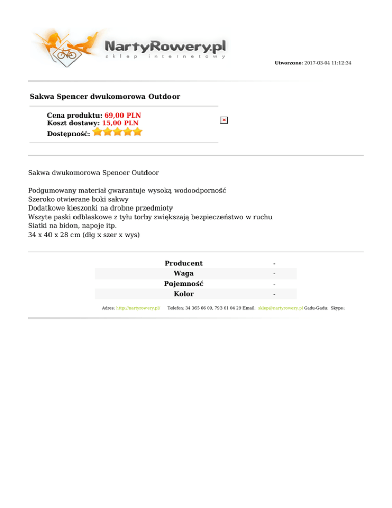 Utworzono: 2017-03-04 11:12:34 Sakwa Spencer dwukomorowa Outdoor Cena produktu: 69,00 PLN Koszt dostawy: 15,00 PLN Dostępność: Sakwa dwukomorowa Spencer Outdoor Podgumowany materiał gwarantuje wysoką wodoodporność Szeroko otwierane boki sakwy Dodatkowe kieszonki na drobne przedmioty Wszyte paski odblaskowe z tyłu torby zwiększają bezpieczeństwo w ruchu Siatki na bidon, napoje itp. 34 x 40 x 28 cm (dłg x szer x wys) Adres: http://nartyrowery.pl/ Producent - Waga - Pojemność - Kolor - Telefon: 34 365 66 09, 793 61 04 29 Email: [email protected] Gadu-Gadu: Skype: