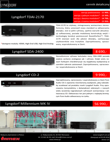cennikcennik detaliczny. detaliczny wersja podstawowa - 11 900,wersja z jednym modułem* - 13 350,wersja z dwoma modułami* - 14 700,wersja z trzema modułami* - 15 950,- Lyngdorf TDAI-2170 *dostępne moduły: HDMI, High-End USB, High End Analog TDAI-2170 to stylowy, zintegrowany wzmacniacz stereofoniczny, który ustanowił nowy standard w odtwarzaniu dźwięku. Jest w pełni cyfrowy, spełnia warunki aktualizacji softwarowej, posiada modułową konstrukcję wejść i technologię korekcji pomieszczeń RoomPerfect™, TDAI2170 stanowi wzór dla jakości dźwięku, zachwycając użytkowników oraz krytyków. Zaprojektowany, opracowany, wyprodukowany w Danii. Lyngdorf SDA-2400 8 690,Stereofoniczna cyfrowa końcówka mocy SDA-2400 posiada wejścia zarówno analogowe jak i cyfrowe. Dzięki wielu nowym funkcjom charakteryzuje się wyjątkową wydajnością w szerokim zakresie zastosowań. Zaprojektowana, opracowana i wyprodukowana w Danii. Lyngdorf CD-2 9 990,Zaprojektowany, opracowany i wyprodukowany w Danii Pure Audio CD-2 zapewnia niezrównaną wydajność, jaką należałoby oczekiwać od produktu marki Lyngdorf Audio. Przy opracowaniu korzystaliśmy z doświadczeń zebranych z naszych wielu wcześniej nagradzanych cyfrowych wzmacniaczy i odtwarzaczy CD. Odtwarzacz ten jest jednym z najlepiej brzmiącym Pure Audio odtwarzaczy na rynku. Lyngdorf Millennium MK IV Wyłączny dystrybutor w Polsce: ul. Nałęczowska 31, 02-922 Warszawa tel: 22 642 46 29, mail: [email protected] www.trimex.pl 56 990,- www.lyngdorf.com.pl obwiązuje od 05.09.2016 strona 1/1