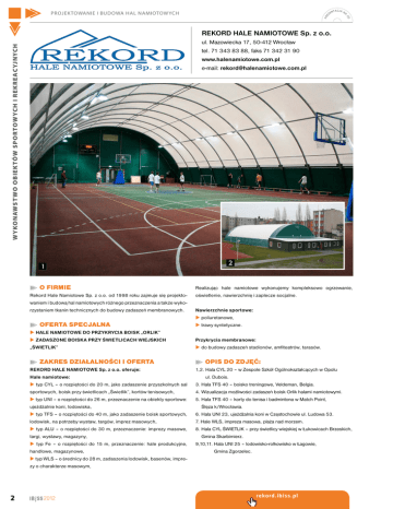 PROJEKTOWANIE I BUDOWA HAL NAMIOTOWYCH REKORD HALE NAMIOTOWE Sp. z o.o. WYKONAWST WO O BIEKTÓW S P O RTOW YCH I REKREACYJNYC H ul. Mazowiecka 17, 50-412 Wrocław tel. 71 343 83 88, faks 71 342 31 90 www.halenamiotowe.com.pl e-mail: [email protected] O FIRMIE Rekord Hale Namiotowe Sp. z o.o. od 1998 roku zajmuje się projekto- Realizując hale namiotowe wykonujemy kompleksowo ogrzewanie, oświetlenie, nawierzchnię i zaplecze socjalne. waniem i budową hal namiotowych różnego przeznaczenia a także wykorzystaniem tkanin technicznych do budowy zadaszeń membranowych. Nawierzchnie sportowe: poliuretanowe, OFERTA specjalna trawy syntetyczne. HALE NAMIOTOWE DO PRZYKRYCIA BOISK „ORLIK” ZADASZONE BOISKA PRZY ŚWIETLICACH WIEJSKICH Przykrycia membranowe: „ŚWIETLIK” do budowy zadaszeń stadionów, amfiteatrów, tarasów. ZAKRES DZIAŁALNOŚCI I OFERTA REKORD HALE NAMIOTOWE Sp. z o.o. oferuje: Hale namiotowe: OPIS DO ZDJĘĆ: 1,2. Hala CYL 20 – w Zespole Szkół Ogólnokształcących w Opolu ul. Dubois. typ CYL – o rozpiętości do 20 m, jako zadaszenie przyszkolnych sal 3. Hala TFS 40 – boisko treningowe, Veldeman, Belgia. sportowych, boisk przy świetlicach „Świetlik”, kortów tenisowych, 4. Wizualizacja możliwości zadaszeń boisk Orlik halami namiotowymi. typ UNI – o rozpiętości do 26 m, przeznaczenie na obiekty sportowe: 5. Hala TFS 40 – korty do tenisa i badmintona w Match Point, ujeżdżalnie koni, lodowiska, Ślęza k/Wrocławia. typ TFS – o rozpiętości do 40 m, jako zadaszenie boisk sportowych, 6. Hala UNI 23, ujeżdżalnia koni w Częstochowie ul. Ludowa 53. lodowisk, na potrzeby wystaw, targów, imprez masowych, 7. Hale WLS, impreza masowa, plaża nad morzem. typ ALU – o rozpiętości do 30 m, przeznaczenie: imprezy masowe, 8. Hala CYL ŚWIETLIK – przy świetlicy wiejskiej w Łukowicach Brzeskich, targi, wystawy, magazyny, typ Fe – o rozpiętości do 15 m, przeznaczenie: hale produkcyjne, handlowe, magazynowe, Gmina Skarbimierz. 9,10,11. Hala UNI 25 – lodowisko-rolkowisko w Łagowie, Gmina Zgorzelec. typ WLS – o średnicy do 28 m, zadaszenia lodowisk, basenów, imprezy o charakterze masowym, 2 2012 rekord.ibiss.pl korzystaj my z boisk orlik 12 m iesięcy w roku rekord.ibiss.pl 2012 WYKONAWST WO O BIEKTÓW S P O RTOW YCH I REKREACYJNYC H PROJEKTOWANIE I BUDOWA HAL NAMIOTOWYCH 3