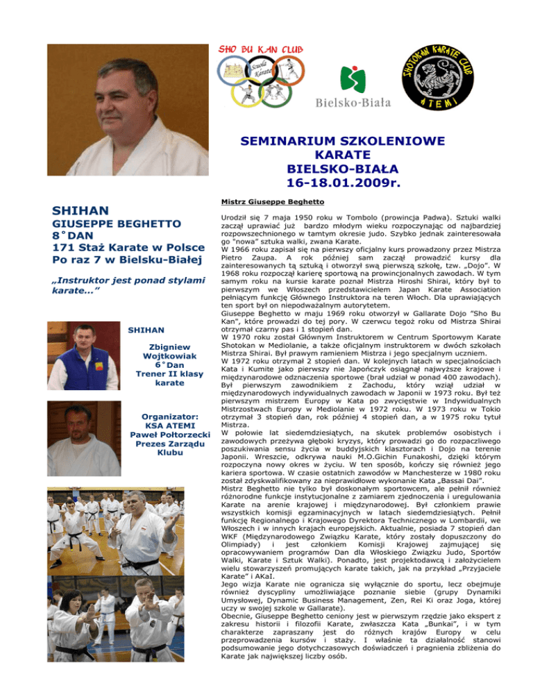 SEMINARIUM SZKOLENIOWE KARATE BIELSKO-BIAŁA 16-18.01.2009r. Mistrz Giuseppe Beghetto SHIHAN GIUSEPPE BEGHETTO 8˚DAN 171 Staż Karate w Polsce Po raz 7 w Bielsku-Białej „Instruktor jest ponad stylami karate...” SHIHAN Zbigniew Wojtkowiak 6˚Dan Trener II klasy karate Organizator: KSA ATEMI Paweł Połtorzecki Prezes Zarządu Klubu Urodził się 7 maja 1950 roku w Tombolo (prowincja Padwa). Sztuki walki zaczął uprawiać już bardzo młodym wieku rozpoczynając od najbardziej rozpowszechnionego w tamtym okresie judo. Szybko jednak zainteresowała go "nowa” sztuka walki, zwana Karate. W 1966 roku zapisał się na pierwszy oficjalny kurs prowadzony przez Mistrza Pietro Zaupa. A rok później sam zaczął prowadzić kursy dla zainteresowanych tą sztuką i otworzył swą pierwszą szkołę, tzw. „Dojo”. W 1968 roku rozpoczął karierę sportową na prowincjonalnych zawodach. W tym samym roku na kursie karate poznał Mistrza Hiroshi Shirai, który był to pierwszym we Włoszech przedstawicielem Japan Karate Association pełniącym funkcję Głównego Instruktora na teren Włoch. Dla uprawiających ten sport był on niepodważalnym autorytetem. Giuseppe Beghetto w maju 1969 roku otworzył w Gallarate Dojo ”Sho Bu Kan", które prowadzi do tej pory. W czerwcu tegoż roku od Mistrza Shirai otrzymał czarny pas i 1 stopień dan. W 1970 roku został Głównym Instruktorem w Centrum Sportowym Karate Shotokan w Mediolanie, a także oficjalnym instruktorem w dwóch szkołach Mistrza Shirai. Był prawym ramieniem Mistrza i jego specjalnym uczniem. W 1972 roku otrzymał 2 stopień dan. W kolejnych latach w specjalnościach Kata i Kumite jako pierwszy nie Japończyk osiągnął najwyższe krajowe i międzynarodowe odznaczenia sportowe (brał udział w ponad 400 zawodach). Był pierwszym zawodnikiem z Zachodu, który wziął udział w międzynarodowych indywidualnych zawodach w Japonii w 1973 roku. Był też pierwszym mistrzem Europy w Kata po zwycięstwie w Indywidualnych Mistrzostwach Europy w Mediolanie w 1972 roku. W 1973 roku w Tokio otrzymał 3 stopień dan, rok później 4 stopień dan, a w 1975 roku tytuł Mistrza. W połowie lat siedemdziesiątych, na skutek problemów osobistych i zawodowych przeżywa głęboki kryzys, który prowadzi go do rozpaczliwego poszukiwania sensu życia w buddyjskich klasztorach i Dojo na terenie Japonii. Wreszcie, odkrywa nauki M.O.Gichin Funakoshi, dzięki którym rozpoczyna nowy okres w życiu. W ten sposób, kończy się również jego kariera sportowa. W czasie ostatnich zawodów w Manchesterze w 1980 roku został zdyskwalifikowany za nieprawidłowe wykonanie Kata „Bassai Dai”. Mistrz Beghetto nie tylko był doskonałym sportowcem, ale pełnił również różnorodne funkcje instytucjonalne z zamiarem zjednoczenia i uregulowania Karate na arenie krajowej i międzynarodowej. Był członkiem prawie wszystkich komisji egzaminacyjnych w latach siedemdziesiątych. Pełnił funkcję Regionalnego i Krajowego Dyrektora Technicznego w Lombardii, we Włoszech i w innych krajach europejskich. Aktualnie, posiada 7 stopień dan WKF (Międzynarodowego Związku Karate, który zostały dopuszczony do Olimpiady) i jest członkiem Komisji Krajowej zajmującej się opracowywaniem programów Dan dla Włoskiego Związku Judo, Sportów Walki, Karate i Sztuk Walki). Ponadto, jest projektodawcą i założycielem wielu stowarzyszeń promujących karate takich, jak na przykład „Przyjaciele Karate” i AKaI. Jego wizja Karate nie ogranicza się wyłącznie do sportu, lecz obejmuje również dyscypliny umożliwiające poznanie siebie (grupy Dynamiki Umysłowej, Dynamic Business Management, Zen, Rei Ki oraz Joga, której uczy w swojej szkole w Gallarate). Obecnie, Giuseppe Beghetto ceniony jest w pierwszym rzędzie jako ekspert z zakresu historii i filozofii Karate, zwłaszcza Kata „Bunkai”, i w tym charakterze zapraszany jest do różnych krajów Europy w celu przeprowadzenia kursów i staży. I właśnie ta działalność stanowi podsumowanie jego dotychczasowych doświadczeń i pragnienia zbliżenia do Karate jak największej liczby osób. INFORMACJE DODATKOWE 1. Miejsce seminarium: Hala Sportowa „VICTORIA” Bielsko-Bialskiego Ośrodka Sportu i Rekreacji ul. Bratków 16 (Os. Kopernika), 2. Koszt seminarium: 80,00 zł 3. Koszt egzaminu na stopień mistrzowski Dan u Shihana Giuseppe Beghetto: 250,00 zł, 4. Osoby zdające na stopień mistrzowski powinni posiadać: Dyplom lub kserokopię ostatniego dyplomu. 5. Noclegi i wyżywienie we własnym zakresie Propozycja zakwaterowania: Hotel BBOSiR ul. Bratków 16, recepcja: tel. 0(33) 8118 037, e-mail: [email protected] – oferuje 36 miejsc noclegowych w pokojach 2, 3, 4 osobowych z pełnym węzłem sanitarnym, telefonem, TV. Przy rezerwacji proszę podać informację – seminarium karate. Termin rezerwacji do 12.01.2009r. Hotel Beskid ul. Olszówka 24 Bielsko-Biała, tel. 0(33) 821 71 60, Hotel „ELEKTRON” ul. Gałczyńskiego31, tel. (033) 814-10-85,815-11-80 do 81, PTTK Dom Wypoczynkowy, ul. Krasińskiego 38, tel. (033) 8 12-30-19 PROGRAM SEMINARIUM PIĄTEK 16.01.2009r. Godz. 19:00 – 20:00 Giuseppe Beghetto 8˚Dan Grupa dzieci od 5 do 11 lat Zbigniew Wojtkowiak 6˚Dan 9 kyu – 7 kyu Godz. 20:00 – 21:00 Zbigniew Wojtkowiak 6˚Dan Grupa 6 kyu – 4 kyu Godz. 20:00 – 21:00 Giuseppe Beghetto 8˚Dan Trenerzy i instruktorzy, 3 kyu - Dan, trening wspólny kata SOBOTA 17.01.2009r. Godz. 10:00 – 11:00 Zbigniew Wojtkowiak 6˚Dan Giuseppe Beghetto 8˚Dan Grupa dzieci od 5 do 11 lat, 9 kyu – 7 kyu (gry i zabawy przygotowujące do kumite, kihon do egzaminów, program szkoła – klub) Godz. 11:00 – 12:30 Zbigniew Wojtkowiak 6˚Dan Grupa 6 kyu – 4 kyu (kihon, kata + interpretacja) Godz. 12:30 – 14:00 Giuseppe Beghetto 8˚Dan Trenerzy i instruktorzy, 3 kyu - Dan, trening wspólny przygotowujący do startów w zawodach kata i kumite. Nauka i zrozumienie bunkai kata. Giuseppe Beghetto 8˚Dan Zbigniew Wojtkowiak 6