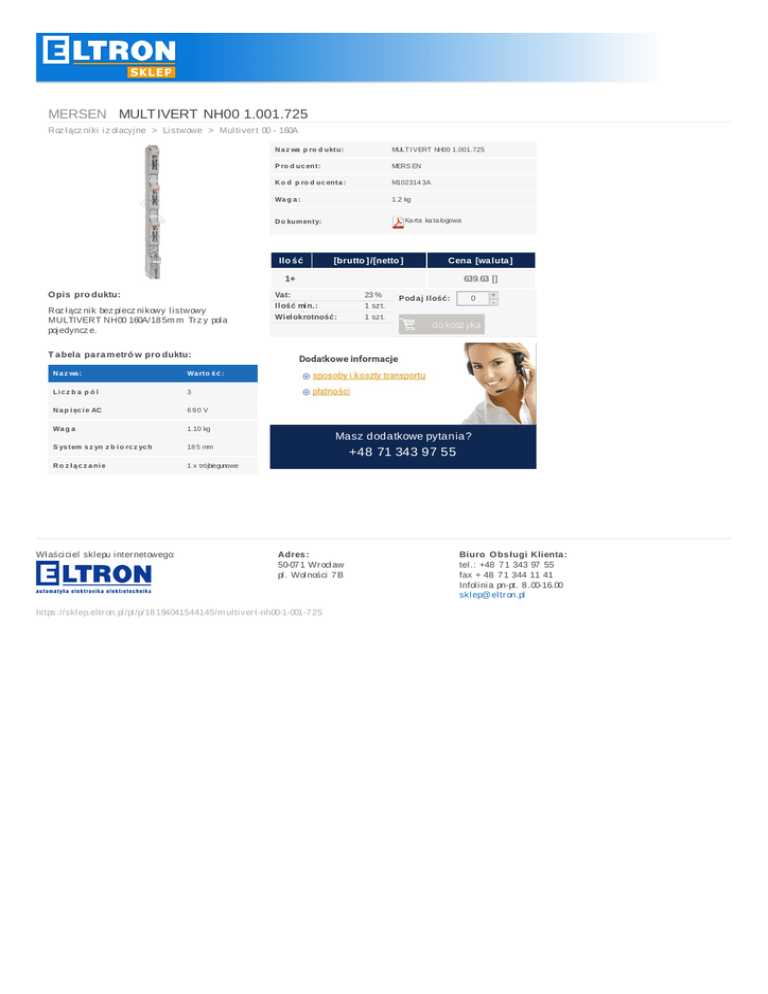 MERSENMULT IVERT NH001.001.725 Roz ł ącz ni ki i z ol acyj ne > Li stwowe > Mul ti ver t00-160A N a z wa p ro d u ktu : MULT I VERT NH001.001.725 P ro d u c en t: MERS EN K o d p ro d u c en ta : M102314 3A Wa g a : 1.2kg Ka rta ka ta logowa D o ku m en ty: Ilo ś ć [brutto ] /[netto ] Cena [wa luta ] 1+ O pis pro duktu: Roz ł ącz ni kbez pi ecz ni kowyl i stwowy MULTIVERTNH00160A/18 5m m Tr z ypol a poj edyncz e. 639.63[] Vat: Ilośćmin.: Wielokrotność: 23% 1sz t. 1sz t. Pod ajIlość: 0 + - dokosz yka T a bela pa ra m etró wpro duktu: N a z wa : Wa rto ś ć : L i c z b a p ó l 3 N a p i ęc i eAC 6 9 0V Wa g a 1.10kg S ys tem s z yn z b i o rc z yc h 18 5mm R o z ł ą c z a ni e 1xtrójbiegunowe Wł aści ci el skl epui nter netowego: Maszdodatkowepytania? +48713439755 Adres : 50-07 1Wr ocł aw pl .Wol ności 7 B https://skl ep.el tr on.pl /pl /p/18 194041544145/m ul ti ver t-nh00-1-001-7 25 Biuro O bs ługiKlienta : tel .:+48 7 134397 55 fax+48 7 13441141 Infol i ni apn-pt.8 .00-16.00 skl ep@ el tr on.pl