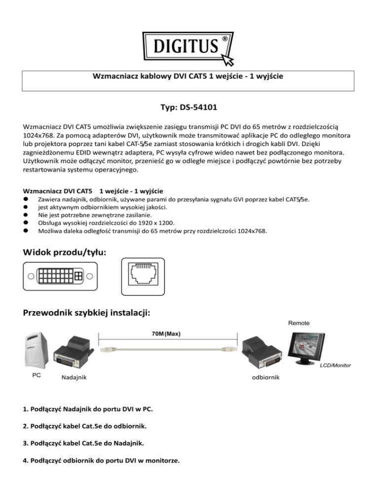Wzmacniacz kablowy DVI CAT5 1 wejście - 1 wyjście Typ: DS-54101 Wzmacniacz DVI CAT5 umożliwia zwiększenie zasięgu transmisji PC DVI do 65 metrów z rozdzielczością 1024x768. Za pomocą adapterów DVI, użytkownik może transmitować aplikacje PC do odległego monitora lub projektora poprzez tani kabel CAT-5/5e zamiast stosowania krótkich i drogich kabli DVI. Dzięki zagnieżdżonemu EDID wewnątrz adaptera, PC wysyła cyfrowe wideo nawet bez podłączonego monitora. Użytkownik może odłączyć monitor, przenieść go w odległe miejsce i podłączyć powtórnie bez potrzeby restartowania systemu operacyjnego. Wzmacniacz DVI CAT5 1 wejście - 1 wyjście Zawiera nadajnik, odbiornik, używane parami do przesyłania sygnału GVI poprzez kabel CAT5/5e. jest aktywnym odbiornikiem wysokiej jakości. Nie jest potrzebne zewnętrzne zasilanie. Obsługa wysokiej rozdzielczości do 1920 x 1200. Możliwa daleka odległość transmisji do 65 metrów przy rozdzielczości 1024x768. Widok przodu/tyłu: Przewodnik szybkiej instalacji: Nadajnik 1. Podłączyć Nadajnik do portu DVI w PC. 2. Podłączyć kabel Cat.5e do odbiornik. 3. Podłączyć kabel Cat.5e do Nadajnik. 4. Podłączyć odbiornik do portu DVI w monitorze. odbiornik Typ: DS-54101 Rozdzielczość 800 x 600 1024 x 768 1280 x 1024 1440 x 900 1600 x 900 1920 x 1200 Odległość (metry) 70 65 50 50 50 50 Kabel: Kablowe łącze wideo stosujące kabel CAT5E UTP lub CAT6 UTP, kabel CAT6 zwiększa zasięg transmisji i poprawia stabilność sygnału. Identyfikacja nóżek RJ45: Łącze kabla (TIA/EIA-568-B) 1. Pomarańczowo - biały 2. Pomarańczowy 3. Zielono - biały 4. Niebieski 5. Niebiesko - biały 6. Zielony 7. Brązowo - biały 8. Brązowy TMDS DATA0 TMDS DATA0 + TMDS CLOCK TMDS DATA1 TMDS DATA1 + TMDS CLOCK + TMDS DATA2 TMDS DATA2 + Wskaźniki LED: Zielony Żółty Status normalny Brak sygnału zegara Przestroga: 1. Kabel musi znajdować się z dala od sprzętu stosującego fale elektromagnetyczne, tzn.: mikrofalówek, sprzętu radiowego, wysokiego napięcia. 2. Zasięg działania jest różny, zależny od różnego sprzętu 3. Poniżej rozdzielczości 640 x 480 obraz może być zaszumiony 4. Nie obsługiwane jest HDCP Specyfikacja: POZYCJA Pasmo wideo Rozdzielczość Nadajnik Aż do 1600x1200 Sygnał wejściowy TMDS Sygnał wejściowy DDC Zasięg łącza kablowego Złącze DVI Złącze łącza Zasilanie elektryczne Temperatura WYMIARY Szer. x wys. x głęb. mm Ciężar g odbiornik 1,65 Gbps ( DVI 1.1) Aż do 1920 x 1200 przy 60Hz 1,2 Vpp 5 Vpp (TTL) 25 m przy 1024x 768 10 m przy 1920x1200 65 m przy 1024x768 50 m przy 1920x1200 DVI-D 29 nóżek RJ-45 ekranowane x 1 X Praca: 0 do 55°C, przechowywanie: -20 do 85°C, wilgotność: aż do 95% 50 x 40 x 20 40 × 56 × 24.5 45 g 50 g 2