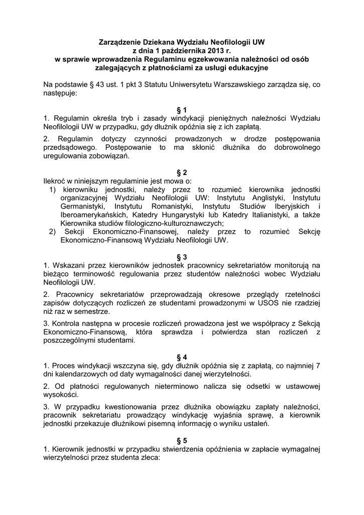 Zarządzenie Dziekana Wydziału Neofilologii UW z dnia 1 października 2013 r. w sprawie wprowadzenia Regulaminu egzekwowania należności od osób zalegających z płatnościami za usługi edukacyjne Na podstawie § 43 ust. 1 pkt 3 Statutu Uniwersytetu Warszawskiego zarządza się, co następuje: §1 1. Regulamin określa tryb i zasady windykacji pieniężnych należności Wydziału Neofilologii UW w przypadku, gdy dłużnik opóźnia się z ich zapłatą. 2. Regulamin dotyczy czynności prowadzonych w drodze przedsądowego. Postępowanie to ma skłonić dłużnika do uregulowania zobowiązań. postępowania dobrowolnego §2 Ilekroć w niniejszym regulaminie jest mowa o: 1) kierowniku jednostki, należy przez to rozumieć kierownika jednostki organizacyjnej Wydziału Neofilologii UW: Instytutu Anglistyki, Instytutu Germanistyki, Instytutu Romanistyki, Instytutu Studiów Iberyjskich i Iberoamerykańskich, Katedry Hungarystyki lub Katedry Italianistyki, a także Kierownika studiów filologiczno-kulturoznawczych; 2) Sekcji Ekonomiczno-Finansowej, należy przez to rozumieć Sekcję Ekonomiczno-Finansową Wydziału Neofilologii UW. §3 1. Wskazani przez kierowników jednostek pracownicy sekretariatów monitorują na bieżąco terminowość regulowania przez studentów należności wobec Wydziału Neofilologii UW. 2. Pracownicy sekretariatów przeprowadzają okresowe przeglądy rzetelności zapisów dotyczących rozliczeń ze studentami prowadzonymi w USOS nie rzadziej niż raz w semestrze. 3. Kontrola następna w procesie rozliczeń prowadzona jest we współpracy z Sekcją Ekonomiczno-Finansową, która sprawdza i potwierdza stan rozliczeń z poszczególnymi studentami. §4 1. Proces windykacji wszczyna się, gdy dłużnik opóźnia się z zapłatą, co najmniej 7 dni kalendarzowych od daty wymagalności danej wierzytelności. 2. Od płatności regulowanych nieterminowo nalicza się odsetki w ustawowej wysokości. 3. W przypadku kwestionowania przez dłużnika obowiązku zapłaty należności, pracownik sekretariatu prowadzący windykację wyjaśnia sprawę, a kierownik jednostki przekazuje dłużnikowi pisemną informację o wyniku ustaleń. §5 1. Kierownik jednostki w przypadku stwierdzenia opóźnienia w zapłacie wymagalnej wierzytelności przez studenta zleca: 1) przesłanie dłużnikowi wezwania pocztą elektroniczną do niezwłocznego uregulowania zobowiązania – gdy opóźnienie w zapłacie wyniesie co najmniej 7 dni kalendarzowych; 2) przesłanie dłużnikowi za zwrotnym potwierdzeniem odbioru wezwania do natychmiastowego uregulowania zobowiązania, powiększonego o odsetki ustawowe w terminie 14 dni kalendarzowych z pouczeniem, że po bezskutecznym upływie tego terminu nastąpi: a) skreślenie z listy studentów Uniwersytetu Warszawskiego na podstawie art. 190 ust. 2 pkt 3 ustawy Prawo o szkolnictwie wyższym, b) dopisanie dłużnika do Krajowego Rejestru Długów Biura Informacji Gospodarczej, c) skierowanie sprawy na drogę postępowania sądowego, którego koszty dodatkowo obciążą dłużnika – gdy opóźnienie w zapłacie wyniesie co najmniej 30 dni kalendarzowych, a czynności opisane w pkt 1 okażą się nieskuteczne; 3) przesłanie wniosku do Zespołu Radców Prawnych Uniwersytetu Warszawskiego o dopisanie dłużnika do Krajowego Rejestru Długów Biura Informacji Gospodarczej – gdy opóźnienie w zapłacie wyniesie 90 dni kalendarzowych, a czynności opisane w pkt 2 okażą się nieskuteczne. 2. Kierownik jednostki w przypadku stwierdzenia opóźnienia w zapłacie wymagalnej wierzytelności przez osobę, która nie jest studentem zleca: 1) skontaktowanie się za pomocą poczty elektronicznej, telefonicznie, itp. z dłużnikiem w celu przekazania mu wezwania do niezwłocznego uregulowania zobowiązania – gdy opóźnienie w zapłacie wyniesie co najmniej 7 dni kalendarzowych; 2) przesłanie dłużnikowi za zwrotnym potwierdzeniem odbioru wezwania do natychmiastowego uregulowania zobowiązania, powiększonego o odsetki ustawowe w terminie 14 dni kalendarzowych z pouczeniem, że po bezskutecznym upływie tego terminu nastąpi: a) dopisanie dłużnika do Krajowego Rejestru Długów Biura Informacji Gospodarczej, b) skierowanie sprawy na drogę postępowania sądowego, którego koszty dodatkowo obciążą dłużnika – gdy opóźnienie w zapłacie wyniesie co najmniej 30 dni kalendarzowych, a czynności opisane w pkt 1 okażą się nieskuteczne; 3) przesyła wniosek do Zespołu Radców Prawnych Uniwersytetu Warszawskiego o dopisanie dłużnika do Krajowego Rejestru Długów Biura Informacji Gospodarczej – gdy opóźnienie w zapłacie wyniesie 90 dni kalendarzowych, a czynności opisane w pkt 2 okażą się nieskuteczne. 3. Kierownik jednostki w porozumieniu z Sekcją Ekonomiczno-Finansową o każdej spłacie wierzytelności, która nastąpiła po wystąpieniu o wpisanie dłużnika do Krajowego Rejestru Długów Biura Informacji Gospodarczej, niezwłocznie zawiadamia Zespół Radców Prawnych Uniwersytetu Warszawskiego. §6 1. W wyjątkowych wypadkach, na uzasadniony wniosek dłużnika, kierownik jednostki może odroczyć termin spłaty należności lub rozłożyć kwotę należności na raty. 2. Ustalenie z dłużnikiem nowego terminu płatności lub harmonogramu spłat wymaga formy pisemnej i powoduje wstrzymanie czynności windykacyjnych. W przypadku naruszenia ustalonego terminu płatności wstrzymane czynności podejmuje się ponownie. §7 Zarządzenie wchodzi w życie z dniem podpisania. Dziekan Wydziału Neofilologii: M. Dakowska