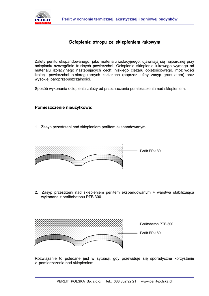 Perlit w ochronie termicznej, akustycznej i ogniowej budynków Ocieplenie stropu ze sklepieniem łukowym Zalety perlitu ekspandowanego, jako materiału izolacyjnego, ujawniają się najbardziej przy ocieplaniu szczególnie trudnych powierzchni. Ocieplenie sklepienia łukowego wymaga od materiału izolacyjnego następujących cech: niskiego cięŜaru objętościowego, moŜliwości izolacji powierzchni o nieregularnych kształtach (poprzez luźny zasyp granulatem) oraz wysokiej paroprzepuszczalności. Sposób wykonania ocieplenia zaleŜy od przeznaczenia pomieszczenia nad sklepieniem. Pomieszczenie nieuŜytkowe: 1. Zasyp przestrzeni nad sklepieniem perlitem ekspandowanym Perlit EP-180 2. Zasyp przestrzeni nad sklepieniem perlitem ekspandowanym + warstwa stabilizująca wykonana z perlitobetonu PTB 300 Perlitobeton PTB 300 Perlit EP-180 Rozwiązanie to polecane jest w sytuacji, gdy przewiduje się sporadyczne korzystanie z pomieszczenia nad sklepieniem. PERLIT POLSKA Sp. z o.o. tel.: 033 852 92 21 www.perlit-polska.pl Sposób wykonania: Wolne przestrzenie zasypujemy perlitem ekspandowanym i zagęszczamy go (np. za pomocą płyty styropianowej). Zagęszczanie powinno być wykonane w warstwach, co 10 cm. Po zagęszczeniu perlitu wykonujemy warstwę podkładu perlitowego (Perlitobeton PTB 300). Perlitobeton PTB 300 nakładamy w postaci półmokrej (sypka wilgotna masa) bezpośrednio na zagęszczony perlit i rozprowadzamy za pomocą metalowej łaty. Pomiędzy zagęszczony perlit, a perlitobeton moŜemy wstawić przekładkę z tektury w celu ułatwienia poruszania się po zagęszczonym perlicie. Pomieszczenie uŜytkowe: Podłoga w pomieszczeniu uŜytkowym moŜe być wykonana na mokro (wylewka perlitowa) lub jako suchy podkład podłogowy. 1. Wylewka perlitowa na mokro Podłoga (panele, płytki ceramiczne, itp.) Perlitobeton PTB 600 Perlitobeton PTB 300 Receptura PRZYGOTOWANIE PODŁOśA: Jednostka miary Podkład perlitowy PTB 300 Wylewka perlitowa PTB 600 Perlit EP-180 [l] 125 62,5 Perlit EP-150 [l] - 62,5 Cement 32,5 R [kg] 19 35 [g] 50 - [g] - 50 [l] 20-23 27-30 [W/mK] 0,07 0,14 Wytrzymałość na ściskanie [MPa] 1,3 - 1,5 5,5 - 6,0 Masa objętościowa [kg/m3] 300 600 Składnik Premix - podkład perlitowy Premix - wylewka perlitowa Woda Współczynnik przewodzenia ciepła λ Powierzchnię naleŜy oczyścić z luźno związanych elementów, a następnie odkurzyć. Przymocować taśmę elastyczną w miejscach połączeń podłogi ze ścianami w celu zamortyzowania napręŜeń destabilizujących podłogę. Taśma powinna nachodzić na powierzchnie boczne ściany do wysokości wylewki. MIESZANIE: Wylewkę perlitową moŜna mieszać w betoniarce lub za pomocą mieszadła koszykowego. Poszczególne składniki naleŜy dodawać w kolejności: woda - premiks - cement - perlit Zaleca się wstępne wymieszanie premiksu oraz cementu wraz z wodą za pomocą mieszadła koszykowego. Konsystencja powinna być spieniona. Tak przygotowaną mieszankę dozujemy do betoniarki i dodajemy perlit. Czas mieszania nie powinien przekraczać 4-5 minut. Perlit w ochronie termicznej, akustycznej i ogniowej budynków Wydajność: 3 3 1 m perlitu = 0,95 - 1,00 m podkładu 3 3 1 m perlitu = 0,80 - 0,85 m wylewki Konsystencja gotowego perlitobetonu: PTB 300 - półmokra (sypka wilgotna masa) PTB 600 - gęstoplastyczna masa W celu ograniczenia moŜliwości powstania rys skurczowych zaleca się zastosowanie zbrojenia rozproszonego wylewki, poprzez dodanie do wylewki włókien polipropylenowych (długość włókien: 6-12 mm). Poprawę własności aplikacyjnych wylewki uzyskuje się poprzez dodanie plastyfikatora do betonu. Włókien ani plastyfikatora nie stosuje się do podkładu pod wylewkę. SPOSÓB UśYCIA: UłoŜenie wylewki powinno być wykonane zgodnie ze sztuką budowlaną, tak jak w przypadku tradycyjnych wylewek betonowych. Minimalna grubość wylewki 4-5 cm. TEMPERATURA STOSOWANIA: Temperatura podłoŜa i otoczenia od + 5ºC do + 30ºC. 2. Suchy podkład podłogowy Podłoga (panele, płytki ceramiczne, itp.) Płyty jastrychowe Tektura Perlit EP-180 Sposób wykonania: Wolne przestrzenie zasypujemy granulatem z perlitu. Luźny perlit naleŜy zagęścić (np. za pomocą płyty styropianowej). Zagęszczanie powinno być wykonane w warstwach co 10 cm. Następnie na powierzchni perlitu rozkładamy tekturę falistą lub papier tekturowy. Do ścian i innych elementów konstrukcyjnych wzdłuŜ całego obwodu podłogi naleŜy przymocować pasy systemowej taśmy brzegowej, folii polietylenowej lub paski styropianu, o grubości około 1 cm. Pasy powinny być ułoŜone, co najmniej do wysokości planowanej posadzki. Ostatnim etapem prac jest ułoŜenie płyt jastrychu. Powszechnie stosowane są: - płyty gipsowo-kartonowe, - płyty gipsowo-włóknowe, - płyty cementowe Na stropach drewnianych stosuje się równieŜ płyty drewnopochodne OSB. PERLIT POLSKA Sp. z o.o. tel.: 033 852 92 21 www.perlit-polska.pl