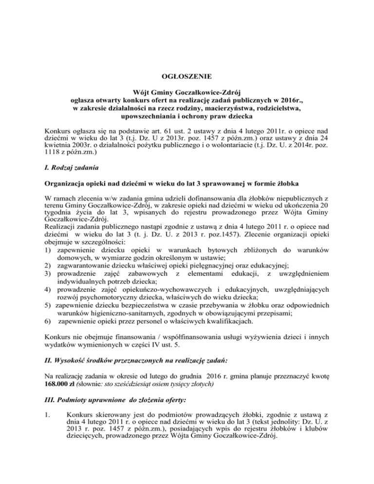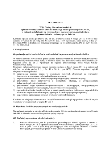 OGŁOSZENIE Wójt Gminy Goczałkowice-Zdrój ogłasza otwarty konkurs ofert na realizację zadań publicznych w 2016r., w zakresie działalności na rzecz rodziny, macierzyństwa, rodzicielstwa, upowszechniania i ochrony praw dziecka Konkurs ogłasza się na podstawie art. 61 ust. 2 ustawy z dnia 4 lutego 2011r. o opiece nad dziećmi w wieku do lat 3 (t.j. Dz. U z 2013r. poz. 1457 z późn.zm.) oraz ustawy z dnia 24 kwietnia 2003r. o działalności pożytku publicznego i o wolontariacie (t.j. Dz. U. z 2014r. poz. 1118 z późn.zm.) I. Rodzaj zadania Organizacja opieki nad dziećmi w wieku do lat 3 sprawowanej w formie żłobka W ramach zlecenia w/w zadania gmina udzieli dofinansowania dla żłobków niepublicznych z terenu Gminy Goczałkowice-Zdrój, w zakresie opieki nad dziećmi w wieku od ukończenia 20 tygodnia życia do lat 3, wpisanych do rejestru prowadzonego przez Wójta Gminy Goczałkowice-Zdrój. Realizacji zadania publicznego nastąpi zgodnie z ustawą z dnia 4 lutego 2011 r. o opiece nad dziećmi w wieku do lat 3 (t. j. Dz. U. z 2013 r. poz.1457). Zlecenie organizacji opieki obejmuje w szczególności: 1) zapewnienie dziecku opieki w warunkach bytowych zbliżonych do warunków domowych, w wymiarze godzin określonym w ustawie; 2) zagwarantowanie dziecku właściwej opieki pielęgnacyjnej oraz edukacyjnej; 3) prowadzenie zajęć zabawowych z elementami edukacji, z uwzględnieniem indywidualnych potrzeb dziecka; 4) prowadzenie zajęć opiekuńczo-wychowawczych i edukacyjnych, uwzględniających rozwój psychomotoryczny dziecka, właściwych do wieku dziecka; 5) zapewnienie dziecku bezpieczeństwa w czasie przebywania w żłobku oraz odpowiednich warunków higieniczno-sanitarnych, zgodnych w obowiązującymi przepisami; 6) zapewnienie opieki przez personel o właściwych kwalifikacjach. Konkurs nie obejmuje finansowania / współfinansowania usługi wyżywienia dzieci i innych wydatków wymienionych w części IV ust. 5. II. Wysokość środków przeznaczonych na realizację zadań: Na realizację zadania w okresie od lutego do grudnia 2016 r. gmina planuje przeznaczyć kwotę 168.000 zł (słownie: sto sześćdziesiąt osiem tysięcy złotych) III. Podmioty uprawnione do złożenia oferty: 1. Konkurs skierowany jest do podmiotów prowadzących żłobki, zgodnie z ustawą z dnia 4 lutego 2011 r. o opiece nad dziećmi w wieku do lat 3 (tekst jednolity: Dz. U. z 2013 r. poz. 1457 z późn.zm.), posiadających wpis do rejestru żłobków i klubów dziecięcych, prowadzonego przez Wójta Gminy Goczałkowice-Zdrój. 2. Do konkursu mogą przystąpić podmioty wymienione w art. 8 ust.1 pkt. 2 i 3 ustawy z dnia 4 lutego 2011r. o opiece nad dziećmi w wieku do lat 3 (tekst jednolity: Dz. U. z 2013 r. poz. 1457 z późn. zm). Warunkiem przystąpienia do konkursu jest złożenie oferty na formularzu stanowiącym załącznik nr 1 do niniejszego ogłoszenia. 3. Podmioty ubiegające się o dofinansowanie muszą spełniać następujące warunki: a) posiadać aktualny wpis do rejestru żłobków i klubów dziecięcych prowadzonego przez Wójta Gminy Goczałkowice-Zdrój realizować zadania na rzecz dzieci zamieszkałych na terenie gminy GoczałkowiceZdrój posiadać kadrę spełniającą wymagania określone w ustawie z dnia 4 lutego 2011r. o opiece nad dziećmi w wieku do lat 3 (t. j. Dz. U. z 2013 r. poz. 1457 z późn.zm.) oraz rozporządzeniu Ministra Pracy i Polityki Społecznej z dnia 25 marca 2011r. w sprawie zakresu programów szkoleń dla opiekuna w żłobku lub klubie dziecięcym, wolontariusza oraz dziennego opiekuna (Dz. U. z 2011r. Nr 68, poz. 368) spełniać warunki określone w rozporządzeniu Ministra Pracy i Polityki Społecznej z dnia 10 lipca 2014r. w sprawie wymagań lokalowych i sanitarnych, jakie musi spełniać lokal, w którym ma być prowadzony żłobek lub klub dziecięcy (Dz. U. z 2014r. poz. 925) b) c) d) IV. Zasady przyznawania dotacji: 1. Dotacja będzie przyznawana na zadanie dotyczące sprawowania opieki nad dziećmi zamieszkałymi na terenie gminy Goczałkowice-Zdrój, zgodnie z ustawą z dnia 4 lutego 2011 r. o opiece nad dziećmi w wieku do lat 3, w dni robocze tj. od poniedziałku do piątku, w ilości od 6 do 10 godzin dziennie. 2. Przekazanie z budżetu gminy dotacji na realizację zadania publicznego objęte konkursem ma charakter wsparcia. 3. Wysokość dotacji może być niższa niż wnioskowana w ofercie. W takim przypadku oferent zobowiązany jest do dostarczenia przed podpisaniem umowy zaktualizowanego zakresu rzeczowego i finansowego. 4. Oferent może pobierać od rodziców/opiekunów prawnych opłaty wynikające z prowadzonej działalności gospodarczej, w tym opłaty wpisowe, rekrutacyjne, za wyżywienie, dodatkowe zajęcia i inne. 5. Dotacja przyznawana w ramach niniejszego konkursu nie przeznaczona na: 1) finansowanie inwestycji, zakupów inwestycyjnych i remontów, 2) pokrycie wydatków związanych z usługą wyżywienia, 3) pokrycie kosztów powstałych przed datą zawarcia umowy. 6. Koszt usługi wyżywienia winien być odrębnym kosztem pokrywanym w formie odrębnej opłaty. Koszt ten nie powinien być składową kosztów przedstawionych w ofercie. 7. Niedozwolone jest podwójne finansowanie wydatków. może być 8. Wójt Gminy może odmówić podmiotowi wyłonionemu w konkursie przyznania dotacji i podpisania umowy w przypadku, gdy okaże się, iż podmiot lub jego reprezentanci utracą zdolność do czynności prawnych, albo zostaną ujawnione nieznane wcześniej okoliczności podważające wiarygodność merytoryczną lub finansową oferenta. 9. Szczegółowe warunki realizacji, finansowania i rozliczania zadania reguluje umowa zawarta pomiędzy oferentem a Gmina Goczałkowice-Zdrój. Wzór umowy stanowi załącznik nr 2 do niniejszego ogłoszenia. V. Termin i warunki realizacji zadania. 1. Zadanie winno być zrealizowane w okresie od podpisania umowy do dnia 31.12.2016r., z zastrzeżeniem, że szczegółowy termin realizacji zadań okreś