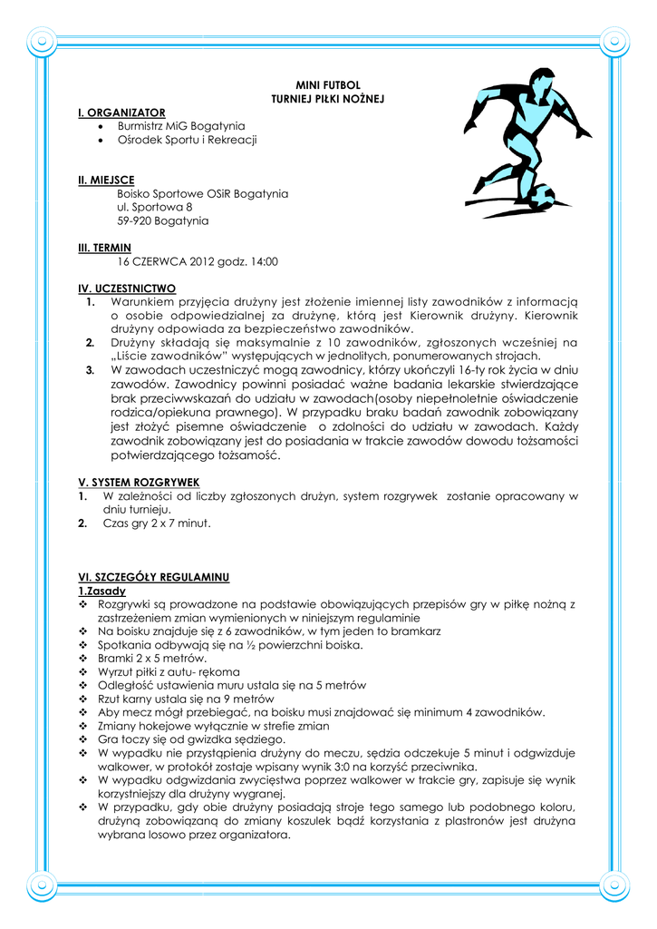 MINI FUTBOL TURNIEJ PIŁKI NOŻNEJ I. ORGANIZATOR Burmistrz MiG Bogatynia Ośrodek Sportu i Rekreacji II. MIEJSCE Boisko Sportowe OSiR Bogatynia ul. Sportowa 8 59-920 Bogatynia III. TERMIN 16 CZERWCA 2012 godz. 14:00 IV. UCZESTNICTWO 1. Warunkiem przyjęcia drużyny jest złożenie imiennej listy zawodników z informacją o osobie odpowiedzialnej za drużynę, którą jest Kierownik drużyny. Kierownik drużyny odpowiada za bezpieczeństwo zawodników. 2. Drużyny składają się maksymalnie z 10 zawodników, zgłoszonych wcześniej na „Liście zawodników” występujących w jednolitych, ponumerowanych strojach. 3. W zawodach uczestniczyć mogą zawodnicy, którzy ukończyli 16-ty rok życia w dniu zawodów. Zawodnicy powinni posiadać ważne badania lekarskie stwierdzające brak przeciwwskazań do udziału w zawodach(osoby niepełnoletnie oświadczenie rodzica/opiekuna prawnego). W przypadku braku badań zawodnik zobowiązany jest złożyć pisemne oświadczenie o zdolności do udziału w zawodach. Każdy zawodnik zobowiązany jest do posiadania w trakcie zawodów dowodu tożsamości potwierdzającego tożsamość. V. SYSTEM ROZGRYWEK 1. W zależności od liczby zgłoszonych drużyn, system rozgrywek zostanie opracowany w dniu turnieju. 2. Czas gry 2 x 7 minut. VI. SZCZEGÓŁY REGULAMINU 1.Zasady Rozgrywki są prowadzone na podstawie obowiązujących przepisów gry w piłkę nożną z zastrzeżeniem zmian wymienionych w niniejszym regulaminie Na boisku znajduje się z 6 zawodników, w tym jeden to bramkarz Spotkania odbywają się na ½ powierzchni boiska. Bramki 2 x 5 metrów. Wyrzut piłki z autu- rękoma Odległość ustawienia muru ustala się na 5 metrów Rzut karny ustala się na 9 metrów Aby mecz mógł przebiegać, na boisku musi znajdować się minimum 4 zawodników. Zmiany hokejowe wyłącznie w strefie zmian Gra toczy się od gwizdka sędziego. W wypadku nie przystąpienia drużyny do meczu, sędzia odczekuje 5 minut i odgwizduje walkower, w protokół zostaje wpisany wynik 3:0 na korzyść przeciwnika. W wypadku odgwizdania zwycięstwa poprzez walkower w trakcie gry, zapisuje się wynik korzystniejszy dla drużyny wygranej. W przypadku, gdy obie drużyny posiadają stroje tego samego lub podobnego koloru, drużyną zobowiązaną do zmiany koszulek bądź korzystania z plastronów jest drużyna wybrana losowo przez organizatora. kary za przewinienia i faule w decyzji sędziów zgodnie z przepisami gry w piłkę nożną: żółta kartka dla zawodnika oznacza 2 min. kary dla zawodnika i drużyna przez 2 min. gra w osłabieniu, jeśli drużyna która gra w osłabieniu utraci w tym czasie bramkę zawodnik ukarany lub inny z drużyna wraca do gry, druga żółta kartka dla tego samego zawodnika wyklucza go z danego meczu a drużyna gra w osłabieniu 2 min. (gdy drużyna która gra w osłabieniu utraci w tym czasie bramkę wraca do gry w pełnym składzie), czerwona kartka za brutalny faul wyklucza zawodnika z meczu (drużyna gra w osłabieniu 4 min.) oraz obligatoryjnie dodatkowa kara wykluczenie z następnego meczu; w decyzji sędziego zawodów kara 1 minuty na zawodnika, który używa w trakcie meczu słów wulgarnych, drużyna w tym okresie gra w osłabieniu (gdy drużyna, która gra w osłabieniu utraci w tym czasie bramkę wraca do gry w pełnym składzie). 3. Nagrody. Dyplomy i puchary dla 3 pierwszych drużyn. Nagrody rzeczowe na miarę możliwości organizatora. 4. Postanowienia końcowe. Organizator zapewnia opiekę medyczną podczas zawodów, oraz odpowiedzialność z tytułu ubezpieczeń od nieszczęśliwych wypadków. Dla uczestników udostępnione zostanie boisko, szatnie z natryskami, piłki. W sprawach nie objętych regulaminem decyduje organizator. Organizator zastrzega sobie również prawo do zmian niniejszego regulaminu. Podczas trwania zawodów obowiązuje regulamin wewnętrzny obiektu, na którym rozgrywany jest Turniej. Organizator nie ponosi odpowiedzialności za straty materialne uczestników poniesione podczas trwania Turnieju. Drużyny zobowiązane są do przestrzegania regulaminu oraz utrzymania porządku w szatniach i na obiekcie, nie zastosowanie się do powyższego regulaminu grozi wykluczeniem z Turnieju. Szczegółowe informacje w siedzibie OSiR Bogatynia przy ul. Białogórskiej 28, bądź pod numerem telefonu 75 77 31 343 wew. 24. Ośrodek Sportu i Rekreacji, ul. Sportowa 8, 59-920 Bogatynia Tel. 75 77 31 343, email : [email protected]