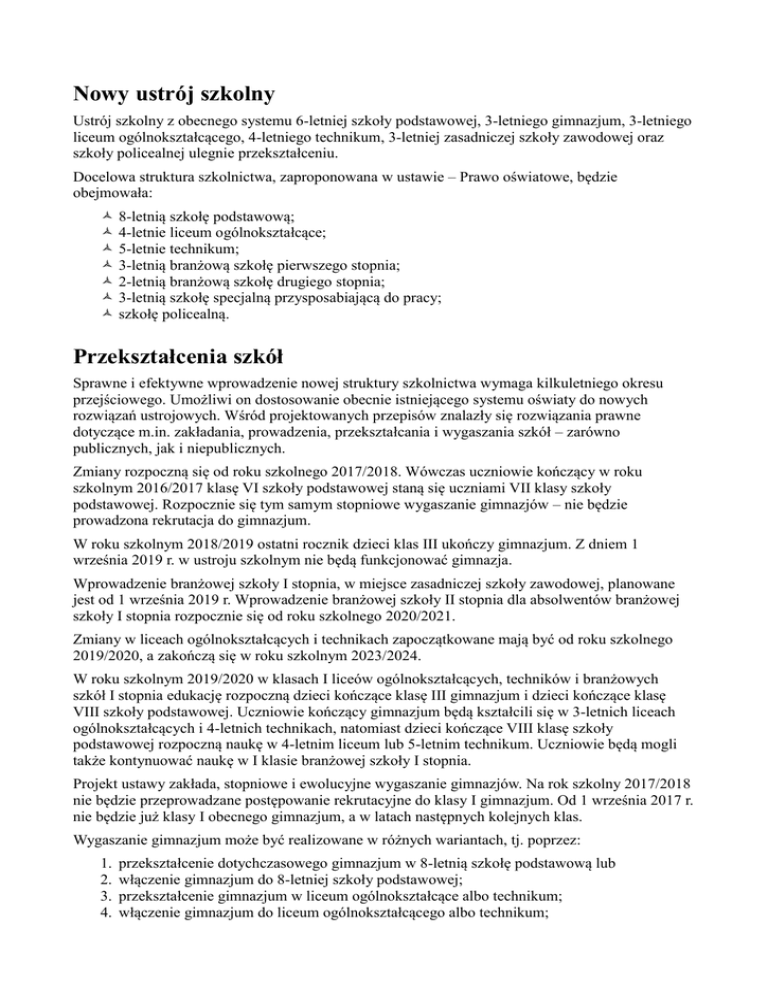 Nowy ustrój szkolny Ustrój szkolny z obecnego systemu 6-letniej szkoły podstawowej, 3-letniego gimnazjum, 3-letniego liceum ogólnokształcącego, 4-letniego technikum, 3-letniej zasadniczej szkoły zawodowej oraz szkoły policealnej ulegnie przekształceniu. Docelowa struktura szkolnictwa, zaproponowana w ustawie – Prawo oświatowe, będzie obejmowała: 8-letnią szkołę podstawową; 4-letnie liceum ogólnokształcące; 5-letnie technikum; 3-letnią branżową szkołę pierwszego stopnia; 2-letnią branżową szkołę drugiego stopnia; 3-letnią szkołę specjalną przysposabiającą do pracy; szkołę policealną. Przekształcenia szkół Sprawne i efektywne wprowadzenie nowej struktury szkolnictwa wymaga kilkuletniego okresu przejściowego. Umożliwi on dostosowanie obecnie istniejącego systemu oświaty do nowych rozwiązań ustrojowych. Wśród projektowanych przepisów znalazły się rozwiązania prawne dotyczące m.in. zakładania, prowadzenia, przekształcania i wygaszania szkół – zarówno publicznych, jak i niepublicznych. Zmiany rozpoczną się od roku szkolnego 2017/2018. Wówczas uczniowie kończący w roku szkolnym 2016/2017 klasę VI szkoły podstawowej staną się uczniami VII klasy szkoły podstawowej. Rozpocznie się tym samym stopniowe wygaszanie gimnazjów – nie będzie prowadzona rekrutacja do gimnazjum. W roku szkolnym 2018/2019 ostatni rocznik dzieci klas III ukończy gimnazjum. Z dniem 1 września 2019 r. w ustroju szkolnym nie będą funkcjonować gimnazja. Wprowadzenie branżowej szkoły I stopnia, w miejsce zasadniczej szkoły zawodowej, planowane jest od 1 września 2019 r. Wprowadzenie branżowej szkoły II stopnia dla absolwentów branżowej szkoły I stopnia rozpocznie się od roku szkolnego 2020/2021. Zmiany w liceach ogólnokształcących i technikach zapoczątkowane mają być od roku szkolnego 2019/2020, a zakończą się w roku szkolnym 2023/2024. W roku szkolnym 2019/2020 w klasach I liceów ogólnokształcących, techników i branżowych szkół I stopnia edukację rozpoczną dzieci kończące klasę III gimnazjum i dzieci kończące klasę VIII szkoły podstawowej. Uczniowie kończący gimnazjum będą kształcili się w 3-letnich liceach ogólnokształcących i 4-letnich technikach, natomiast dzieci kończące VIII klasę szkoły podstawowej rozpoczną naukę w 4-letnim liceum lub 5-letnim technikum. Uczniowie będą mogli także kontynuować naukę w I klasie branżowej szkoły I stopnia. Projekt ustawy zakłada, stopniowe i ewolucyjne wygaszanie gimnazjów. Na rok szkolny 2017/2018 nie będzie przeprowadzane postępowanie rekrutacyjne do klasy I gimnazjum. Od 1 września 2017 r. nie będzie już klasy I obecnego gimnazjum, a w latach następnych kolejnych klas. Wygaszanie gimnazjum może być realizowane w różnych wariantach, tj. poprzez: 1. 2. 3. 4. przekształcenie dotychczasowego gimnazjum w 8-letnią szkołę podstawową lub włączenie gimnazjum do 8-letniej szkoły podstawowej; przekształcenie gimnazjum w liceum ogólnokształcące albo technikum; włączenie gimnazjum do liceum ogólnokształcącego albo technikum; 5. przekształcenie gimnazjum w branżową szkołę I stopnia; 6. włączenie gimnazjum do branżowej szkoły I stopnia. Decyzja, co do formy i czasu przekształcenia gimnazjum należy do kompetencji samorządu prowadzącego gimnazjum, osoby prawnej niebędącej jednostką samorządu terytorialnego lub osoby fizycznej prowadzącej dotychczasowe publiczne lub niepubliczne gimnazjum. Projekt zaprezentowanej ustawy określa również warunki i terminy obowiązujące przy przeprowadzaniu tych zmian. Przykładowo, gdy gmina prowadząca dotychczasowe gimnazjum zadecyduje o jego przekształceniu w liceum ogólnokształcące lub o włączeniu tego gimnazjum do liceum ogólnokształcącego – konieczne będzie zawarcie porozumienia o prowadzeniu tego liceum z powiatem, dla którego prowadzenie liceum ogólnokształcącego jest zadaniem własnym. Jeśli organ prowadzący inny niż jednostka samorządu terytorialnego będzie chciał włączyć prowadzone przez siebie publiczne gimnazjum do prowadzonej przez siebie publicznej szkoły podstawowej będzie zobligowany do 31 stycznia 2017 r. złożyć stosowny wniosek do gminy, która udzieliła zezwolenia na prowadzenie tych szkół.