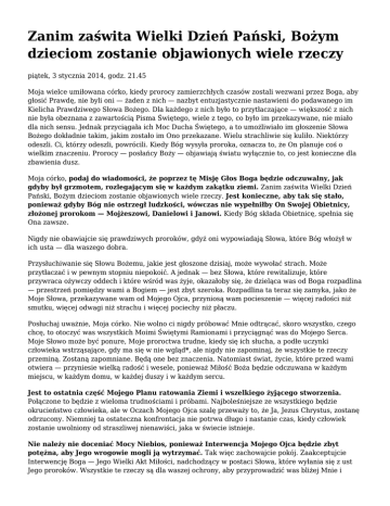 Zanim zaświta Wielki Dzień Pański, Bożym dzieciom zostanie objawionych wiele rzeczy piątek, 3 stycznia 2014, godz. 21.45 Moja wielce umiłowana córko, kiedy prorocy zamierzchłych czasów zostali wezwani przez Boga, aby głosić Prawdę, nie byli oni — żaden z nich — nazbyt entuzjastycznie nastawieni do podawanego im Kielicha Prawdziwego Słowa Bożego. Dla każdego z nich było to przytłaczające — większość z nich nie była obeznana z zawartością Pisma Świętego, wiele z tego, co było im przekazywane, nie miało dla nich sensu. Jednak przyciągała ich Moc Ducha Świętego, a to umożliwiało im głoszenie Słowa Bożego dokładnie takim, jakim zostało im Ono przekazane. Wielu strachliwie się kuliło. Niektórzy odeszli. Ci, którzy odeszli, powrócili. Kiedy Bóg wysyła proroka, oznacza to, że On planuje coś o wielkim znaczeniu. Prorocy — posłańcy Boży — objawiają światu wyłącznie to, co jest konieczne dla zbawienia dusz. Moja córko, podaj do wiadomości, że poprzez tę Misję Głos Boga będzie odczuwalny, jak gdyby był grzmotem, rozlegającym się w każdym zakątku ziemi. Zanim zaświta Wielki Dzień Pański, Bożym dzieciom zostanie objawionych wiele rzeczy. Jest konieczne, aby tak się stało, ponieważ gdyby Bóg nie ostrzegł ludzkości, wówczas nie wypełniłby On Swojej Obietnicy, złożonej prorokom — Mojżeszowi, Danielowi i Janowi. Kiedy Bóg składa Obietnicę, spełnia się Ona zawsze. Nigdy nie obawiajcie się prawdziwych proroków, gdyż oni wypowiadają Słowa, które Bóg włożył w ich usta — dla waszego dobra. Przysłuchiwanie się Słowu Bożemu, jakie jest głoszone dzisiaj, może wywołać strach. Może przytłaczać i w pewnym stopniu niepokoić. A jednak — bez Słowa, które rewitalizuje, które przywraca ożywczy oddech i które wśród was żyje, okazałoby się, że dzieląca was od Boga rozpadlina — przestrzeń pomiędzy wami a Bogiem — jest zbyt szeroka. Rozpadlina ta teraz się zamyka, jako że Moje Słowa, przekazywane wam od Mojego Ojca, przyniosą wam pocieszenie — więcej radości niż smutku, więcej odwagi niż strachu i więcej pociechy niż płaczu. Posłuchaj uważnie, Moja córko. Nie wolno ci nigdy próbować Mnie odtrącać, skoro wszystko, czego chcę, to otoczyć was wszystkich Moimi Świętymi Ramionami i przyciągnąć was do Mojego Serca. Moje Słowo może być ponure, Moje proroctwa trudne, kiedy się ich słucha, a podłe uczynki człowieka wstrząsające, gdy ma się w nie wgląd*, ale nigdy nie zapominaj, że wszystkie te rzeczy przeminą. Zostaną zapomniane. Będą one bez znaczenia. Natomiast świat, życie, które przed wami otwiera — przyniesie wielką radość i wesele, ponieważ Miłość Boża będzie odczuwana w każdym miejscu, w każdym domu, w każdej duszy i w każdym sercu. Jest to ostatnia część Mojego Planu ratowania Ziemi i wszelkiego żyjącego stworzenia. Połączone to będzie z wieloma trudnościami i próbami. Najboleśniejsze ze wszystkiego będzie okrucieństwo człowieka, ale w Oczach Mojego Ojca szalę przeważy to, że Ja, Jezus Chrystus, zostanę odrzucony. Niemniej ta ostateczna konfrontacja nie potrwa długo i nastanie czas, kiedy człowiek zostanie uwolniony od straszliwej nienawiści, jaka w świecie istnieje. Nie należy nie doceniać Mocy Niebios, ponieważ Interwencja Mojego Ojca będzie zbyt potężna, aby Jego wrogowie mogli ją wytrzymać. Tak więc zachowajcie pokój. Zaakceptujcie Interwencję Boga — Jego Wielki Akt Miłości, nadchodzący w postaci Słowa, które wyłania się z ust Jego proroków. Wszystkie te rzeczy są dla waszej ochrony, aby przyprowadzić was bliżej Mnie i ustanowić Nowy Początek, który nie ma końca. Wasz Jezus * Od tłumaczy: Wygląda na to, że Maria Bożego Miłosierdzia jest prześladowana przez swoich wrogów i, tak jak każdy autentyczny prorok, musi znosić te cierpienia. Tych czytelników, którzy są jej wdzięczni za przekazywaną nam proroczą Prawdę, prosimy o modlitwę w jej intencji oraz w intencji jej rodziny, tak jak to uczyniły pewne grupy międzynarodowe po ukazaniu się tego orędzia.