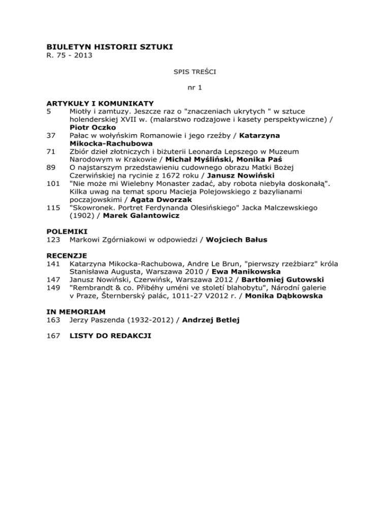 BIULETYN HISTORII SZTUKI R. 75 - 2013 SPIS TREŚCI nr 1 ARTYKUŁY I KOMUNIKATY 5 Miotły i zamtuzy. Jeszcze raz o "znaczeniach ukrytych " w sztuce holenderskiej XVII w. (malarstwo rodzajowe i kasety perspektywiczne) / Piotr Oczko 37 Pałac w wołyńskim Romanowie i jego rzeźby / Katarzyna Mikocka-Rachubowa 71 Zbiór dzieł złotniczych i biżuterii Leonarda Lepszego w Muzeum Narodowym w Krakowie / Michał Myśliński, Monika Paś 89 O najstarszym przedstawieniu cudownego obrazu Matki Bożej Czerwińskiej na rycinie z 1672 roku / Janusz Nowiński 101 "Nie może mi Wielebny Monaster zadać, aby robota niebyła doskonałą". Kilka uwag na temat sporu Macieja Polejowskiego z bazylianami poczajowskimi / Agata Dworzak 115 "Skowronek. Portret Ferdynanda Olesińskiego" Jacka Malczewskiego (1902) / Marek Galantowicz POLEMIKI 123 Markowi Zgórniakowi w odpowiedzi / Wojciech Bałus RECENZJE 141 Katarzyna Mikocka-Rachubowa, Andre Le Brun, "pierwszy rzeźbiarz" króla Stanisława Augusta, Warszawa 2010 / Ewa Manikowska 147 Janusz Nowiński, Czerwińsk, Warszawa 2012 / Bartłomiej Gutowski 149 "Rembrandt & co. Přibéhy uméni ve století blahobytu", Národní galerie v Praze, Šternberský palác, 1011-27 V2012 r. / Monika Dąbkowska IN MEMORIAM 163 Jerzy Paszenda (1932-2012) / Andrzej Betlej 167 LISTY DO REDAKCJI nr 2 ARTYKUŁY I KOMUNIKATY 175 Nurty stylowe późnogotyckich sklepień w Krakowie. Przekrycia chórów kościołów Mariackiego, Augustianów i Dominikanów / Jakub Adamski 213 Medal Clemente da Urbino z wizerunkiem Federica da Montefeltro (1422-1482) - treści symboliczne i kontekst polityczny / Agnieszka Smołucha-Sładkowska 233 Święto Sławy. Ingres zaślubinowo-koronacyjny Cecylii Renaty Habsburżanki w 1637 roku / Jacek Żukowski 295 Opowieść o Przymierzu i czasach ostatecznych. Próba analizy ikonograficznej malowideł sklepienia synagogi w Gwoźdźcu / Ewa Małkowska-Bieniek 311 Na temat malarskiej dekoracji w Łazienkowskiej Wielkiej Oranżerii / Maria Kwiatkowska 327 Obraz "Przyjęcie posłów polskich przez Dymitra Samozwańca I w Granowitoj Pałatie 3 (13) maja 1606 roku " ze zbiorów Państwowego Muzeum Historycznego w Moskwie w świetle źródeł / Ałła M. Małygina RECENZJE 341 "Złoty wiek Pomorza. Sztuka na dworze książąt pomorskich w XVI i XVII wieku" - wystawa stała w Muzeum Narodowym w Szczecinie / Jacek Kriegseisen 345 Dwa tradycjonalizmy. Refleksje na marginesie książki "Tradycjonalizm i neotradycjonalizm w sztuce XIX i XX wieku na Pomorzu", Gdańsk 2012 / Elżbieta Kal IN MEMORIAM 363 Zofia Korwin Kossakowska-Szanajca (1927-2010) / Marta Boberska nr 3 ARTYKUŁY 375 Haseki Gülnuş Sultan Camisi that is on the History of the Dominican Church in Kamianets Podilsky in the years 1672-1699 / Rafał Quirini-Popławski, Muzaffer Özgüleş 405 Problem autorstwa kościoła dworskiego w Cieszkowie oraz świątyni trynitarzy w Krotoszynie w świetle źródeł / Mirosława Sobczyńska-Szczepańska 425 O początkach mody na „delfty" na terenie Rzeczypospolitej - rezydencje Jana III Sobieskiego w Żółkwi, Jaworowie i Wilanowie / Katarzyna Przewoźna-Leśniak 437 Mokotów - ogród krajobrazowy Izabelli Lubomirskiej dedykowany Jean-Jacques Rousseau / Jolanta Polanowska 487 Tadeusz Rychter - nowe fakty z życia artysty / Jolanta Różalska 505 Materialna historiografia sztuki. Wokół książki Galerja Stanisława Augusta Tadeusza Mańkowskiego / Ewa Manikowska RECENZJE 539 Kritische Bemerkungen zur Ausstellung Europa Jagellonica 1386-1572. Kunst und Kultur Mitteleuropas unter der Herrschaft der Jagiellonen, Kutná Hora - Warschau - Potsdam, 2012-2013 / Krzysztof j. Czyżewski, Wojciech Walanus, Marek Walczak 555 Granice srebrnych przestrzeni... Polska biżuteria II połowy XX wieku, 8 V - 12 VI 2011 - Muzeum Miedzi w Legnicy; 21 III - 20 V 2012 Muzeum Bursztynu w Gdańsku; 14 X 2012 - 31 V 2013 - Muzeum Złotnictwa w Kazimierzu Dolnym / Ewa Letkiewicz 563 Holenderskie flizy - embarras de richesse. Jan Pluis, De Nederlandse tegel, decors en benamingen 1570-1930. The Dutch Tile, Designs and Names 1570-1930 (met medeverking van/ with the assistance of Daniël Hanekuijk, Piet Bolwerk, Jan van Loo),Leiden2013 / Piotr Oczko 569 Irena Rolska, Antiquum documentum et novo cedat ritui. Sztuka po Trydencie w archidiakonacie lubelskim w XVII wieku, Lublin 2013 / Marcin Zgliński 581 Komentarz przedmiotem komentarza. O aurze koncepcji Georgesa Didi-Hubermana / Miłosz Słota IN MEMORIAM 591 Mieczysław Porębski (1921-2012) / Krystyna Czerni KRONIKA NAUKOWA 611 5. sesja naukowa z cyklu Polskie Art Déco - Rzeźba i płaskorzeźba, Muzeum Mazowieckie w Płocku 22-23 IV 2013 / Mariola Kwiatkowska 615 LISTY DO REDAKCJI nr 4 ARTYKUŁY 625 Kogo upamiętnia gotycki nagrobek biskupa w Chełmnie? / Tadeusz Jurkowlaniec 641 Sarkofag Stefana Batorego i jego wzory graficzne, czyli Res gestae regi Stephani / Katarzyna Kolendo-Korczak 671 O pochówkach serc Michała Korybuta Wiśniowieckiego i Klary Izabelli de Mailly-Lascaris Pacowej oraz o nekropoli Paców w Pożajściu / Anna Sylwia Czyż 697 Uwagi na temat pierwowzorów dzieł Szymona Czechowicza i malarzy jego kręgu / Zbigniew Michalczyk 775 Z dziejów kariery malarza nadwornego / Aleksandra Bernatowicz, Mateusz Tokarski 793 Z dziejów kościoła bernardynów w Witebsku / Wojciech Boberski RECENZJE 841 Polskie życie artystyczne w latach 1944-1960, t. 1: Lata 1944-1947; t. 2:Rok 1948; t. 3: Rok 1949; t. 4: Rok 1950, Warszawa2012 / Lechosław Lameński 847 Anna Oleńska, Jan Klemens Branicki. "Sarmata nowoczesny ". Kreowanie wizerunku poprzez sztukę. Warszawa 2011 / Karol Łopatecki, Wojciech Walczak 851 Paradoksy szczególnego autowizerunku / Anna Lewicka-Morawska 854 Katarzyna Chrudzimska-Uhera, Stylizacje i modernizacje. O rzeźbie i rzeźbiarzach w Zakopanem w latach 1879-1939, Warszawa 2013 / Anna Kostrzyńska-Miłosz 859 Nowe oblicze Łodzi. Joanna Olenderek, Łódzki modernizm i inne nurty przedwojennego budownictwa, t. 1. Obi