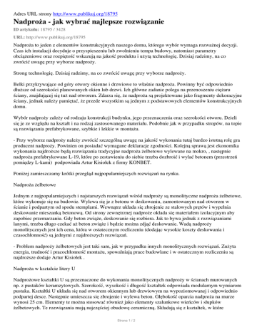 Adres URL strony http://www.publikuj.org/18795 Nadproża - jak wybrać najlepsze rozwiązanie ID artykułu: 18795 / 3428 URL: http://www.publikuj.org/18795 Nadproża to jeden z elementów konstrukcyjnych naszego domu, którego wybór wymaga rozważnej decyzji. Czas ich instalacji decyduje o przyspieszeniu lub zwolnieniu tempa budowy, natomiast parametry obciążeniowe oraz rozpiętość wskazują na jakość produktu i użytą technologię. Dzisiaj radzimy, na co zwrócić uwagę przy wyborze nadproży. Strong technologię. Dzisiaj radzimy, na co zwrócić uwagę przy wyborze nadproży. Belki przykrywające od góry otwory okienne i drzwiowe to właśnie nadproża. Powinny być odpowiednio dłuższe od szerokości planowanych okien lub drzwi. Ich główne zadanie polega na przenoszeniu ciężaru ściany, znajdującej się tuż nad otworem. Zdarza się, że nadproża są projektowane jako fragmenty dekoracyjne ściany, jednak należy pamiętać, że przede wszystkim są jednym z podstawowych elementów konstrukcyjnych domu. Wybór nadproży zależy od rodzaju konstrukcji budynku, jego przeznaczenia oraz szerokości otworu. Dzieli się je ze względu na kształt i na rodzaj zastosowanego materiału. Podobnie jak w przypadku stropów, na topie są rozwiązania prefabrykowane, szybkie i lekkie w montażu. - Przy wyborze nadproży należy zwrócić szczególną uwagę na jakość wykonania tutaj bardzo istotną rolę gra producent nadproży. Powinien on posiadać wymagane deklaracje zgodności. Kolejną sprawą jest ekonomika wykonania najdroższe będą rozwiązania tradycyjne nadproża żelbetowe wylewane na mokro, , następnie nadproża prefabrykowane L-19, które po zestawieniu do siebie trzeba dozbroić i wylać betonem (przestrzeń pomiędzy L-kami) podpowiada Artur Kisiołek z firmy KONBET. Poniżej zamieszczamy krótki przegląd najpopularniejszych rozwiązań na rynku. Nadproża żelbetowe Jednym z najpopularniejszych i najstarszych rozwiązań wśród nadproży są monolityczne nadproża żelbetowe, które wykonuje się na budowie. Wylewa się je z betonu w deskowaniu, zamontowanym nad otworem w ścianie i podpartym od spodu stemplami. Wewnątrz układa się zbrojenie ze stalowych prętów i wypełnia deskowanie mieszanką betonową. Od strony zewnętrznej nadproże okłada się materiałem izolacyjnym aby zapobiec przemarzaniu. Gdy beton zwiąże, deskowanie się rozbiera. Jak to bywa jednak z rozwiązaniami lanymi, trzeba długo czekać aż beton zwiąże i będzie można zdjąć deskowanie. Wadą nadproży monolitycznych jest ich cena, która w ostatecznym rozliczeniu (dodając wysokie koszty deskowania i czasochłonność) są jednymi z najdroższych rozwiązań. - Problem nadproży żelbetowych jest taki sam, jak w przypadku innych monolitycznych rozwiązań. Zużyta energia, trudność i pracochłonność montażu, spowalniają prace budowlane i w ostatecznym rozliczeniu są najdroższe dodaje Artur Kisiołek . Nadproża w kształcie litery U Nadprożowe kształtki U są przeznaczone do wykonania monolitycznych nadproży w ścianach murowanych np. z pustaków keramzytowych. Szerokość, wysokość i długość kształtek odpowiada modularnym wymiarom pustaka. Kształtki U układa się nad otworem okiennym lub drzwiowym na wypoziomowanej i odpowiednio podpartej desce. Następnie umieszcza się zbrojenie i wylewa beton. Głębokość oparcia nadproża na murze wynosi 25 cm. Elementy te można stosować również jako elementy szalunkowe wieńców i słupków żelbetowych. Te rozwiązania mają najczęściej obudowę ceramiczną. Składają się z kształtek, w które Strona 1 / 2 wypełnia się betonem i zbrojeniem. Kształtki dopasowane są do grubości muru. Dostępne są w długości od 1 do 3 metrów. Nadproża prefabrykowane L-19 Nadproża wykonywane z belek o przekroju L w porównaniu do nadproży wylewanych na mokro ułatwiają i przyspieszają budowę. Mogą być stosowane przy budowie ścian z różnych materiałów. Ich długość waha się od 90 cm do trzech, maksymalnie 3,6 metrów. Montaż nadproży tego typu jest nieskomplikowany. Wystarczy ustawić belki obok siebie, spiąć klamrami, aby nie zmieniły położenia, a potem w powstałe przestrzenie wpuszcza się od góry beton. Na czas zawiązania betonu konieczne jest przerwanie prac. Belki mają oznaczenia ułatwiające ich dobranie: te z symbolem N nadają się do nadproży obciążonych od góry stropem, belki S - do nadproży nieobciążonych stropem, a belki D - do ścian działowych (tzw. belki drzwiowe). Nadproża strunobetonowe Istnieją rozwiązania, które mogą być stosowane niezależnie od miejsca i typu obciążenia. Dobrym przykładem tego typu są nadproża strunobetonowe KONBET SBN . Nadproża strunobetonowe KONBET SBN oferowane są w dwóch wymiarach - o wysokości 72 mm i szerokości 115 mm oraz o wysokości 120 mm i szerokości 115 mm. Są lżejsze od tradycyjnych nadproży o kształcie L. Ich rozpiętość sięga do 4,2 m, co eliminuje konieczność wylewania długich belek na mokro. Cechują się łatwością montażu oraz wysoką funkcjonalnością, można je stosować w przesklepieniach otworów drzwiowych w ściankach działowych, w bramach garażowych i wielu innych miejscach bez konieczności dodatkowej pracy. - Nadproża strunobetonowe KONBET SBN, wystarczy ułożyć obok siebie i można murować dalej. Dla inwestorów ważna może okazać się możliwość montowania kaset z roletami bez obawy o zmniejszenie powierzchni przeszklenia. Warto jeszcze wspomnieć o niezwykłej rozpiętości nadproży strunobetonowych KONBET SBN, sięga ona do 4,2 m przy czym najdłuższe nadproża L-19 mają tylko 3,6 m rozpiętości. Ta cecha ma szczególne znaczenie w montażu np. bram garażowych.- podsumowuje Artur Kisiołek. Powszechnie wiadomo, że oszczędność na elementach konstrukcyjnych, takich jak stropy, fundamenty i nadproża jest zwodnicza. Warto natomiast poszukać rozwiązań, które skró